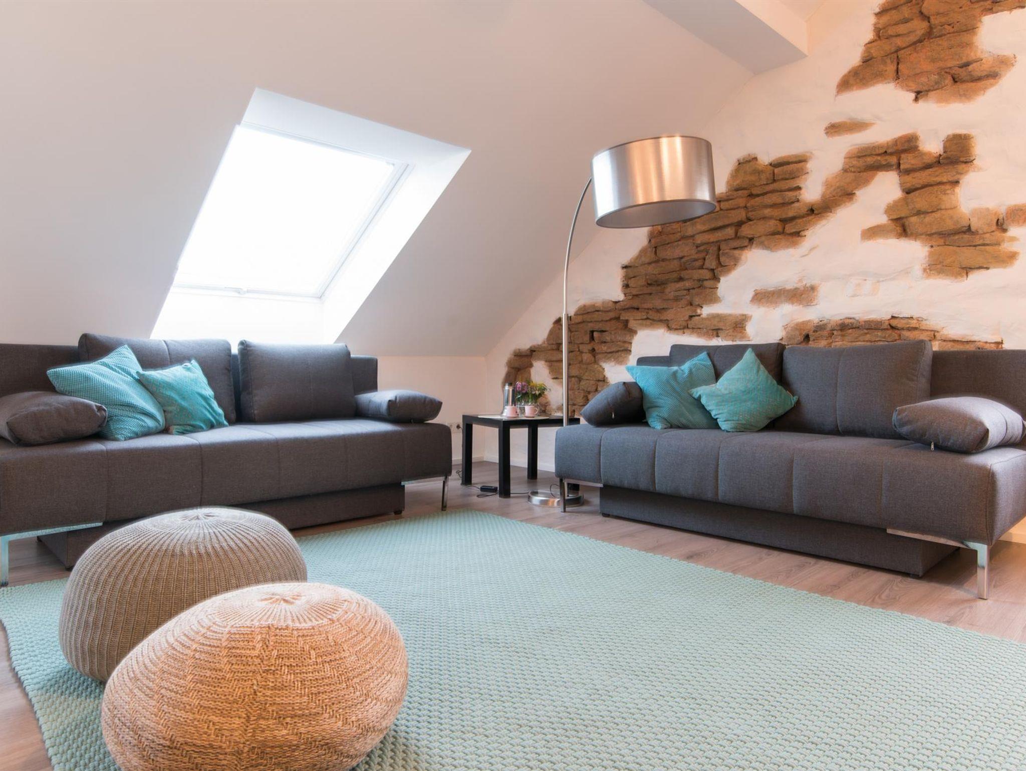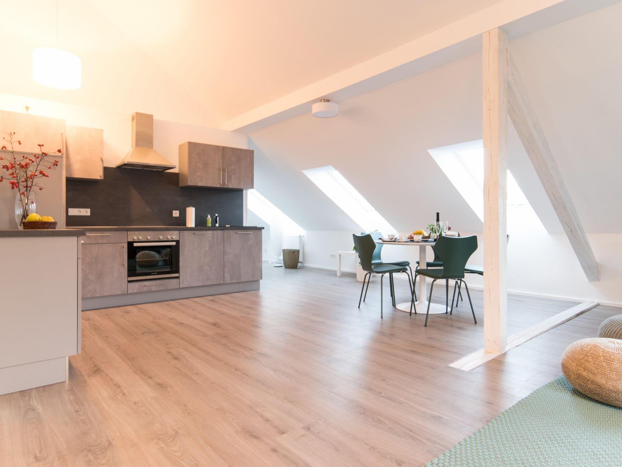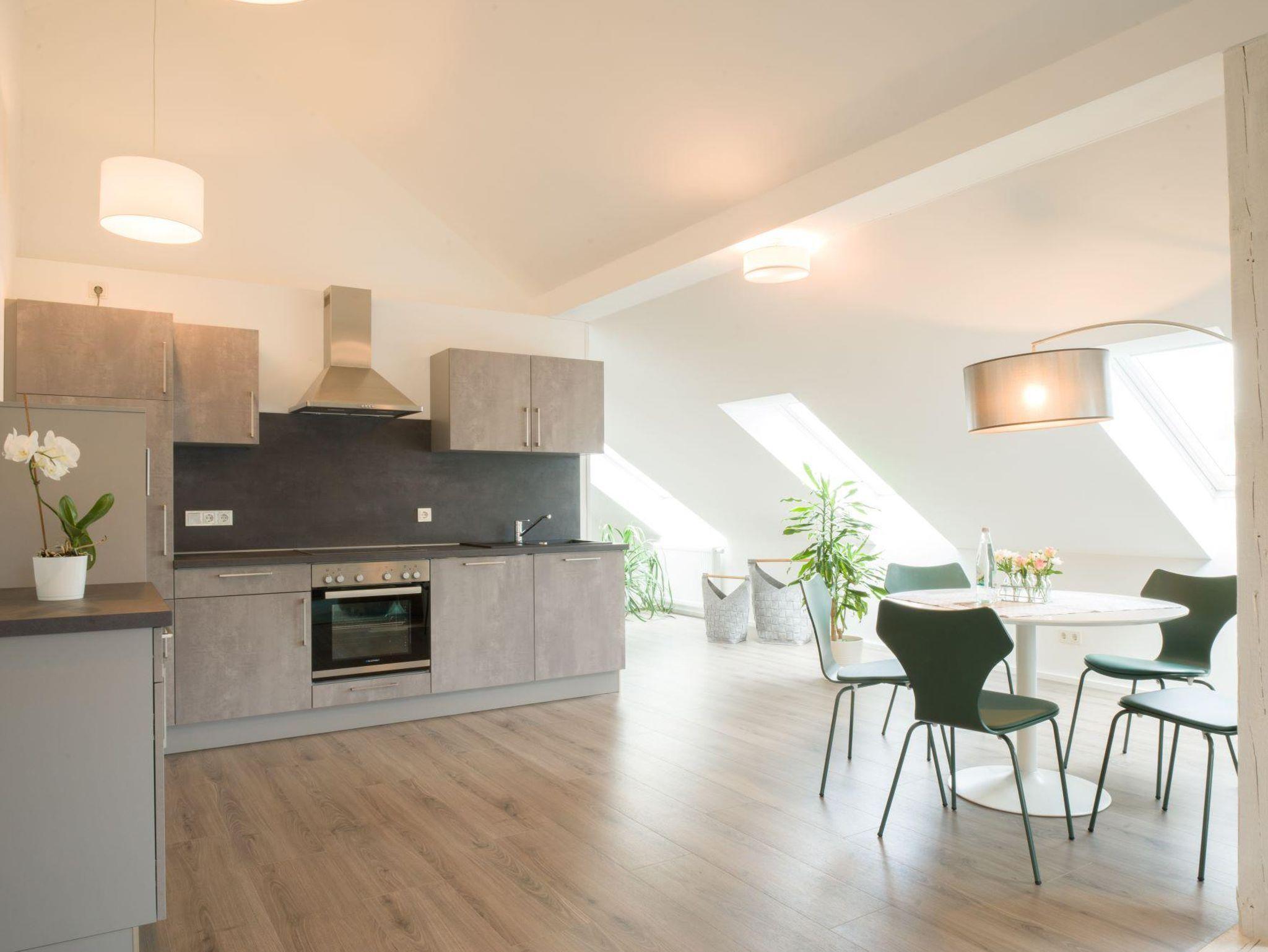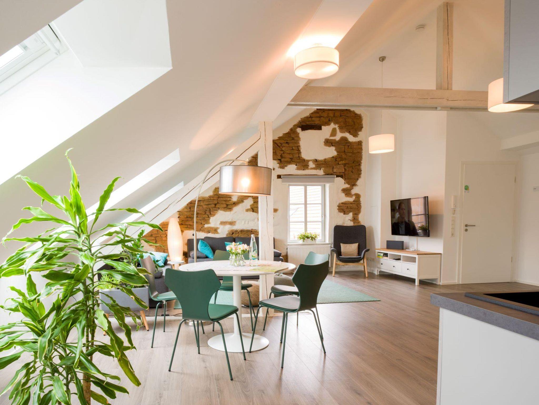 Unser Bücherloft ist eine neurenovierte und neumöbilierte schöne helle und freundliche Dachwohnung. Es ist die gesamte Fläche unseres Hauses mit offener Dachspitze. Alle Fenster der Wohnung sind verdunkelbar. Ein Schlafzimmer mit Doppelbett, Sitzecke und Schrank, Platz für Babyreisebett. Das große Wohnzimmer ist mit zwei Schlafcouchen (1,40 x 2,00 Meter) ausgestattet und WLAN, LAN, TV (55 Zoll Bildschirm), Bluetooth Audiosystem. Einbauküche mit Essecke, Leseecke mit Schreibtisch, Badezimmer mit Dusche/WC. Auch ein kleiner Abstellraum ist vorhanden.
