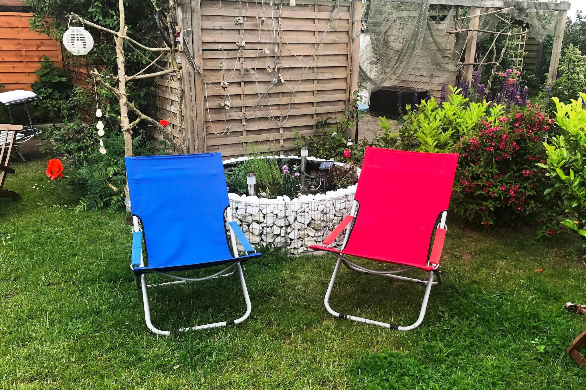 På 1. etage: (åbent køkken(spisebord(2 personer), kogeplade(Komfur med to kogeplader, glaskeramisk), elkedel, brødrister, kaffemaskine, opvaskemaskine , køleskab(+ fryser)), stue / spisestue(Fjernsyn(parabol), DVD-afspiller, CD-afspiller), soveværelse(enkeltsovesofa(90 x 200 cm), dobbeltseng(boxmadras, 180 x 200 cm)), badeværelse(bruser, håndvask, toilet), Repos, balkon, varme) have, havemøbler, grill, parkering, parkering, Parasol, Håndklæder/sengelinned (ekstra gebyr)