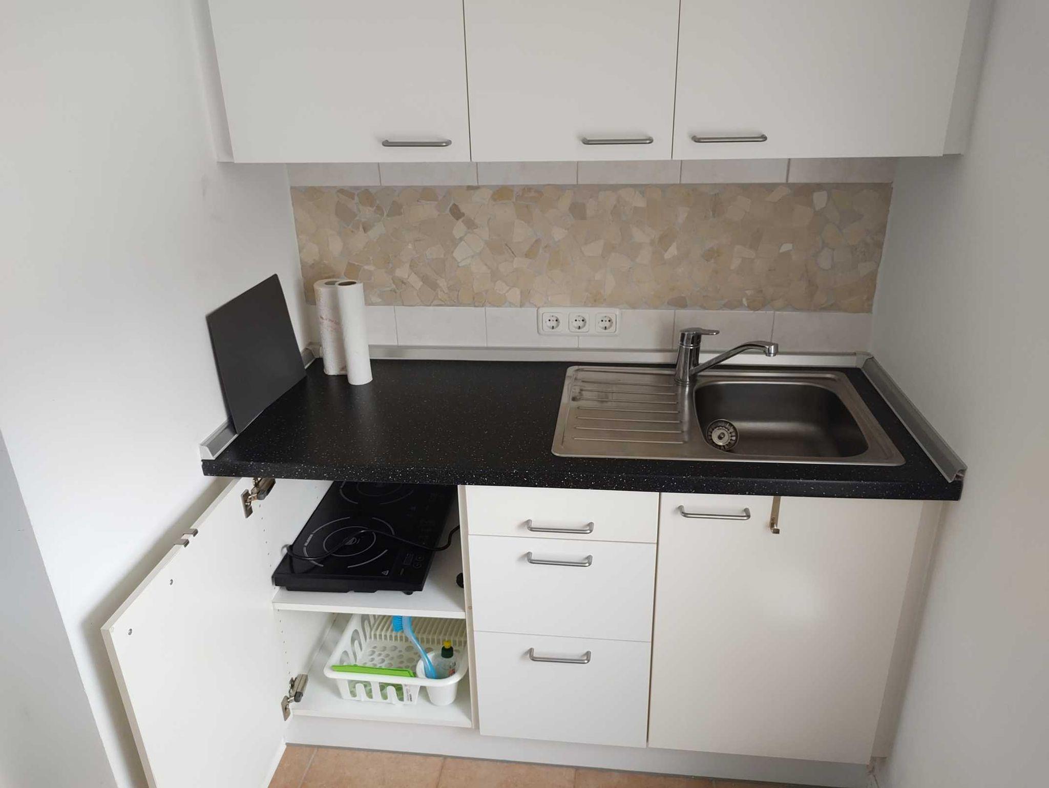 Küchenzeile mit Kühlschrank, Doppel-Kochplatte, Kaffeemaschine, Wasserkocher & Toaster sowie einem Essplatz für 3 Personen.