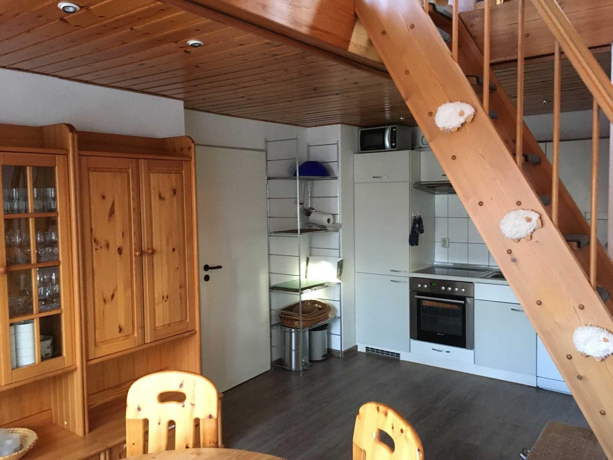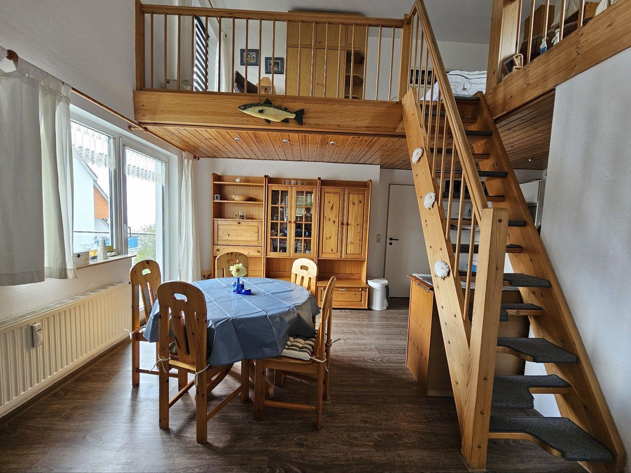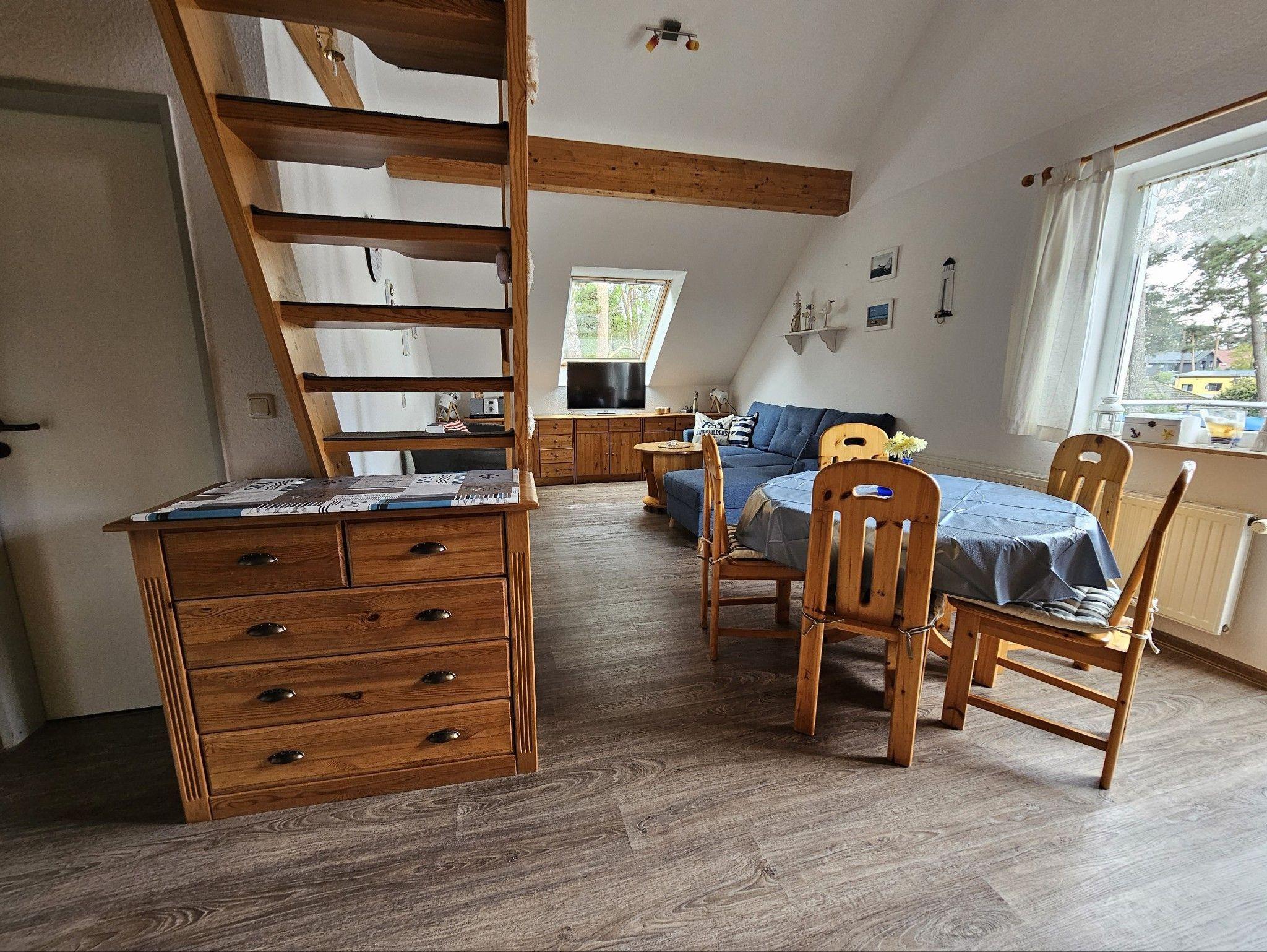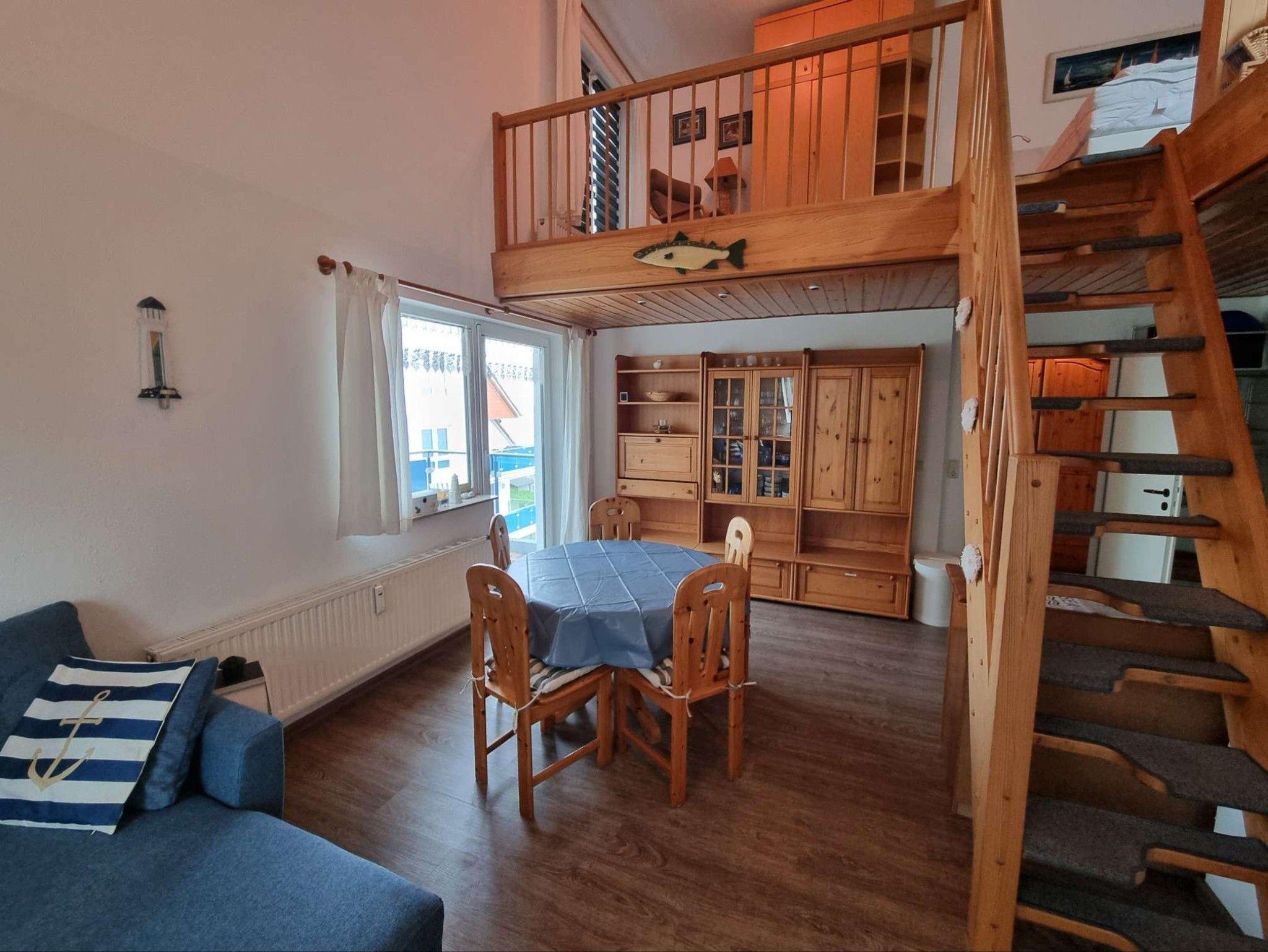 Die im zweiten Obergeschoss an der Nord- und Westseite des Hauses gelegene 64 qm große Wohnung Nr. 24 verfügt über einen geräumigen Wohnraum mit Sitzgruppe, Essplatz für bis zu 5 Personen und einer Küchenzeile (Herd mit Backofen und Ceranfeld, Mikrowelle, Kühlschrank, Geschirrspüler, Kaffeemaschine, Toaster), Bad/WC mit Badewanne, zwei Schlafzimmer ( 1 davon als Maisonette offen mit steiler Treppe ins Obergeschoss ).