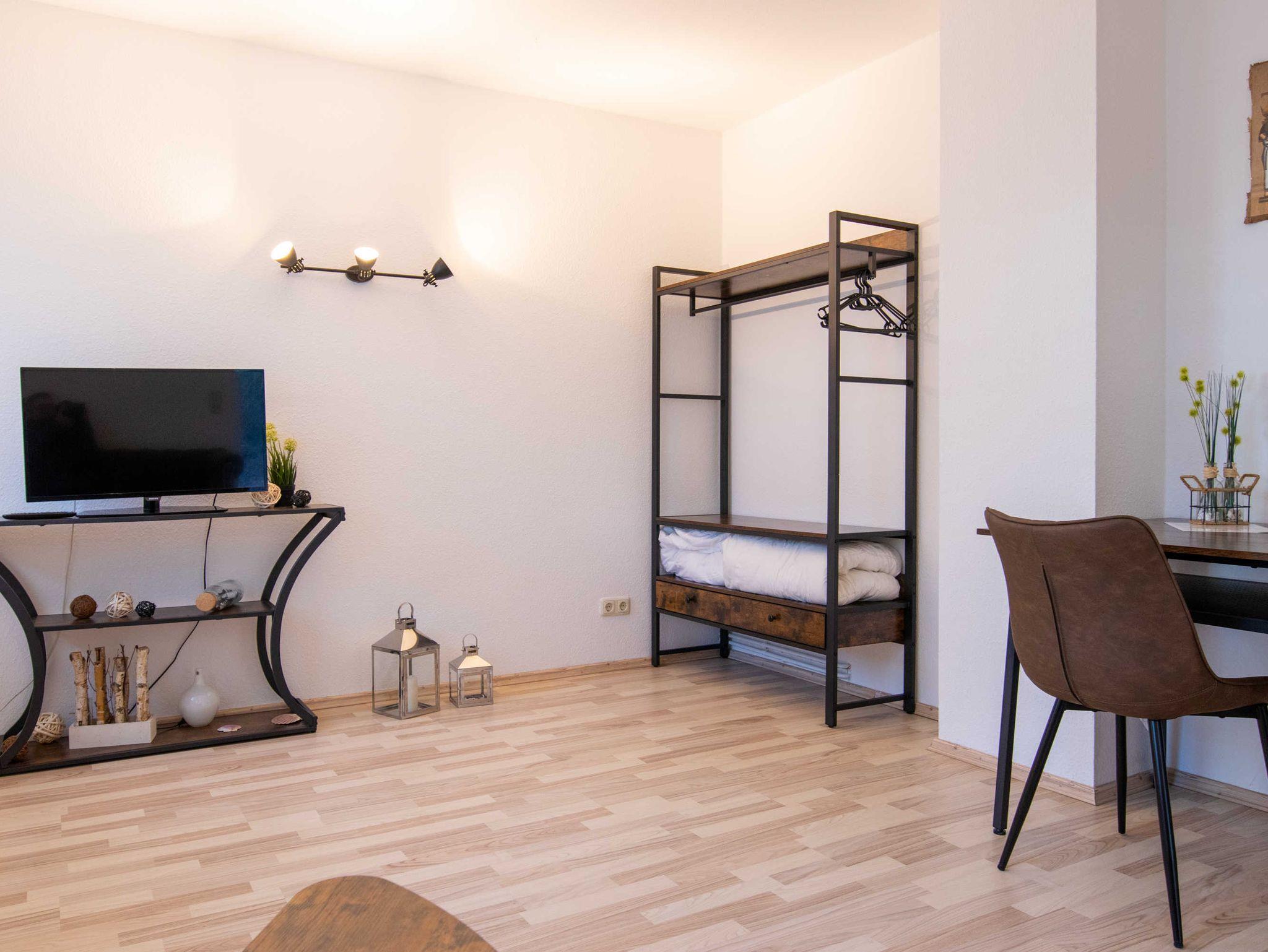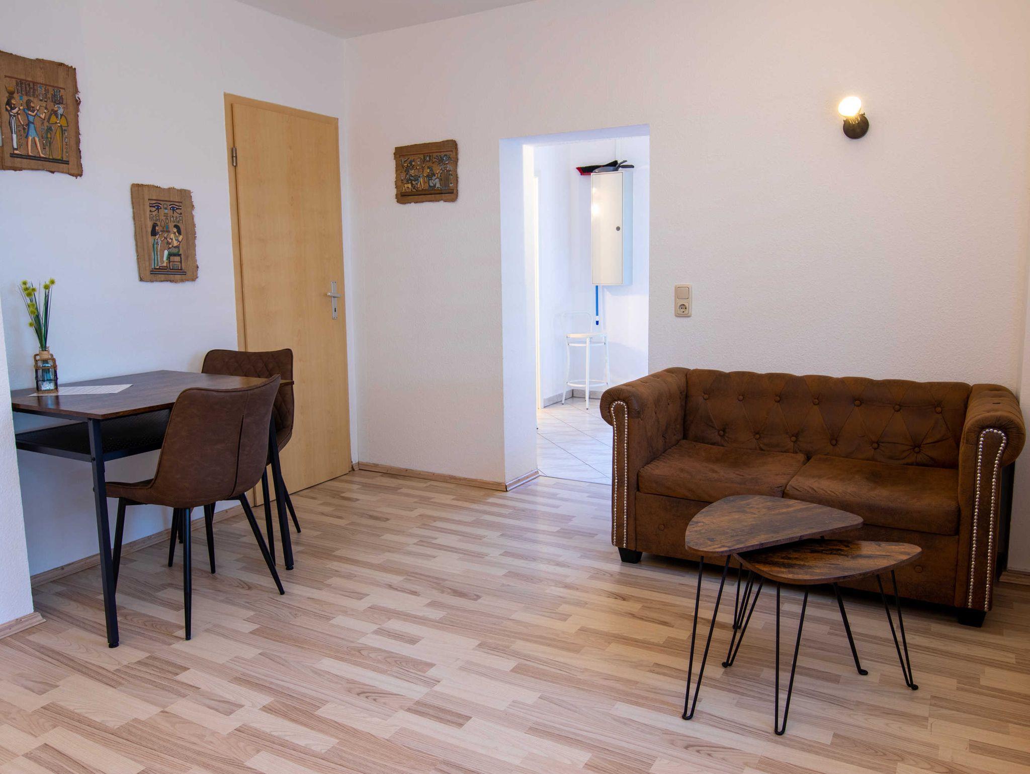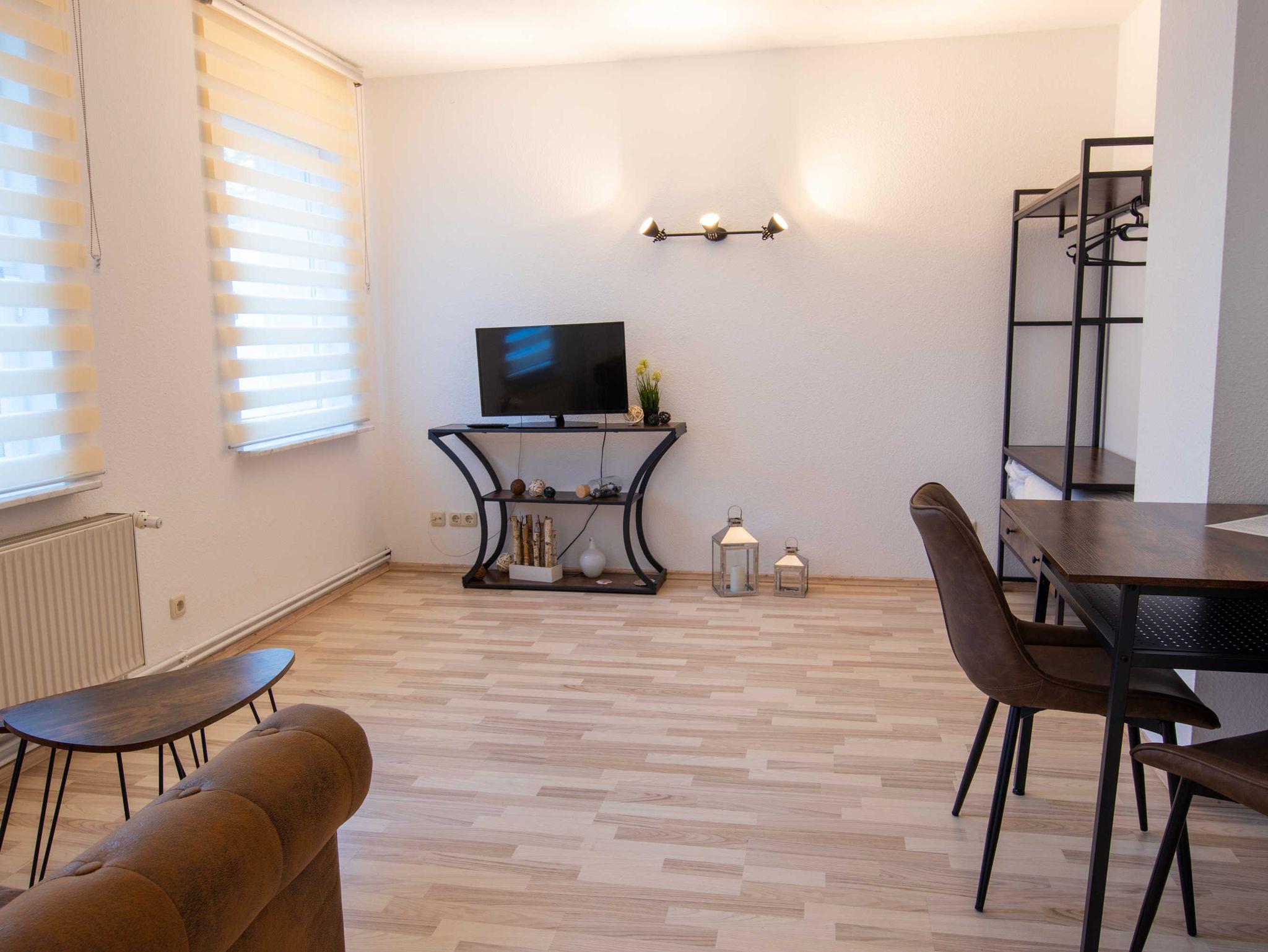 Das Wohnzimmer ist mit einer modernen Schlafcouch (Aufbettung für 2 Personen), TV, einem Esstisch und einer Küchenzeile mit Backofen und Kühlschrank eingerichtet. Im Schlafzimmer befindet sich ein gemütliches Doppelbett mit Kleiderschrank. Das freundliche Tageslichtbad hat eine Badewanne und ein WC. Zum Entspannen und Sonne tanken lädt die Terrasse direkt vor der Wohnung ein.