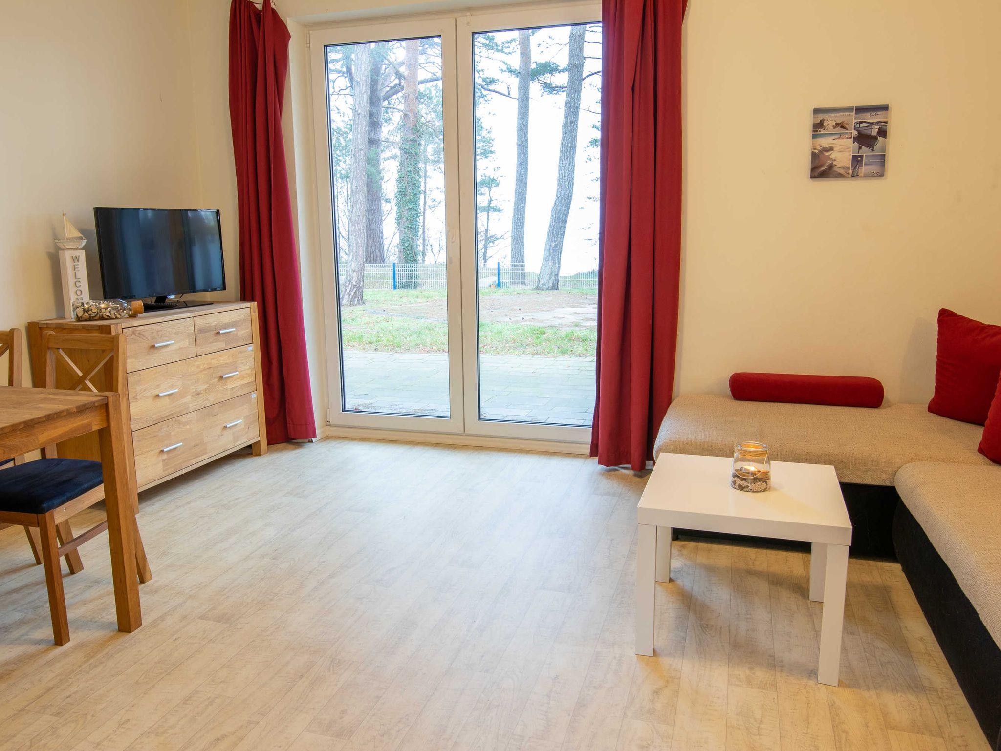 Das Wohnzimmer ist gemütlich eingerichtet mit einer Schlafcouch (Aufbettung für 2 Personen), TV, einem Esstisch und einer Küchenzeile mit Kühlschrank, Mikrowelle, 2 Herdplatten, Kaffeemaschine und Wasserkocher. Im ersten Schlafzimmer befindet sich ein gemütliches Doppelbett mit Kleiderschrank. Das zweite Schlafzimmer beherbergt zwei Einzelbetten und einen Kleiderschrank. Das freundliche Tageslichtbad hat eine geräumige Dusche und ein WC. Zum Entspannen und Sonne tanken lädt die Terrasse ein. Sie ist vom Wohnzimmer aus begehbar. Die gesamte Ferienwohnung ist mit einer Fußbodenheizung ausgestattet.