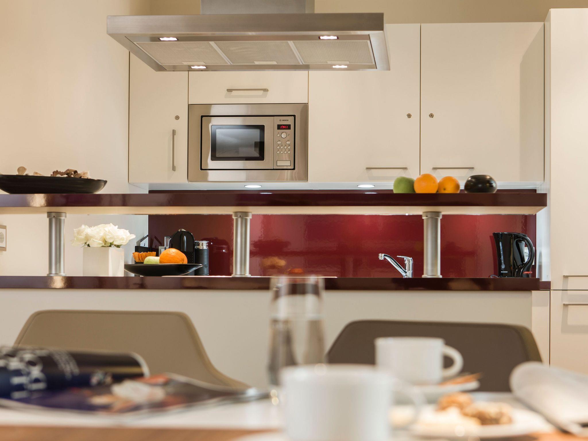 Hier finden Sie eine voll eingerichtete Küche die Ihren Aufenthalt zu einem wahren Erlebnis werden lässt. Genießen Sie den Morgen bei einem frisch zubereiten Frühstück im kleinen Essbereich oder auf dem kleinen Sitzbalkon der sich direkt an die Küche anschließt. Aber auch für ein vollendetes Dinner zu Zweit bietet die Küche ausreichend Platz.