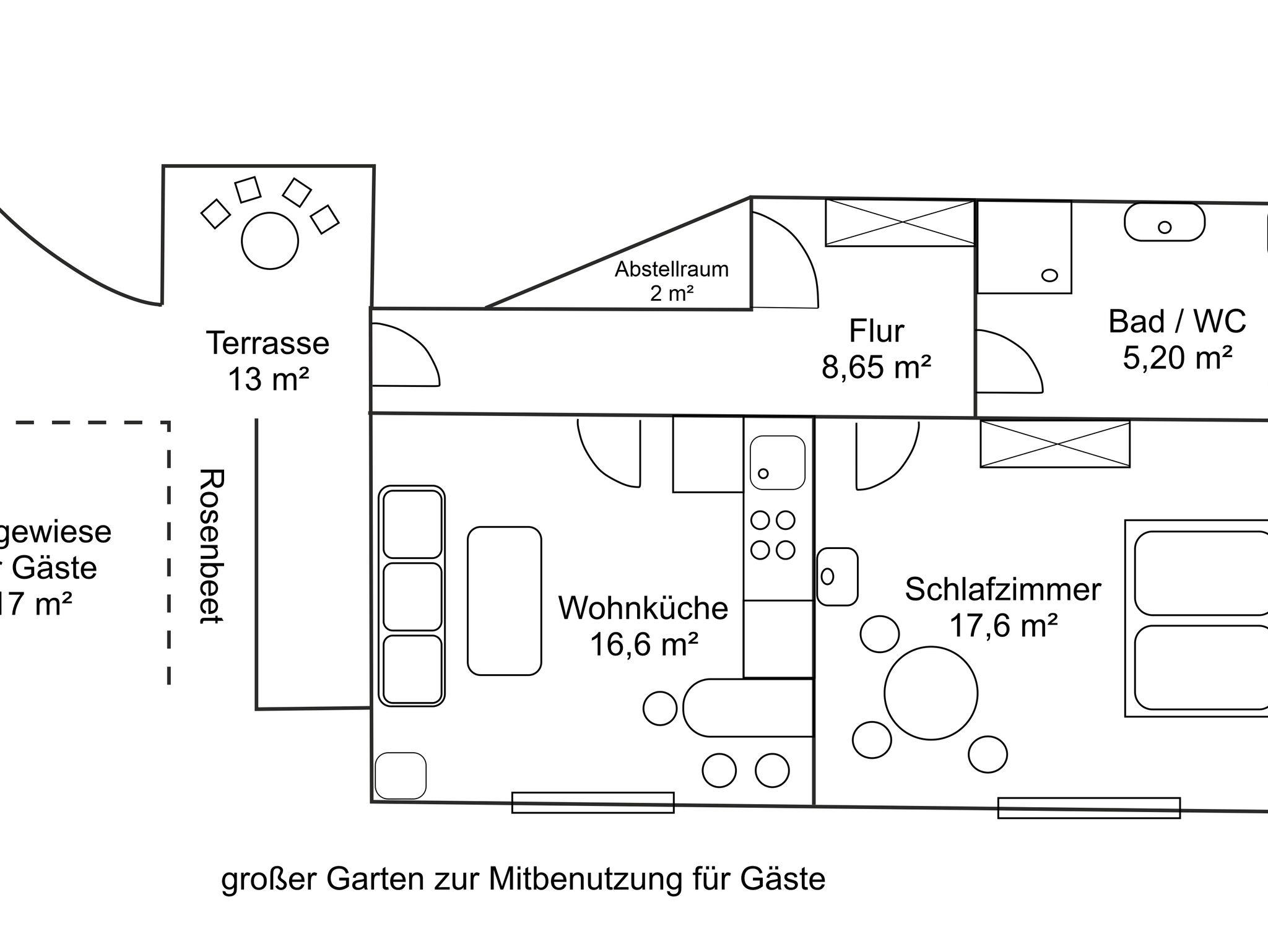Gehen Sie durch den Garten hinunter zu unserer 35qm großen, mit Schallschutzfenstern ausgestatteten FEWO. Hier lädt eine Sitzecke für den Nachmittagskaffee unter blühenden Rosen ein. Ein Highlight ist die Lage unseres Hauses, nicht nur für Eisenbahnfans! Die FEWO ist gemütlich eingerichtet und ideal zum Entspannen. Und dazu: Mittendrinn und doch ganz nah am Wald und Wiese wo man die schöne Natur genießen kann! Zur Begrüßung erwartet Sie ein Willkommensdrink. Eine Infomappe für einen entspannten Urlaub, mit Tipps für Unternehmungen liegt für Sie bereit.