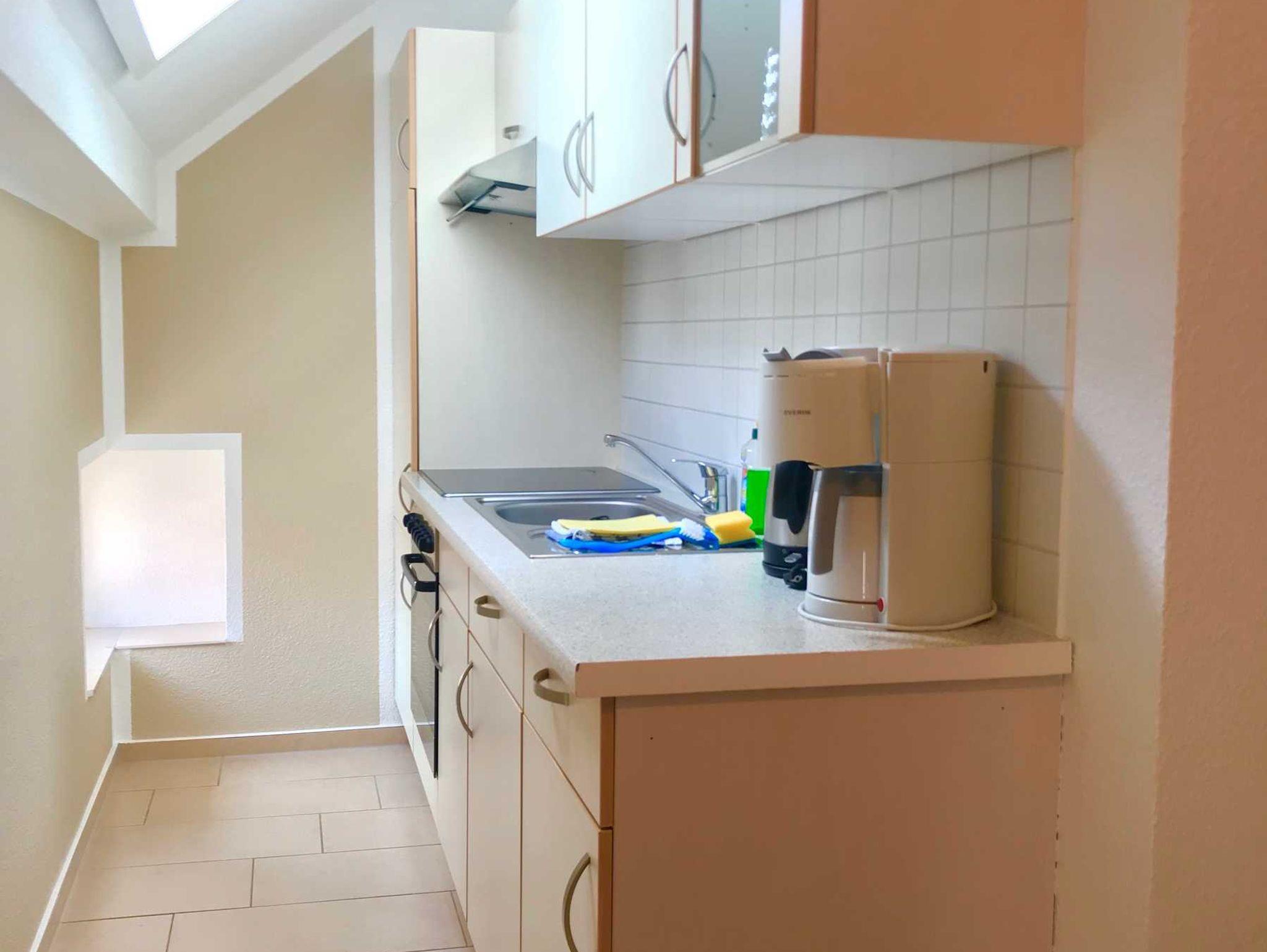 • Küche ist komplett ausgestattet: Elektroherd/Backofen, Ceran-Kochfeld, Kühlschrank, Mikrowelle, Kaffeemaschine, Wasserkocher, Toaster und weiterem umfangreichen Kücheninterieur