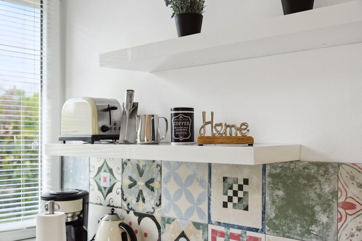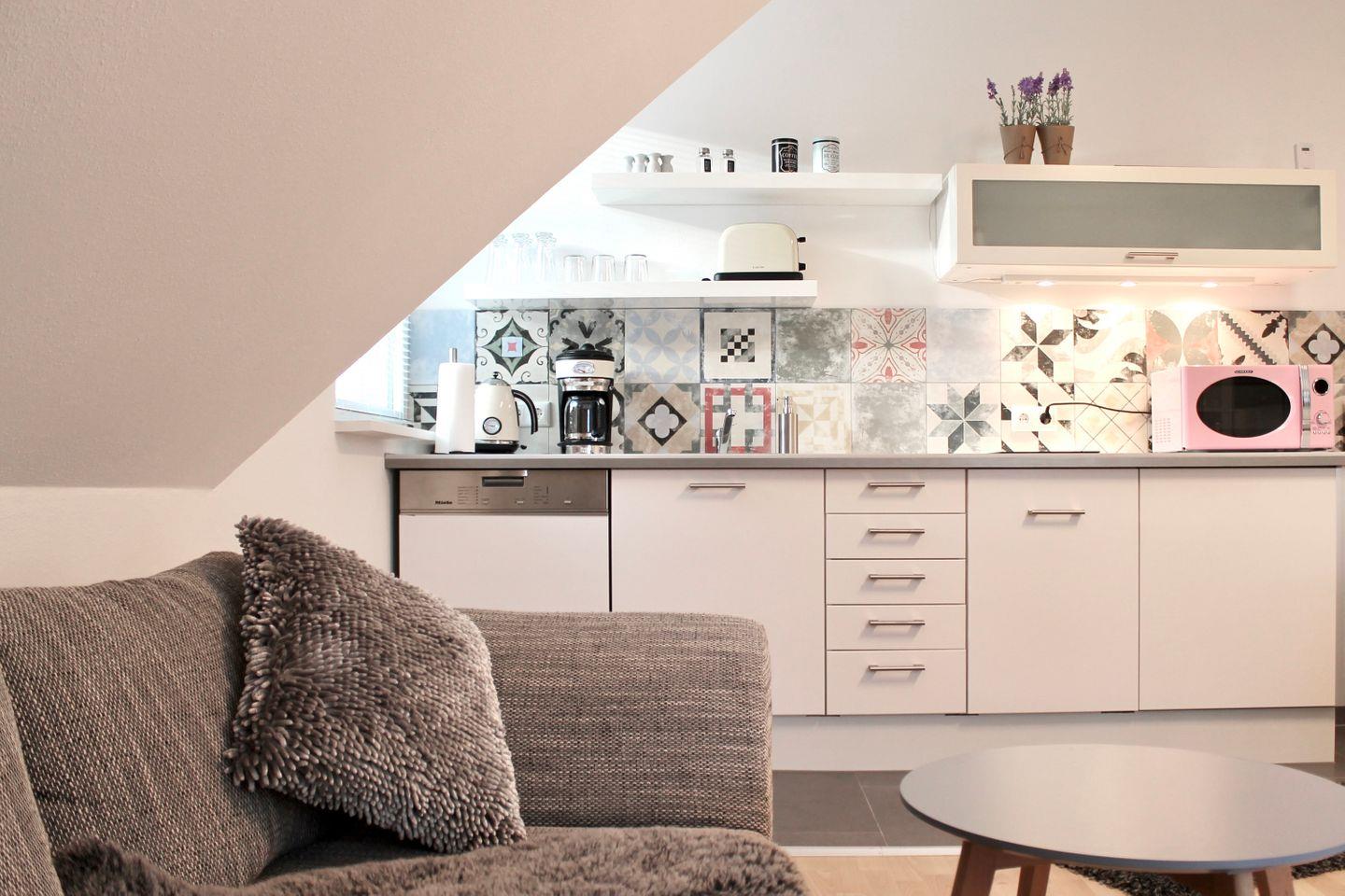 Die offene Küche, die harmonisch zum Wohnbereich gestaltet ist, ist mit modernen Geräten ausgestattet. Ein Cerankochfeld , ein Kühlschrank mit Gefrierfach sowie eine Spülmaschine sorgen dafür, dass das Kochen und Aufräumen zum Vergnügen wird. Hochwertige Küchenutensilien und Geschirr stehen bereit, um die Essenszubereitung zu erleichtern. Der Essbereich lädt zu gemeinsamen Mahlzeiten ein, während die Sofaecke einen komfortablen Ort zum Entspannen und Verweilen bietet. Ein Fernseher mit einer Größe von 42 Zoll und eine Mini-HiFi-Anlage sorgen zudem für gute Unterhaltung.