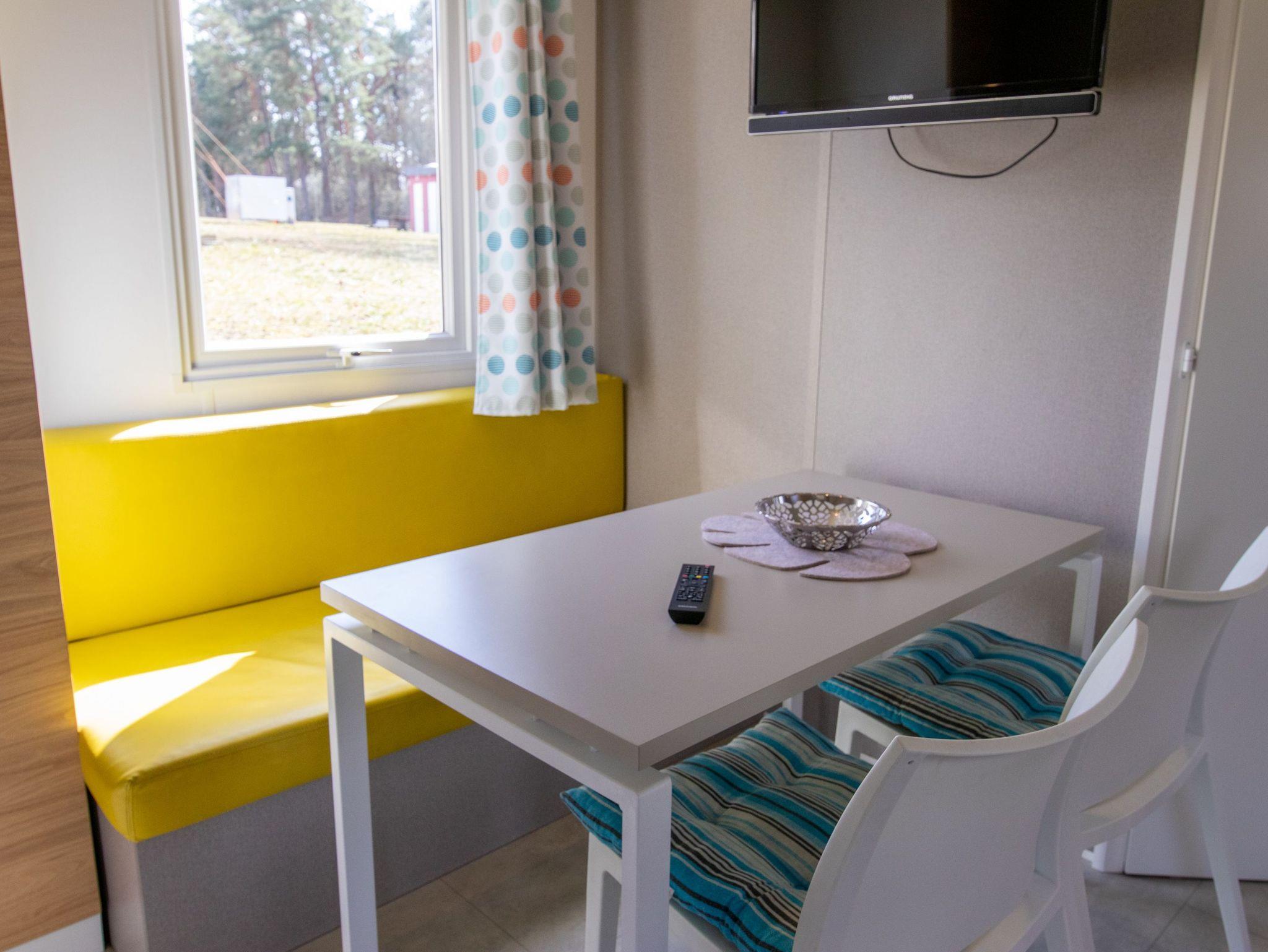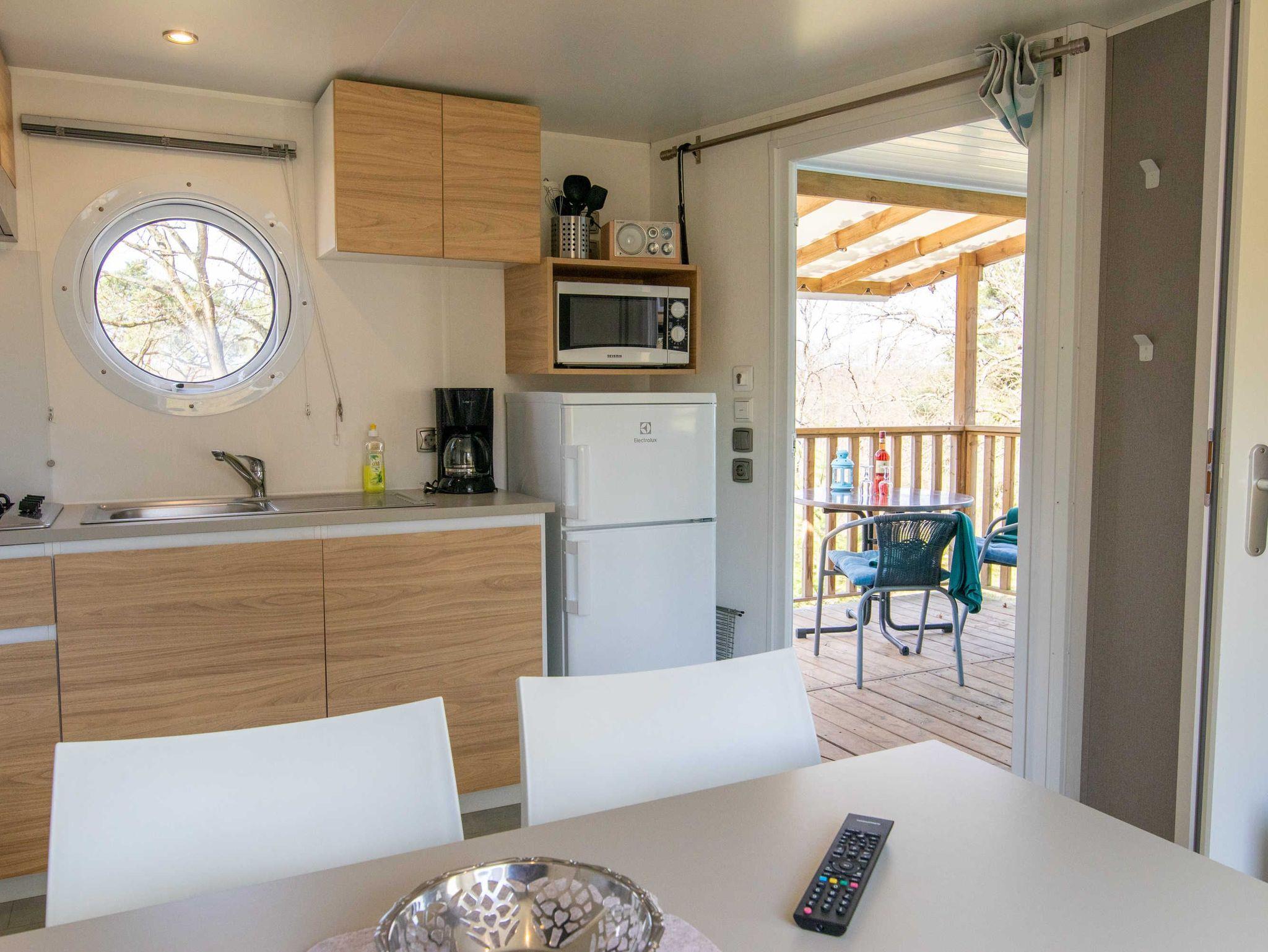 Das Mobilheim verfügt über zwei Schlafzimmer, eines mit französischem Doppelbett (140x200) und eines mit zwei Einzelbetten (80x190). In der komplett ausgestatteten Küche mit Essbereich und Wohnraum mit TV können sie gemeinsam kochen und entspannen. Das Bad ist mit Dusche und separater Toilette ausgestattet. Sie können den Sonnenuntergang von der integrierten Terrasse genießen.