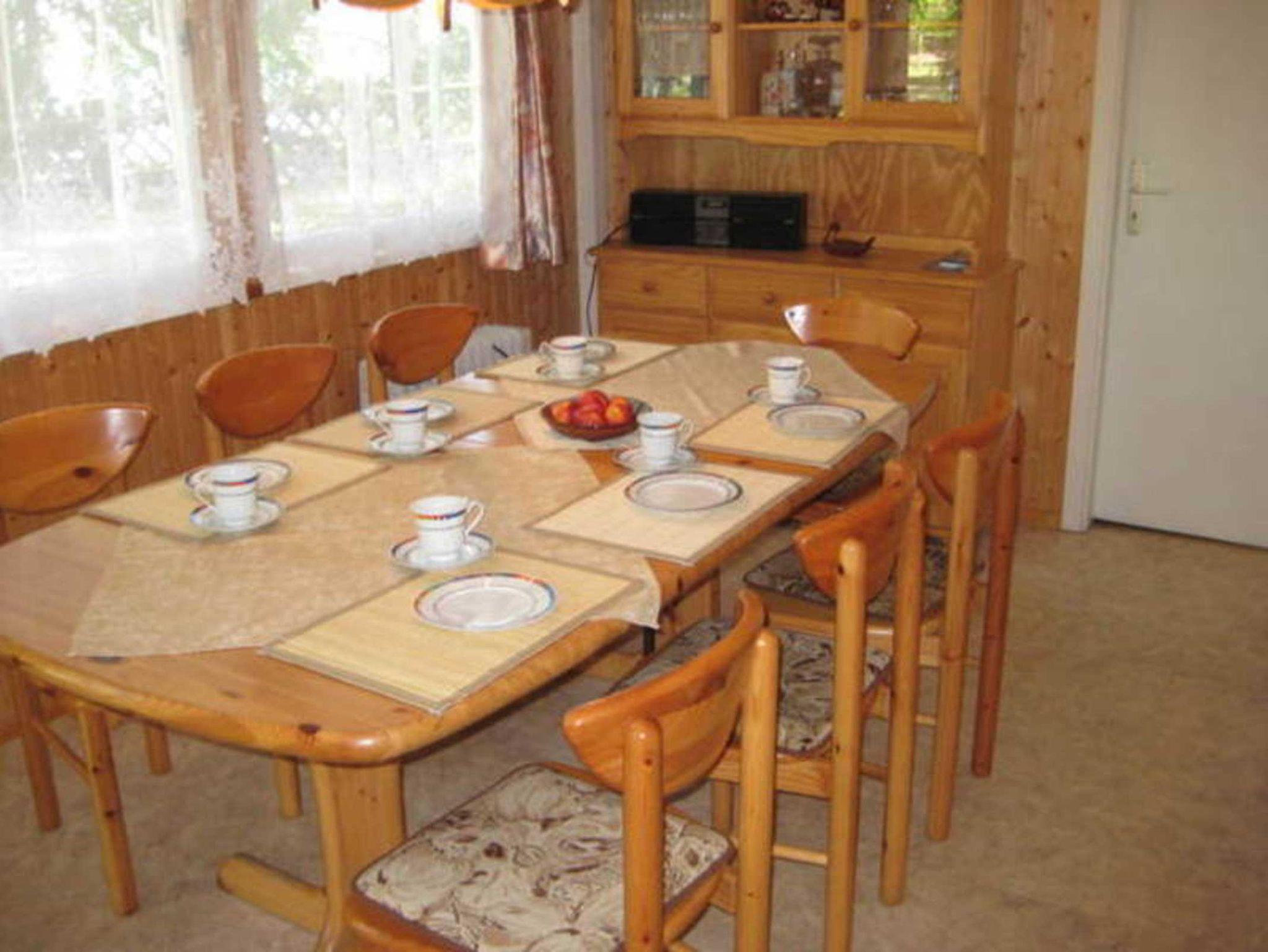 Ferienbungalow für max. 6 Personen, im Wald direkt am Wasser gelegen, mit Seeblick, 3 Schlafzimmer (2x Doppelbett, 1x Etagenbett), Singleküche (2 Plattenelektroherd, Kühlschrank, Wasserkocher, Toaster, Kaffeemaschine usw.) Duschbad, großzügiges Wohn und Esszimmer, Terrasse