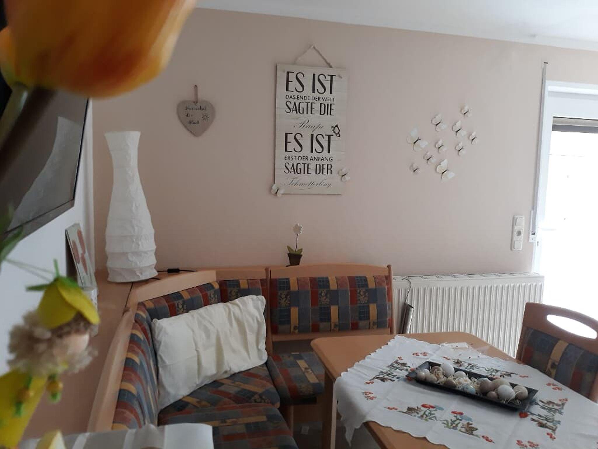 Es erwarten Sie zwei Schlafzimmer (1 Doppelzimmer und ein Einzelzimmer) jeweils mit Waschbecken im Zimmer - eine gemütliche Wohnküche mit Schaukelstuhl, Essgruppe, Küchenzeile, bequemer 2-Sitzer-Couch, Telefon und Flachbild-Sat-TV.- sowie 1 x Du/WC. Außerdem gehört zu dieser Ferienwohnung eine sehr schöne, überdachte, wind- und wettergeschützte Terrasse mit direktem Zugang zum Garten.