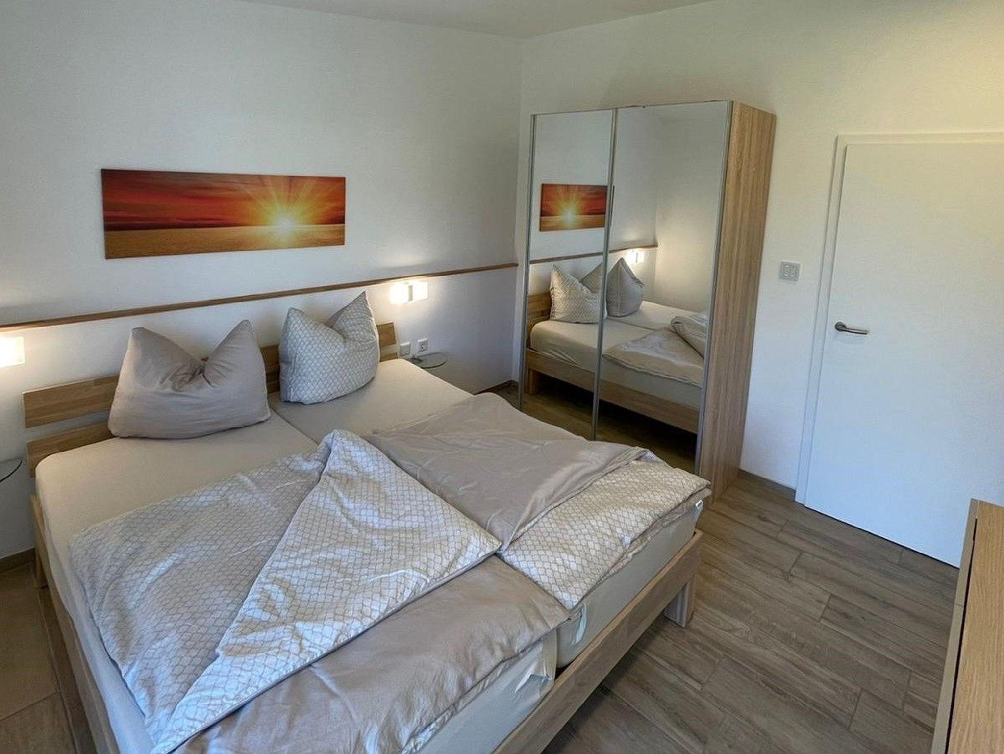 * 1 Schlafzimmer im EG mit Doppelbett, Schwebetürenschrank und Sideboard, Platz für Babybett