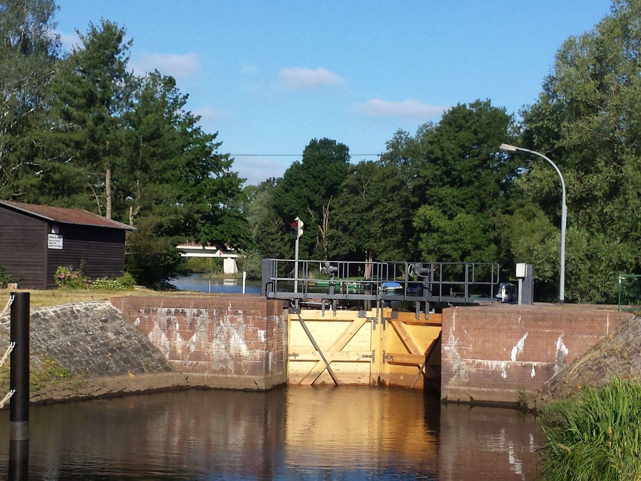 Drei Ferienwohnungen in einem Neubau-Ferienhaus mit Südterrassen und Blick auf die Spree, Naturschleuse bzw. Nadelwehr in Alt-Schadow am Neuendorfer See.