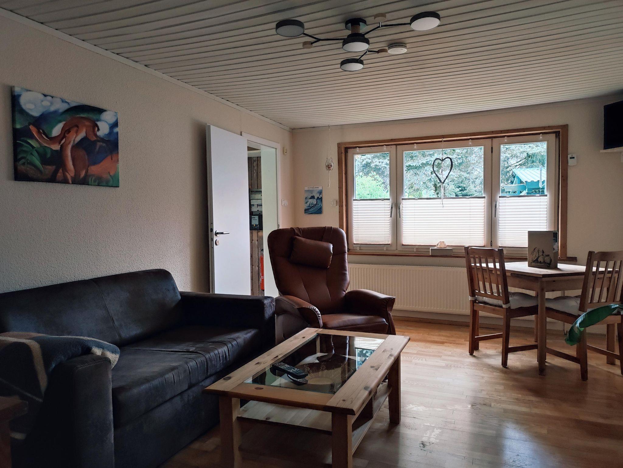 Das Holzhaus verfügt über ein Wohn- und Esszimmer mit Anlage, Fernseher, DVD-Player, TV-Sessel mit Massagefunktion und einem ausklappbaren Schlafsofa (120 cm breit). Die kleine Küche ist ausgestattet mit einer Kühl-Gefrierkombi, Ofen, Induktionskochfeld, Spülmaschine, Kaffeemaschine, Toaster und Eierkocher.