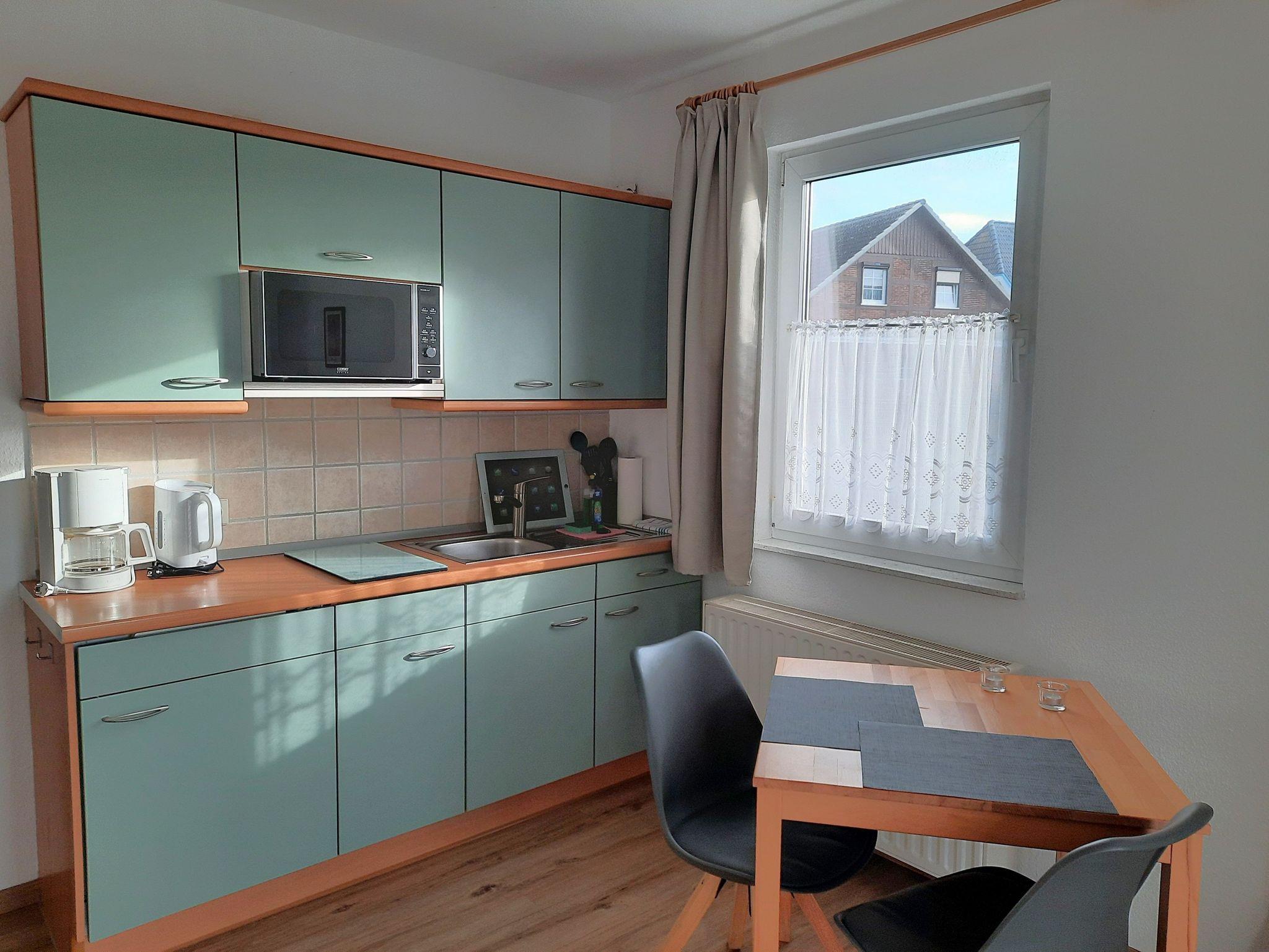 Die gemütliche Ferienwohnung ist ca 28qm groß und verfügbt über einen kombinierten Wohn-Schlafraum mit einem Doppelbett, Flat-TV, einem Esstisch und einer offenen Küchenzeile ausgestattet mit Kühlschrank mit Gefrierfach, 2-Stellen-Cerankochfeld, Kaffeemaschine, Wasserkocher und Toaster sowie einem kleinen Backofen. W-LAN steht Ihnen kostenfrei zur Verfügung.