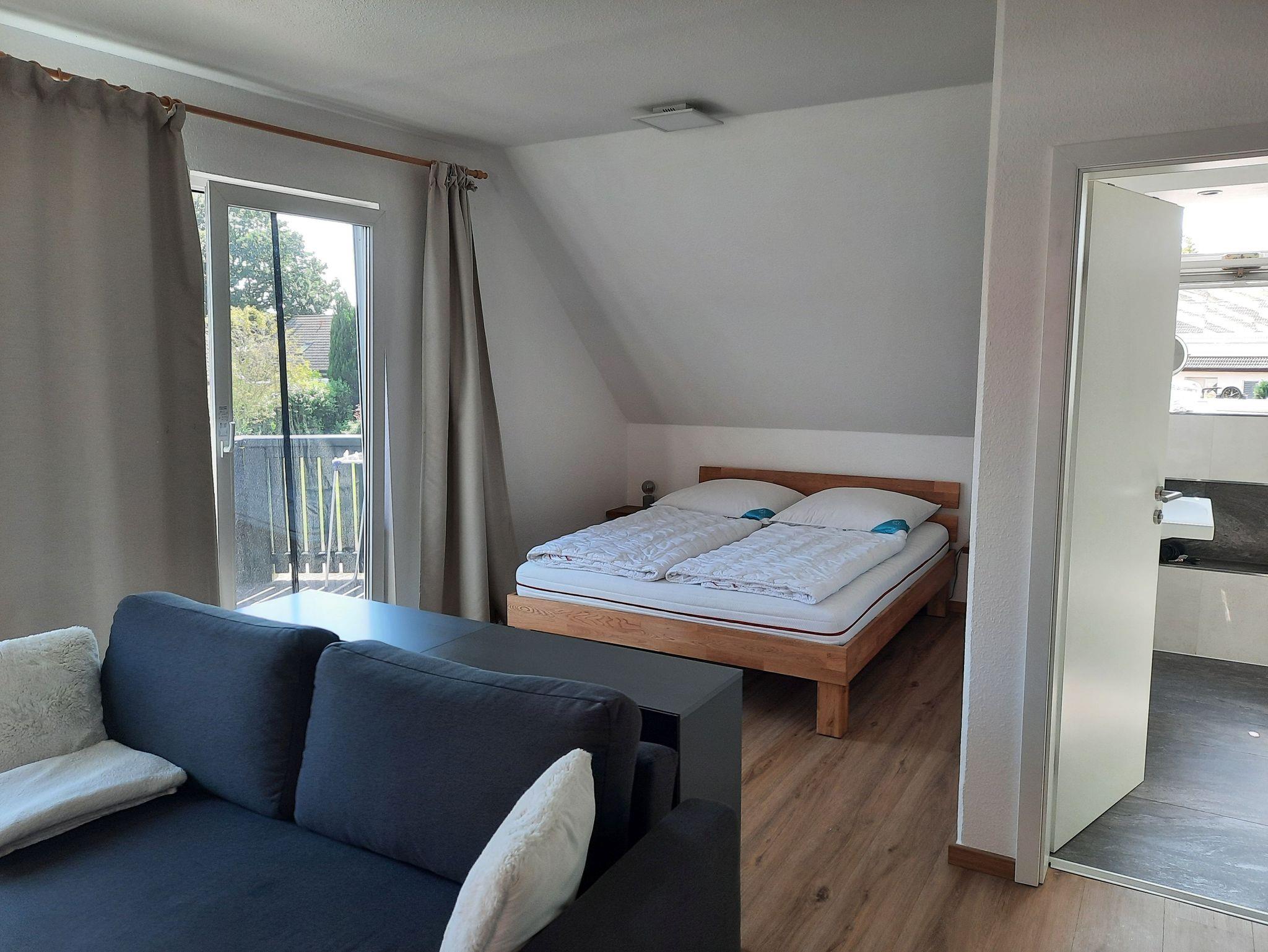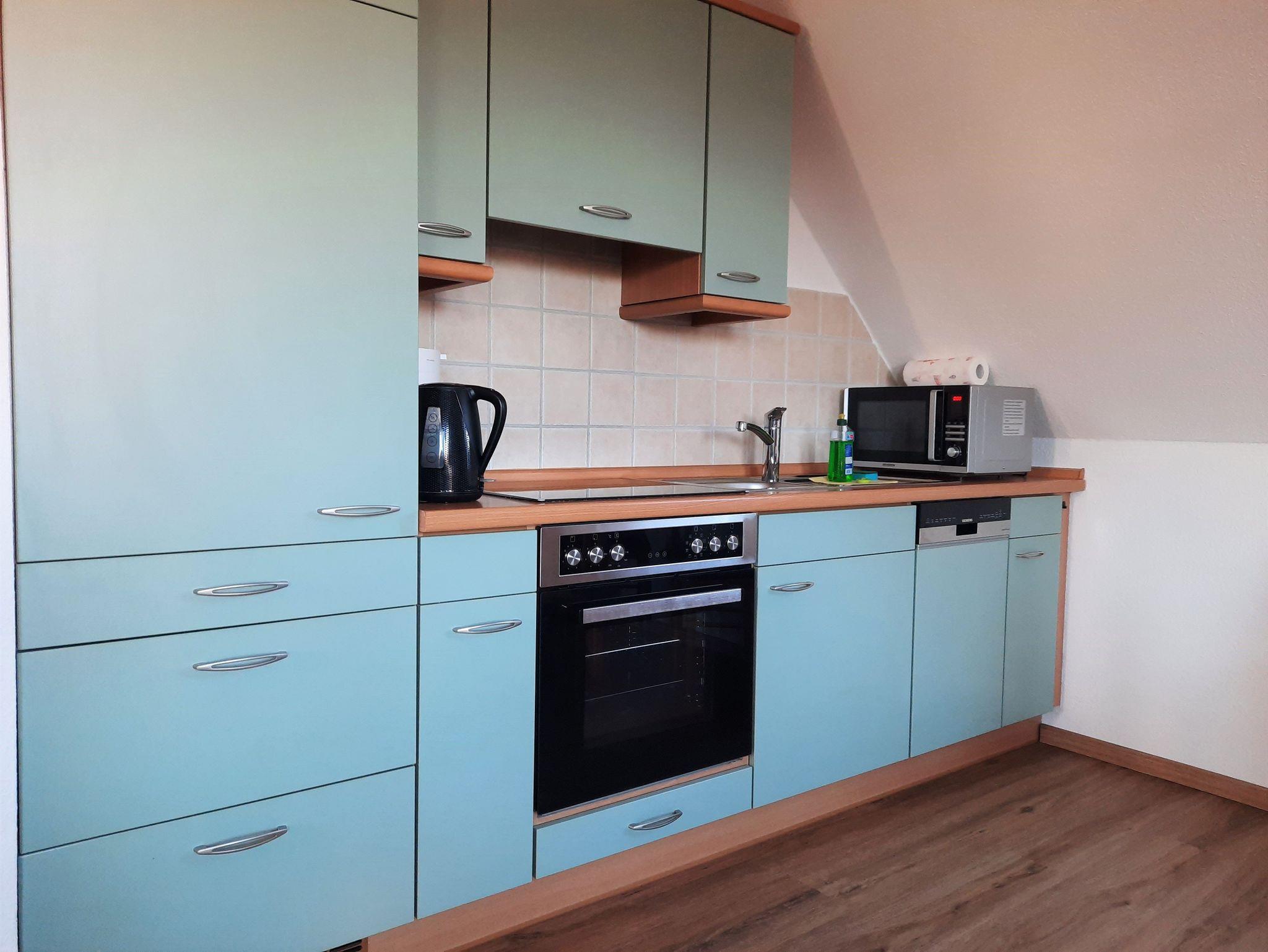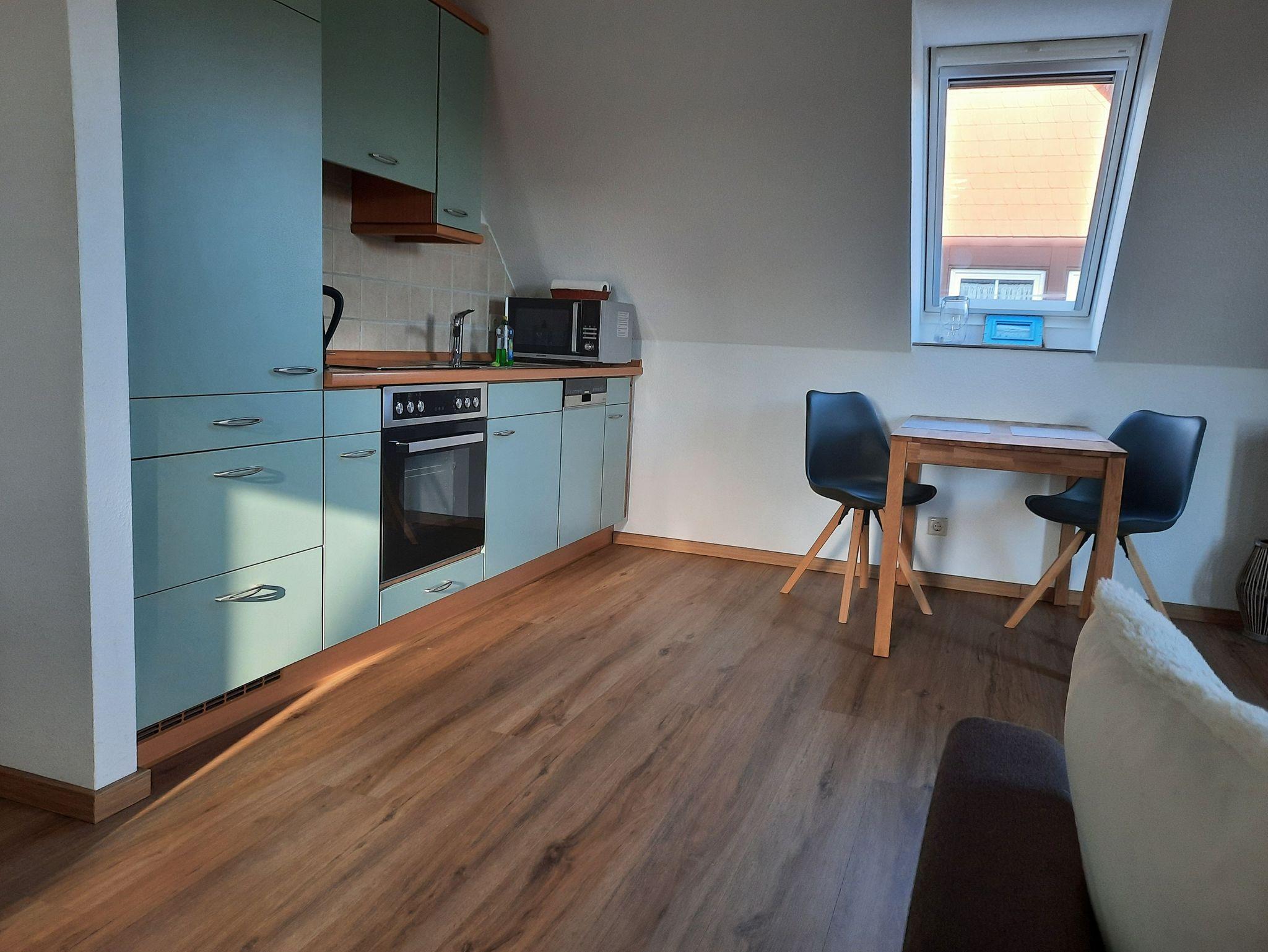 Die ca. 35qm große Ferienwohnung verfügt über einen kombinierten Wohn-Schlafraum mit einer gemütlichen Couchecke mit Flat-TV und Esstisch sowie der angrenzenden, offenen Küche mit Backofen, Cerankochfeld, Kühlschrank mit Gefrierfach, Geschirrspüler, Kaffeemaschine, Wasserkocher und Toaster. Das Doppelbett befindet sich optisch abgeteilt in der Nische.Das Badezimmer verfügt über eine Dusche, Waschbecken, WC und einen Haartrockner. W-LAN steht Ihnen kostenfrei zur Verfügung.