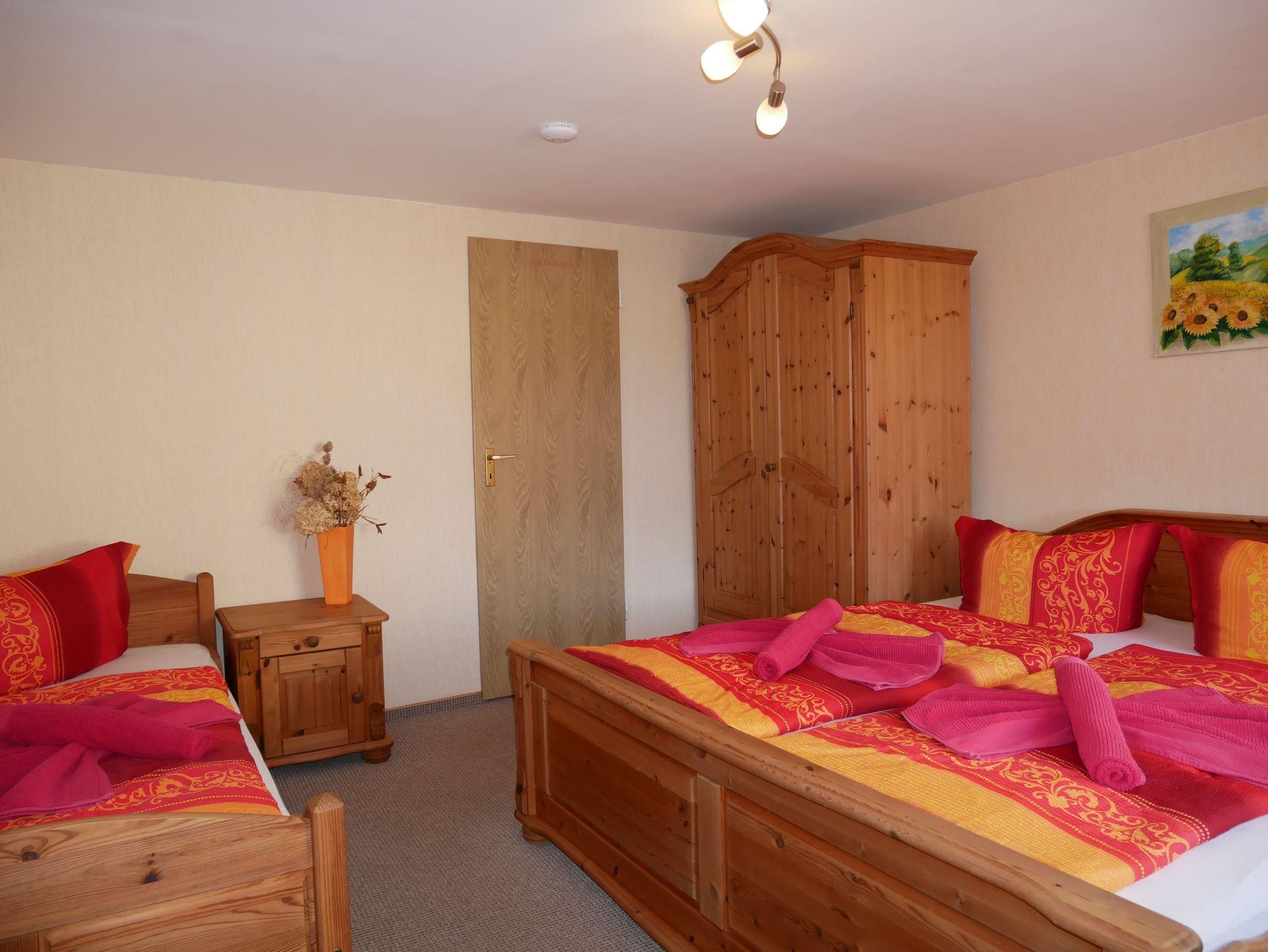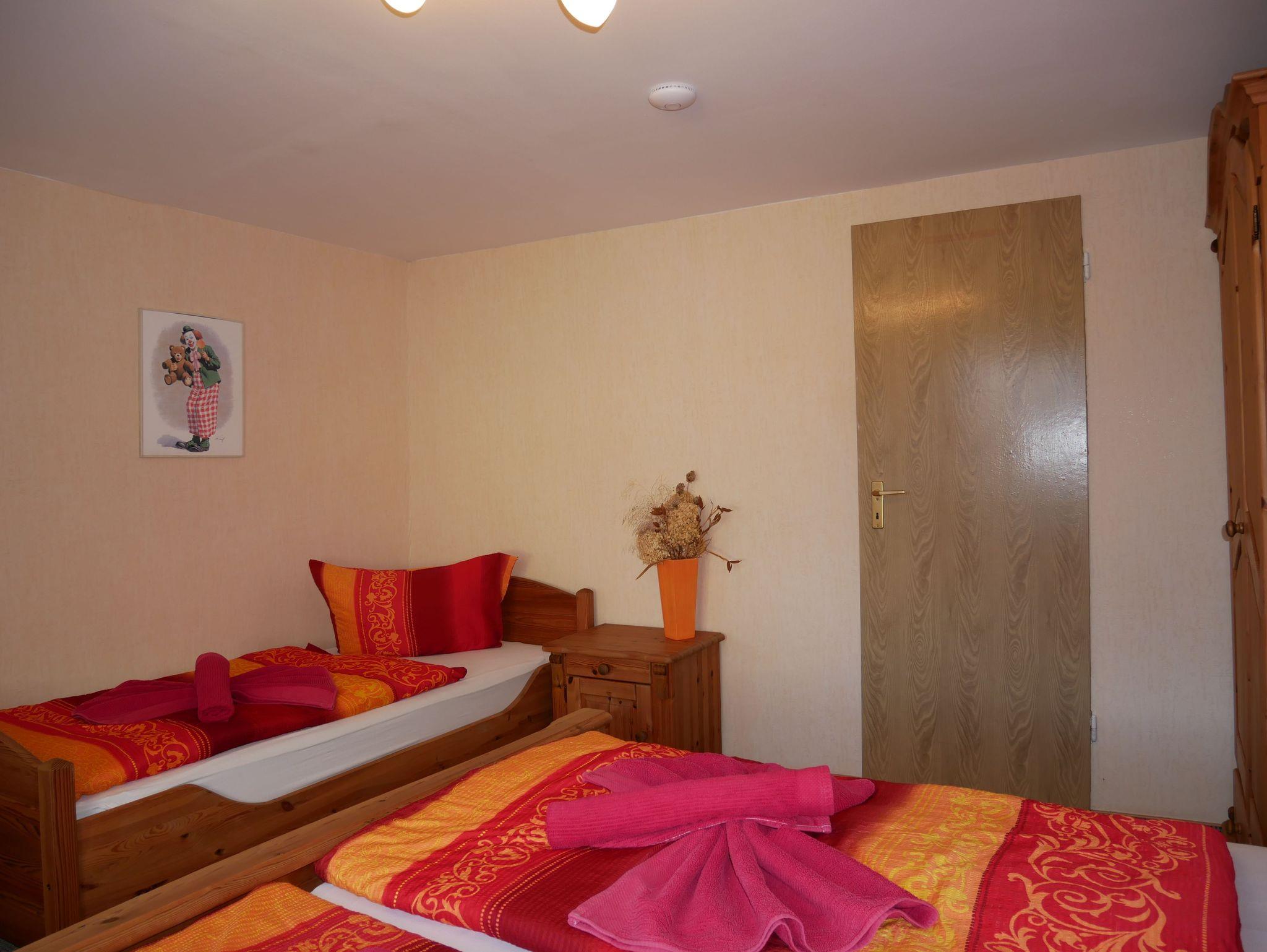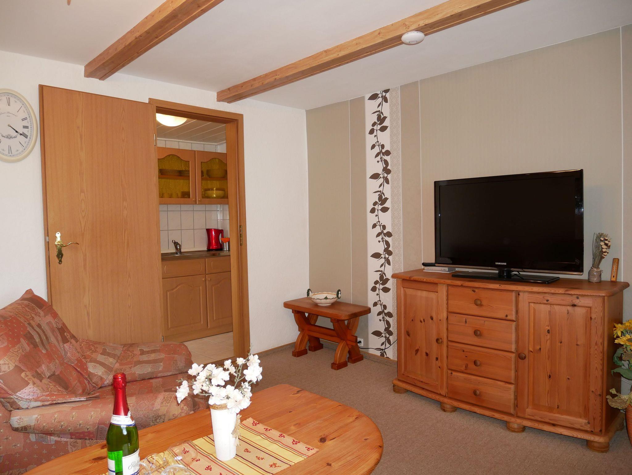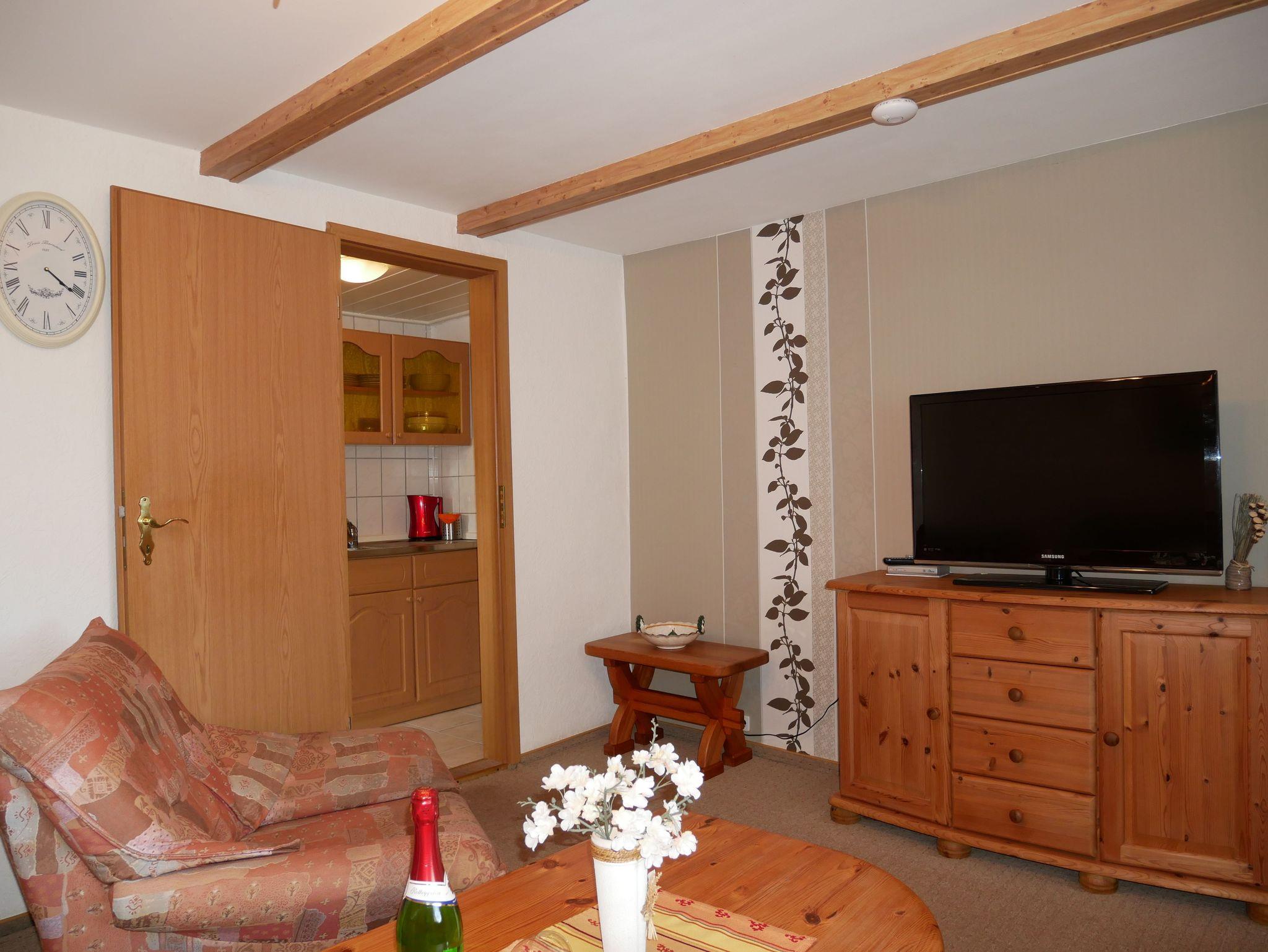 Die 46 qm große Ferienwohnung verfügt über ein Esszimmer mit Esstisch und 4 Stühlen, ein Wohnzimmer mit Sitzecke (die ausziehbare Couch bietet eine Aufbettung für 2 Personen) und TV. Die separate Küche ist ausgestattet mit einen 4-Platten-Herd, Backofen, Wasserkocher, Toaster etc. Das Schlafzimmer bietet neben einem Doppelbett, ein Einzelbett und einen Kleiderschrank. Das angrenzende Bad ist mit Dusche/WC ausgestattet.