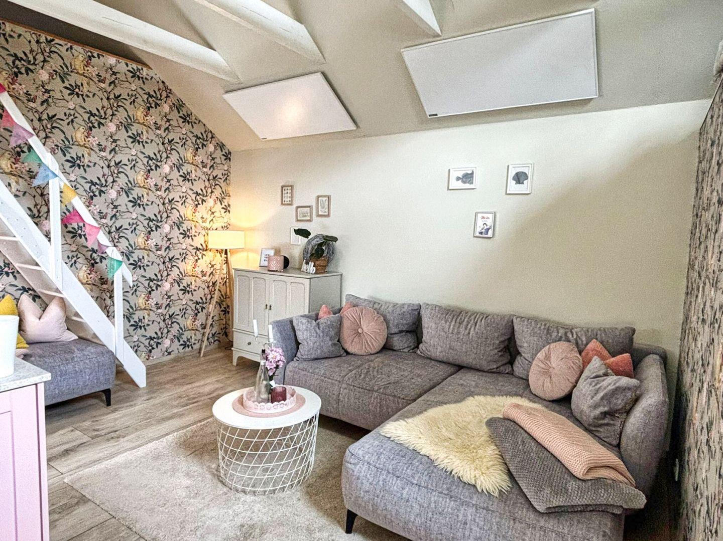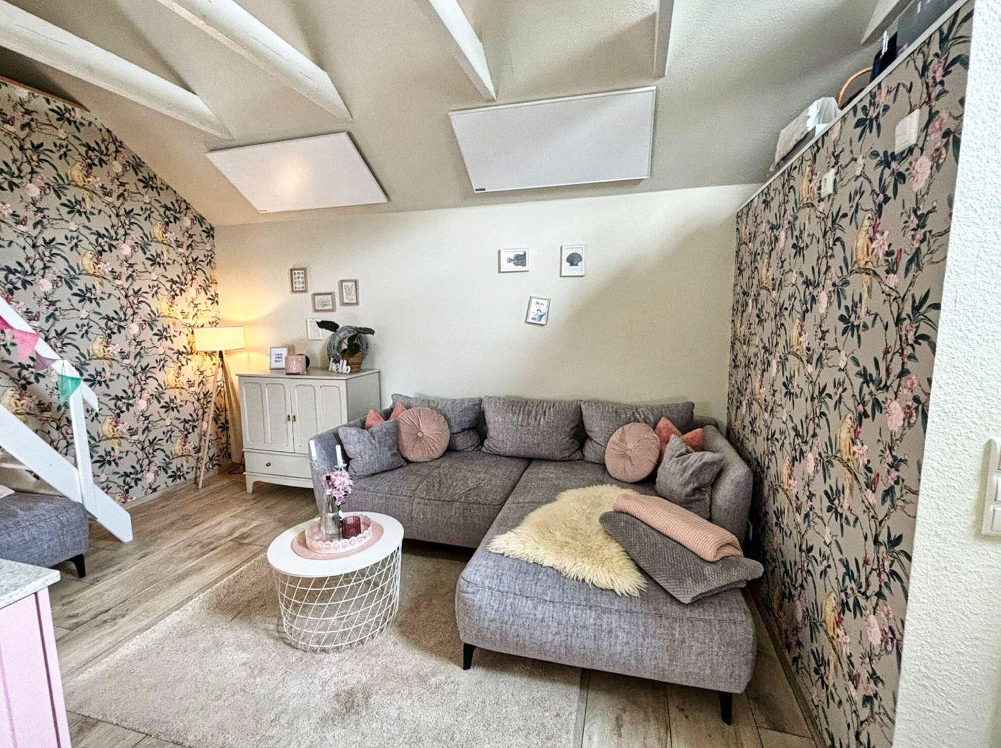 WOHNEN// heller Wohnraum mit bequemer Couch, Flachbild-TV (Kabel) und Essbereich ++