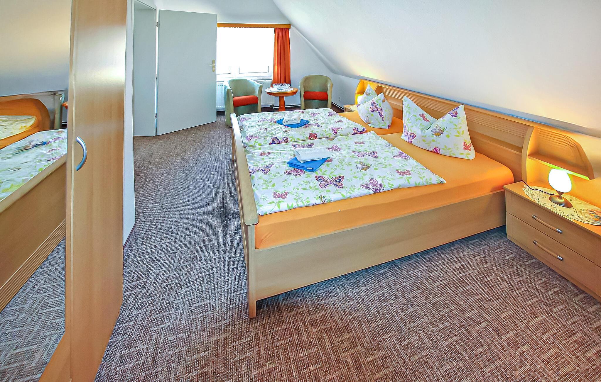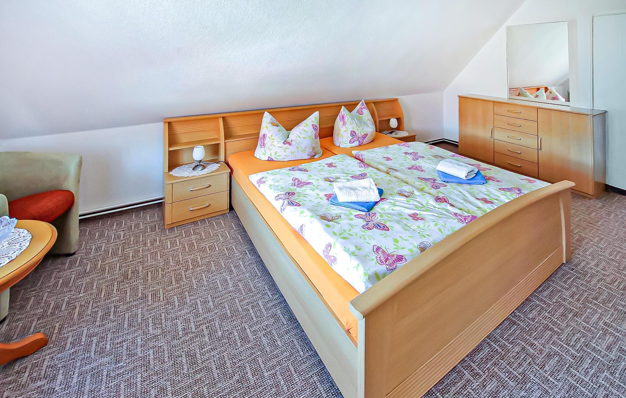 Kun ca. 50 m fra Greifswalder Bodden ligger to moderne ferielejligheder til hver to personer på en velholdt gård i et historisk hus. Restauranter, fiskemuligheder, bådudlejning, en legeplads og en ridestald ligger i umiddelbar nærhed, og den smukke Østersøstrand Lobbe ligger kun få skridt væk (ca. 4 km væk). Cykeludlejning kan arrangeres gennem ejeren. (På gården er der også et separat stråtagsferiehus med tre ferielejligheder til to til fire personer, DZV537, DZV538 og DZV539). De cirka 40 kvadratmeter store ikke-ryger lejligheder ligger på første sal og kan nås via en fælles trappe. De har stor stue med polstrede møbler, fladskærms-tv, køleskab og kaffemaskine, stort soveværelse og badeværelse med brus/toilet. Derudover har gæsterne adgang til en lounge i stueetagen (som også fungerer som morgenmadslokale), en fælles terrasse med havemøbler og en grill, en parkeringsplads, en cykelkælder og gratis trådløst internet. Rygning er tilladt udendørs. Den samlede pris inkluderer morgenmad, slutrengøring, sengelinned, håndklæder samt vand- og energiforbrug. Betales på stedet: turistskat. Kæledyr er ikke tilladt. Alt Reddevitz er en tidligere fiskerby på Tysklands største ø, Rügen, og ligger på halvøen Mönchgut, på et cirka 5 km langt næs i biosfærereservatet Sydøst Rügen, direkte på Rügisches Bodden, en forlængelse af Greifswalder Bodden. Bademuligheder findes allerede her på den flade naturstrand eller på den fine sandede Østersøstrand i Lobbe Stedet byder på de bedste betingelser for cykling, vandreture, fiskeri (fiskekort fås direkte i landsbyen), ridning og svømning og er kendt for sin lille kagefabrik i cafeen “Moccavino”. De velkendte Østersøferiesteder Baabe, Sellin og Binz ligger omkring 6 km, 8 km og 18 km væk.