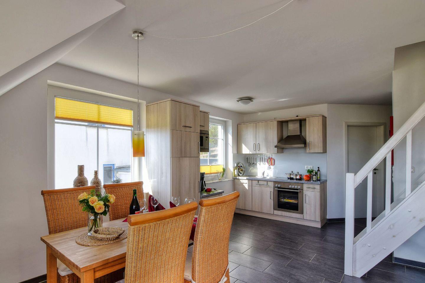 KÜCHE // offene Küche mit Essbereich, 4-Felder Ceranfeld mit Backofen, Kühlschrank mit Gefrierfach, Spülmaschine, Mikrowelle, Toaster, Wasserkocher, Kaffeemaschine, reichlich Besteck, Geschirr und Küchenutensilien ++