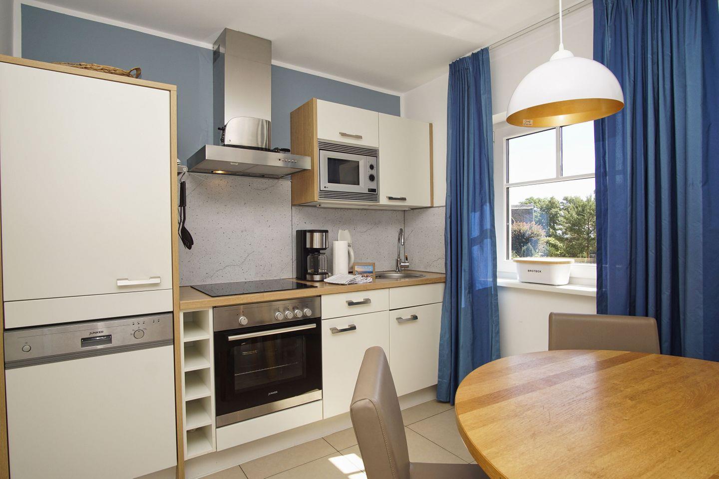 KÜCHE // Küchenzeile, 4-Platten Ceranherd, Spülmaschine, Kühlschrank mit Gefrierfach, Backofen, Mikrowelle, Toaster, Wasserkocher, Kaffeemaschine, reichlich Besteck, Geschirr und Küchenutensilien ++