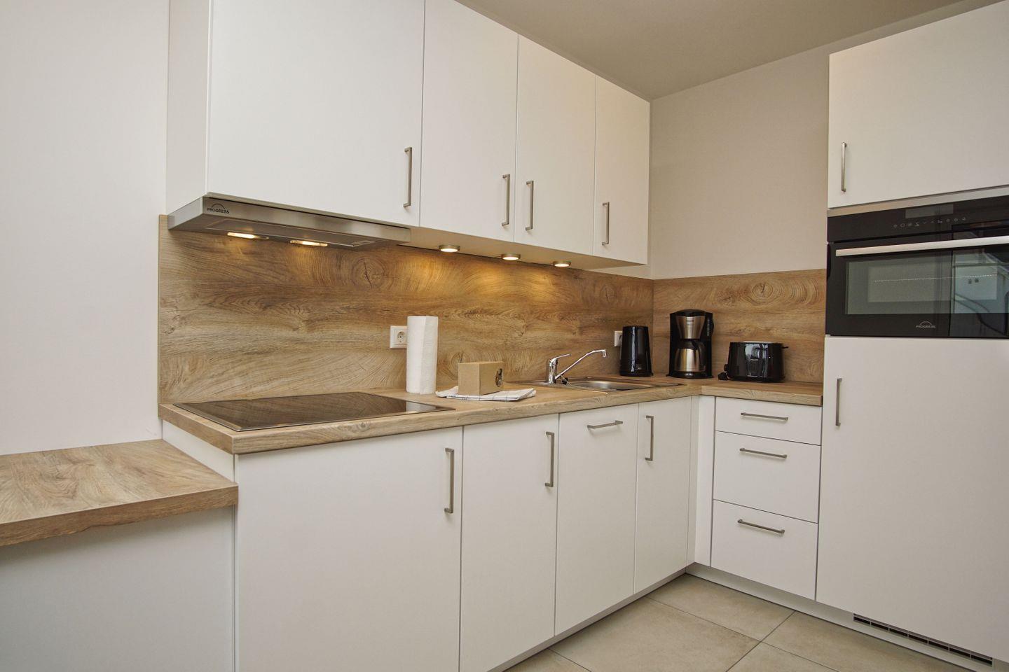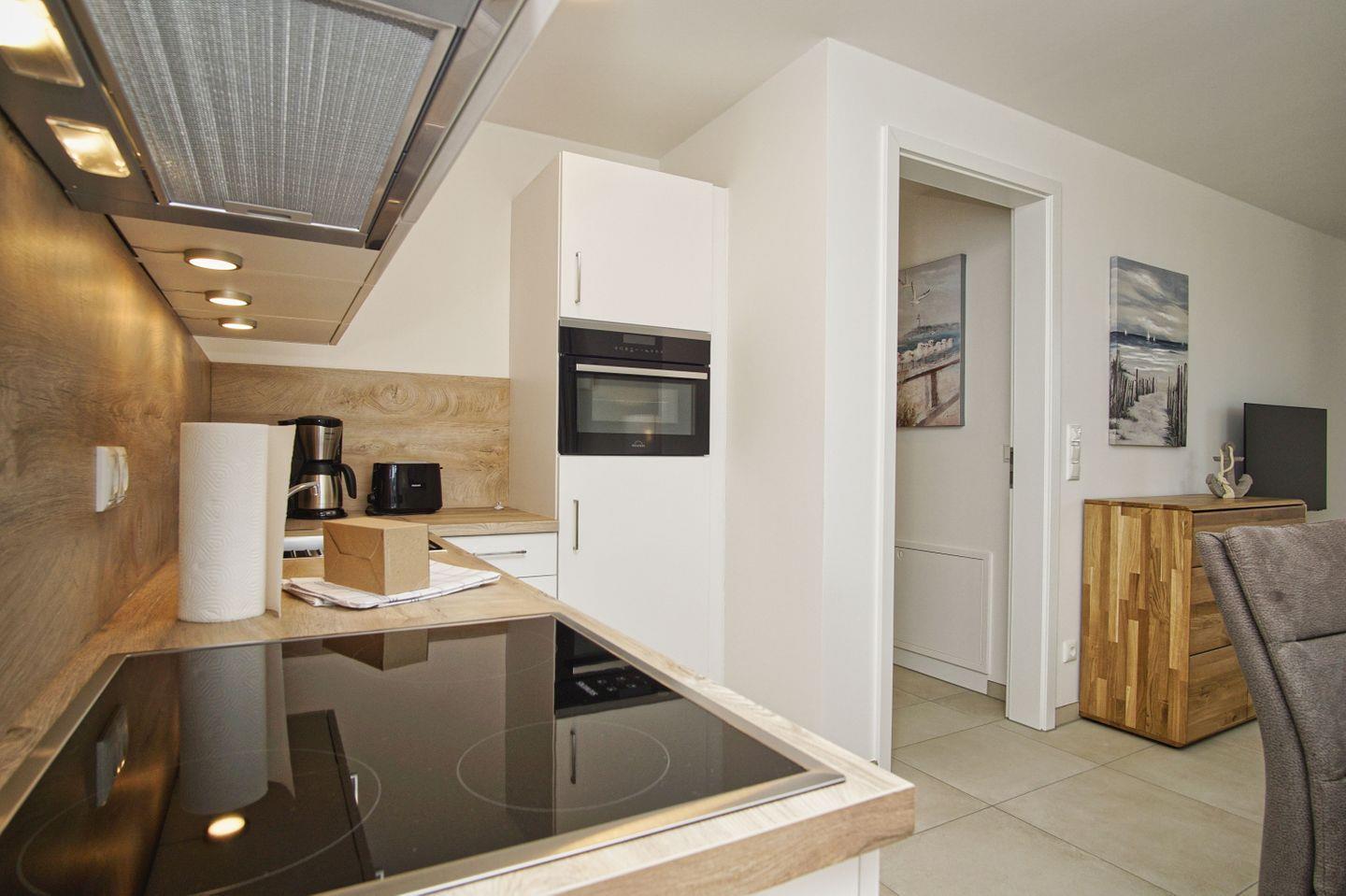 KÜCHE // Küchenzeile, 4-Platten Ceranfeld, Spülmaschine, Kühlschrank mit Gefrierfach, Backofen, Toaster, Wasserkocher, Kaffeemaschine, reichlich Besteck, Geschirr und Küchenutensilien ++