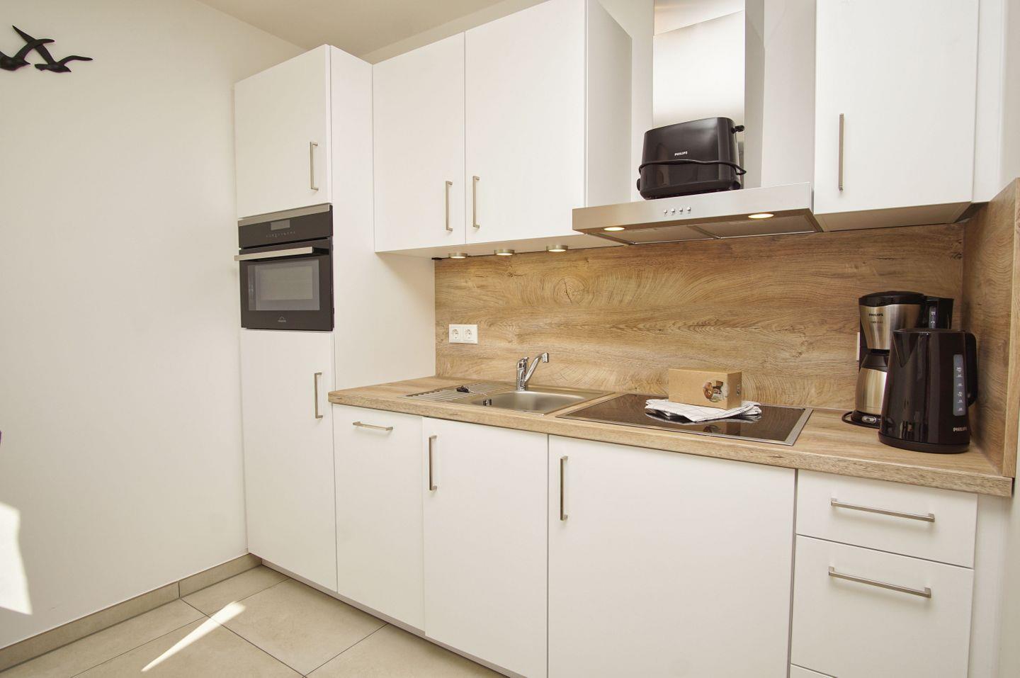 KÜCHE // Küchenzeile, 4-Platten Ceranfeld, Spülmaschine, Kühlschrank mit Gefrierfach, Backofen, Toaster, Wasserkocher, Kaffeemaschine, reichlich Besteck, Geschirr und Küchenutensilien ++