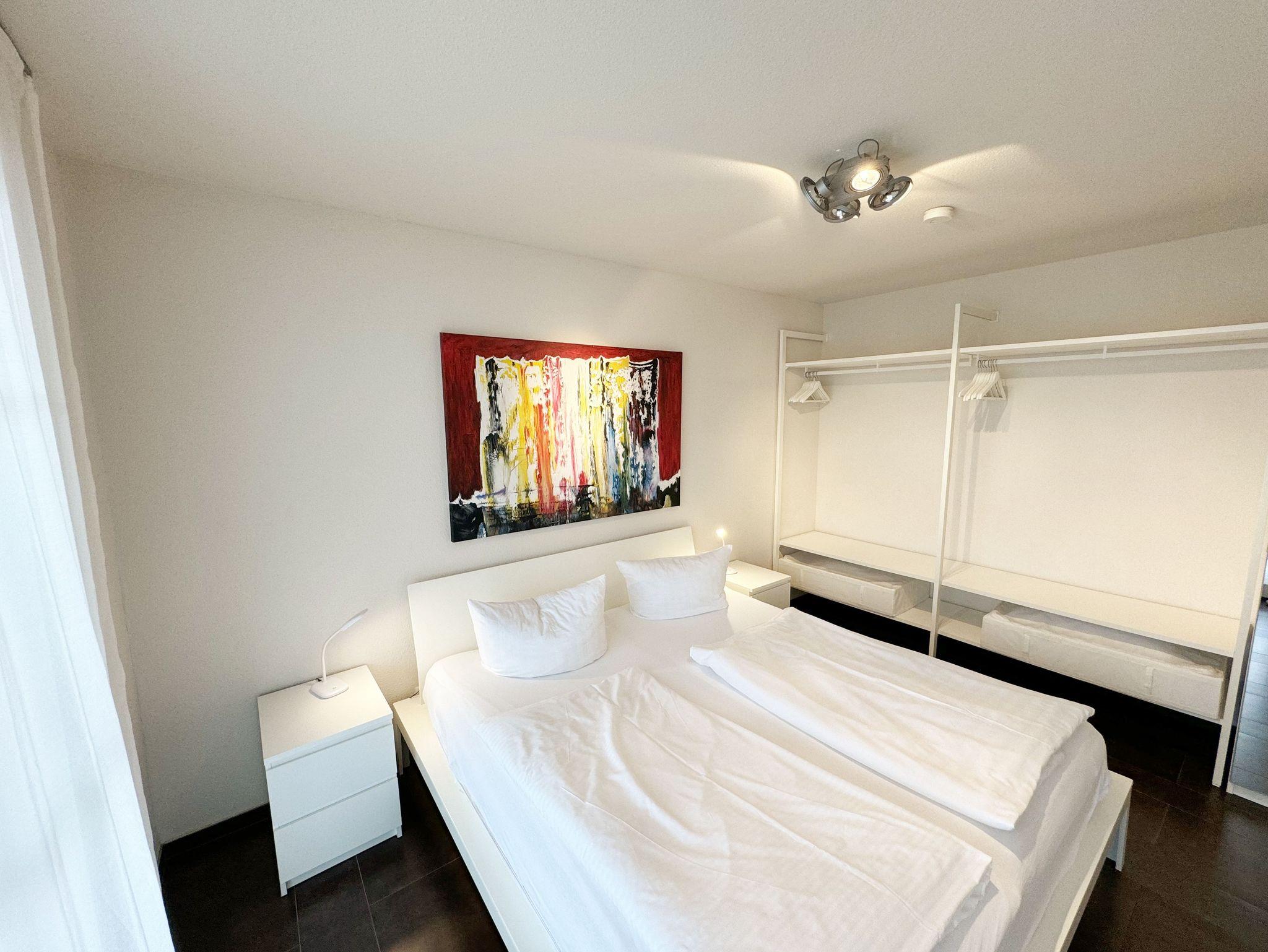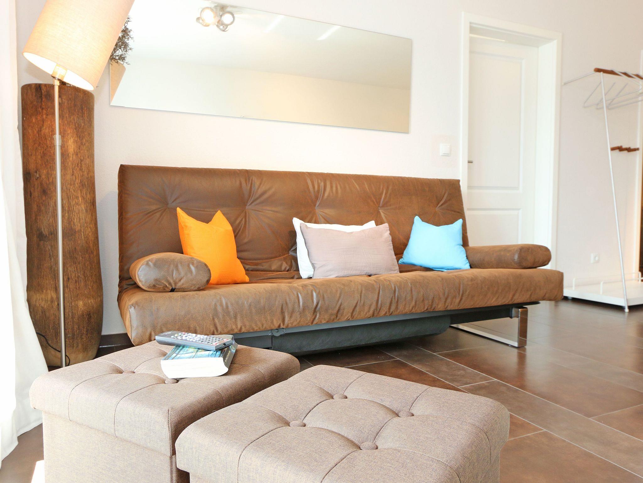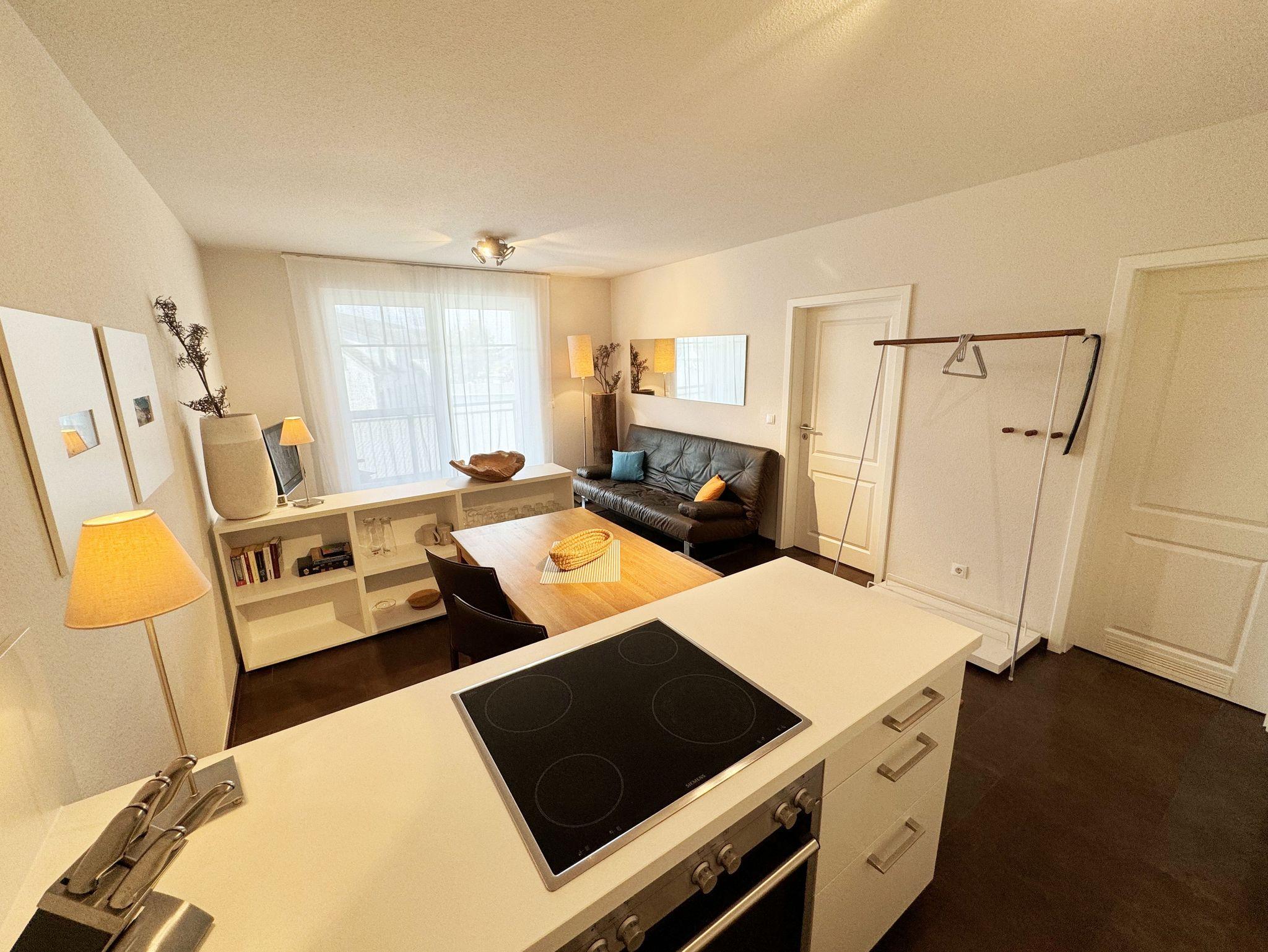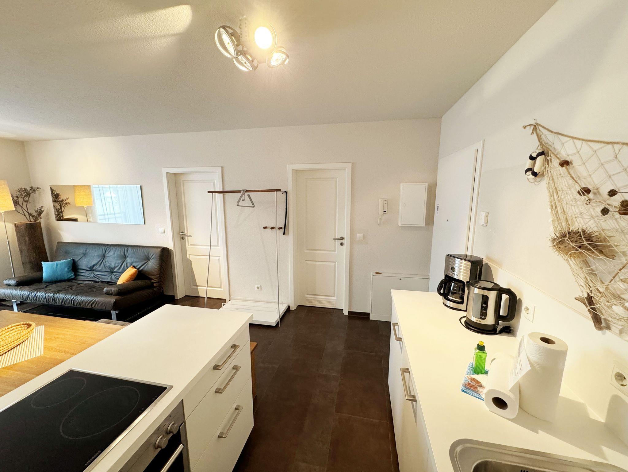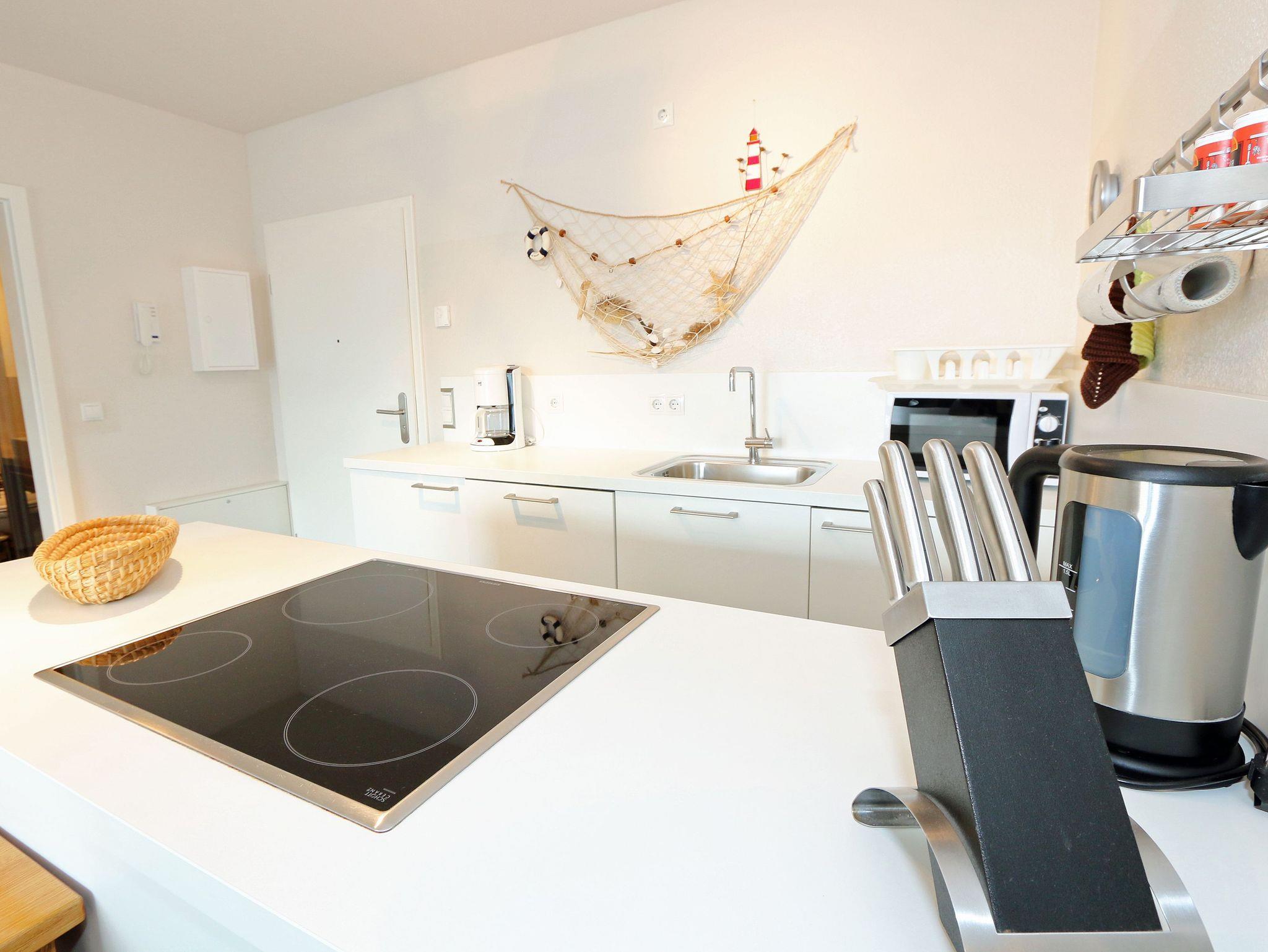 Die hochwertige 2-Zimmer Nichtraucherwohnung ?Düne 9 befindet sich im 1. OG und verfügt über eine Wohnfläche von ca. 50 qm. Ideal ist die Wohnung für 3 Erwachsene geeignet. Der zu der Wohnung gehörende überdachte und bestuhlte Balkon mit Sonnenschirm hat eine sonnige Süd/West Ausrichtung mit transparenter Balkonabtrennung und lädt zum Verweilen ein. Das großzügige Wohnzimmer ist mit einem Essbereich (Esstisch 1,40m x 75 cm, 2 Lederstühlen und Holzbank), einer Leselampe, einer geschmackvollen weißen Wohnzimmereinrichtung und einem Relaxsofa (kann zu einer Schlaffunktion für die 3. Person ausgeklappt werden, 1,40m x 2,00m) ausgestattet. Der angrenzende Küchenbereich umfasst ein 4-Zonen Ceranfeld, Backofen, Kühlschrank, Geschirrspüler, Mikrowelle, Wasserkocher, Mixer, Toaster, Kaffeemaschine, Eierkocher und diverse Küchenutensilien. Abgerundet wird der Wohnbereich von einem LCD-Flachbildschirm (32 Zoll / Full HD), kleine Hi-Fi Compactanlage mit CD und USB und einen DVD/Blu-Ray-Player. Auch im Urlaub brauchen Sie auf einen Internetanschluss (WLAN) nicht verzichten. Dieser ist für Sie inklusive. Das Schlafzimmer ist mit einem Doppelbett (1,80m x 2,00m) und Nachttischkonsolen ausgestattet. Das offene Schranksystem und der zusätzliche Spiegelschrank bieten genügend Stauraum für Ihre Kleidung. Der Wohn- und Schlafbereich sind mit elektrischen Außenjalousien und Insektenschutzgittern versehen und bieten daher einen ungestörten Schlaf. Das hochwertige Bad ist mit einer flachen Glasdusche, WC, Bidet, Waschmaschine (AEG Lavamat), Waschtisch, Spiegelbeleuchtung, Fön, Kosmetikspiegel und Handtuchheizung ausgestattet. In allen Räumen sorgt eine Fußbodenheizung für angenehme Wärme. Die Wohnung ist für Haustiere nicht erlaubt! Ein eigener PKW-Stellplatz Nr.09 befindet sich auf dem Grundstück, mitgebrachte oder gemietete Fahrräder können im wohnungseigenen Abstellraum untergestellt werden. Die Erstausstattung eines Wäschepaketes (komplette Bettwäsche, 1 Duschhandtuch, 2 kleine Handtücher) können Sie bis 14 Tage vor Anreise gegen einen Aufpreis dazu buchen oder durch eigene ergänzen. Ab 2 gebuchten Paketen erhalten Sie einmalig 1 Geschirrhandtuch und 1 Duschvorleger hinzu.