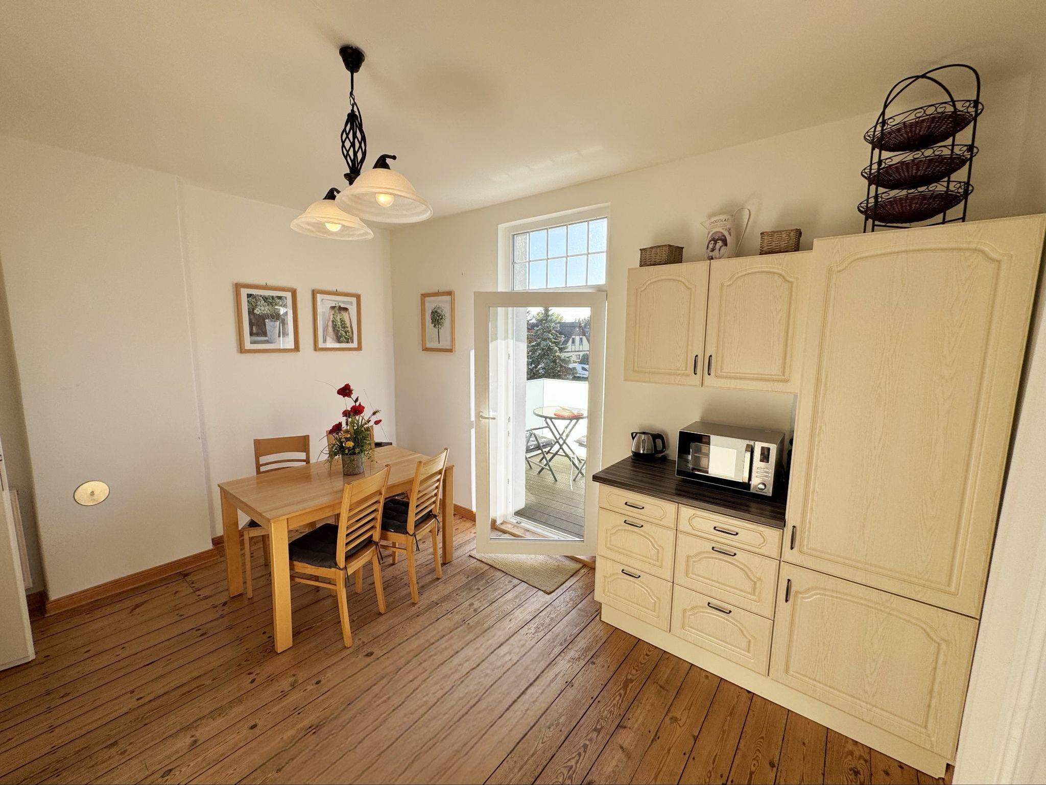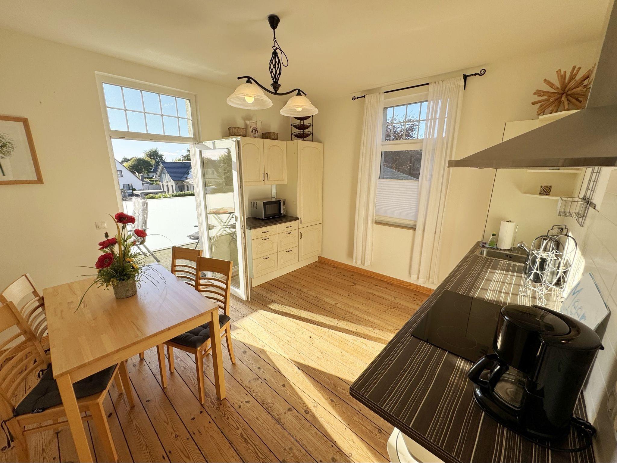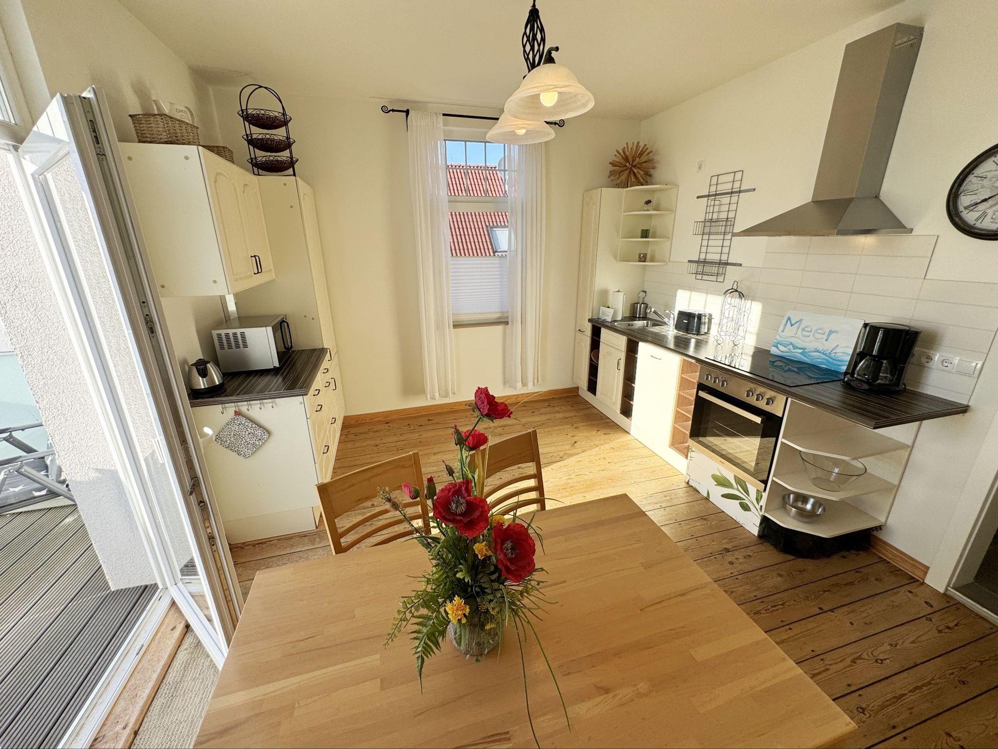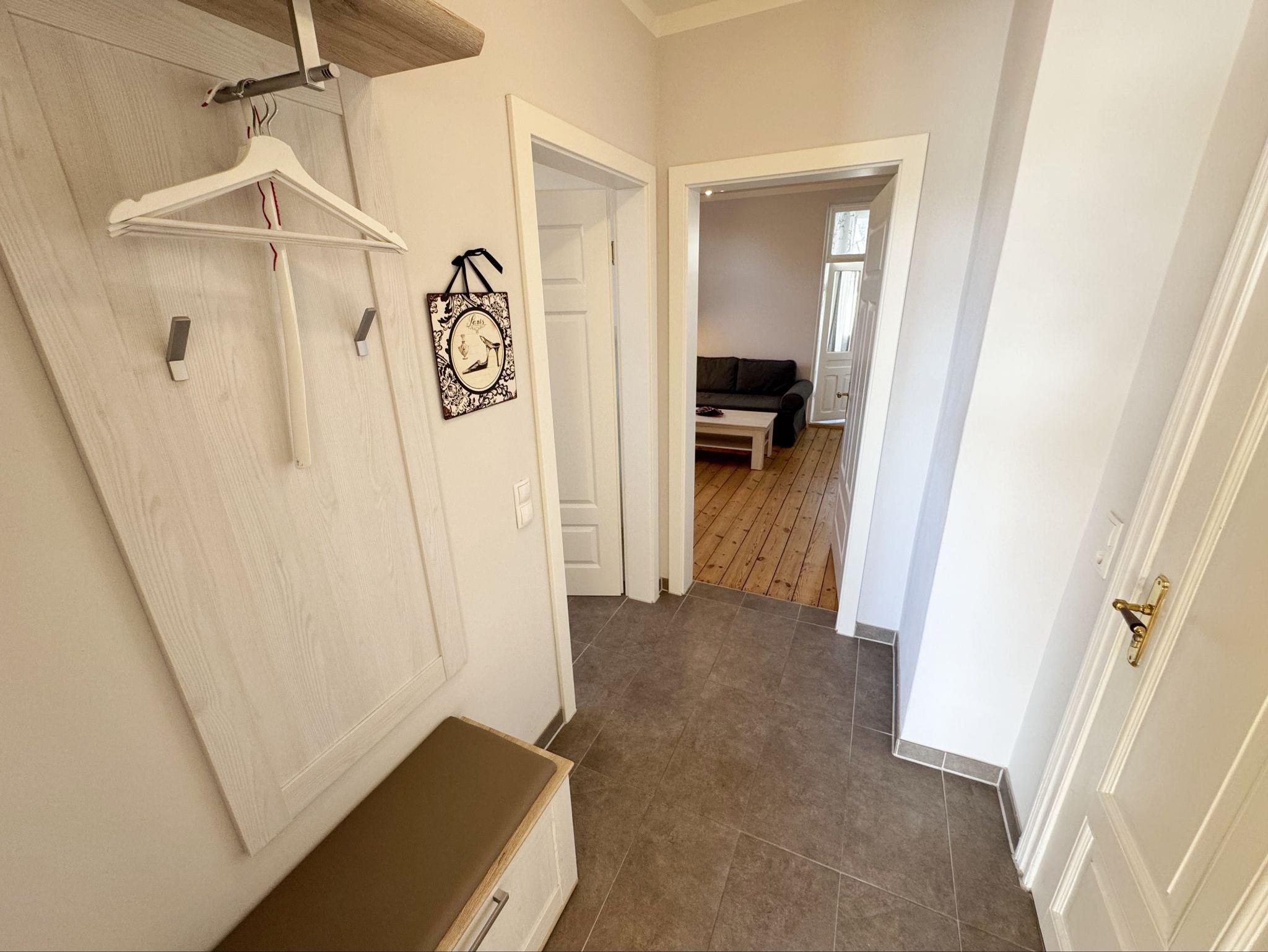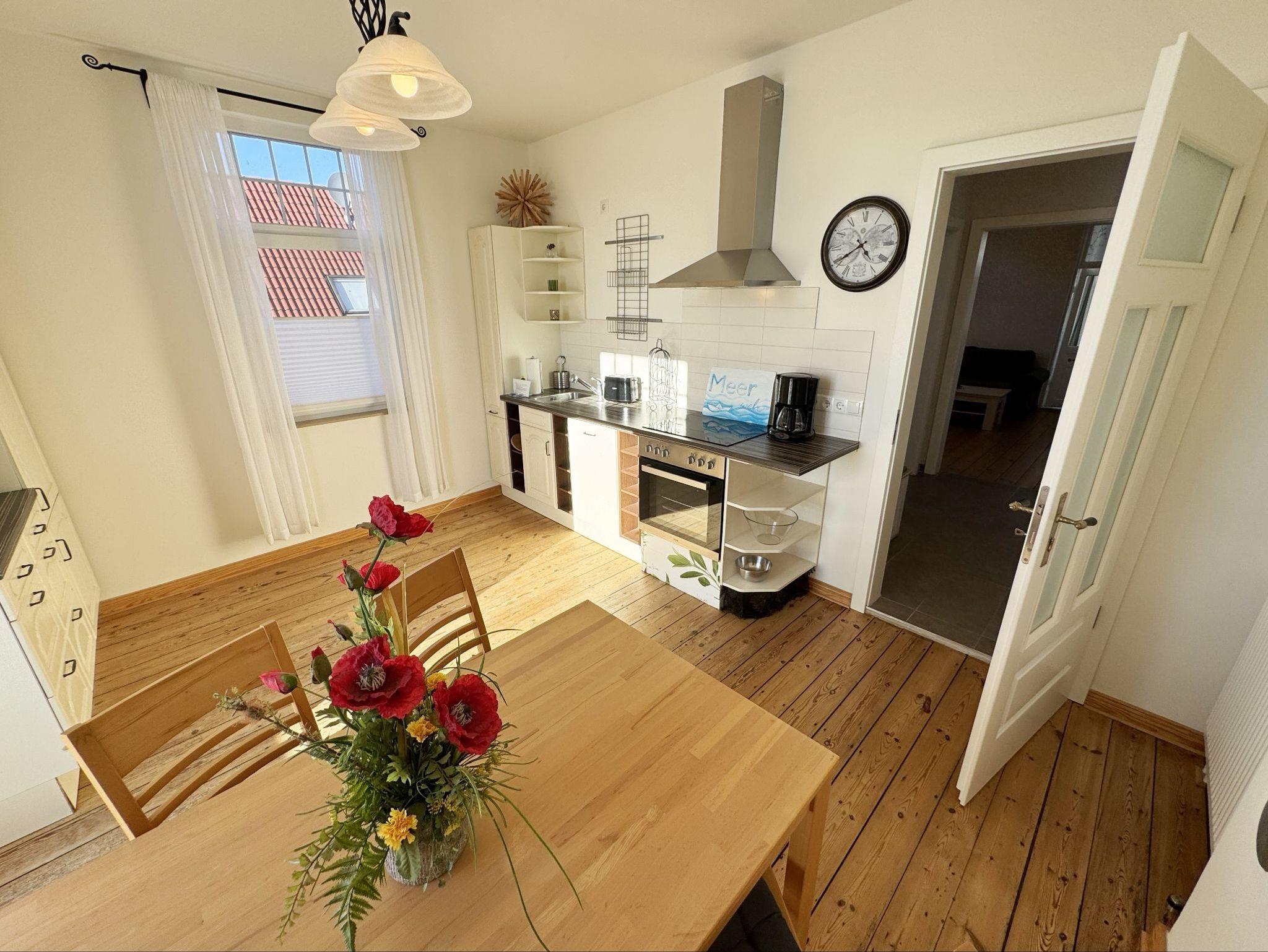 Die Ferienwohnung 3 ?Fischer un sin Fru? umfasst ca. 60 m² und bietet Platz für max. 3 Erwachsene und 1 Kleinkind bis 3 Jahre im Kinderreisebett. Diese Wohnung befindet sich im Obergeschoss des Hauses ?Seestern? und ist eine Nichtraucherwohnung. Sie betreten die Wohnung und ein kleiner Flur mit Garderobe bietet Platz und Stauraum. Von hier aus gelangen Sie in die geräumige Wohnküche, die mit modernen Einbaumöbeln komplett eingerichtet und voll ausgestatteten wurde, Herd mit Ceranfeld, Geschirrspüler, Kühlschrank mit Gefrierfach, Mikrowelle, Kaffeemaschine, Wasserkocher, Toaster sind ebenso vorhanden wie diverse Küchenutensilien. Hier können Sie gemeinsam Ihr Essen zubereiten. Alles was Sie brauchen steht zur Verfügung. Der Essplatz bietet Ihnen Platz zum Essen und zum Verweilen. Auch auf dem angrenzenden geräumigen und bestuhlten Balkon (West) ? Blick Richtung Bodden - finden Sie ausreichend Platz und können hier Ihren Strandtag in der Abendsonne in Ruhe ausklingen lassen. Eine elektrische Markise sorgt für Sonnenschutz. Im Wohnbereich mit Flachbild-TV und Radio mit Bluetooth, finden Sie einen gemütlichen Couchbereich zum Ausruhen (Aufbettungsmöglichkeit für 3. Person 1,40 m x 2,00 m) mit Couchtisch, Lesesessel, Sideboard und Leselampe. Hier schließt sich die Veranda an, die wir zu einem Schlafzimmer mit Boxspringbett (1,80 m x 2,00 m), Kleiderschrank und Sideboard eingerichtet haben. Hier können Sie nun abends vom Bett aus die Sterne betrachten und bei Ostwind die Ostsee rauschen hören. Im Bad mit Fenster wurden hochwertige Fliesen verlegt. Dusche, Waschplatz, Spiegel, Fön, WC und Handtuchheizkörper gehören hier zur Ausstattung. Auch auf Internetanschluss (WLAN) müssen Sie im Urlaub nicht verzichten. Dieser ist inklusive für Sie. Im Wohnzimmer und in der Küche konnten wir den alten Dielenboden erhalten und aufarbeiten. Insektenschutzgitter und Verdunklungsmöglichkeiten sind vorhanden. 2 Haustiere sind gegen eine Gebühr willkommen. Eine Waschmaschine und ein Trockner stehen allen Gästen gegen Gebühr zur Verfügung. Diese Räumlichkeiten befinden sich auf der Hofseite. Für unsere kleinen Gäste stehen je 1 Kinderreisebett (ohne Zusatzmatratze / ohne Bettinlett) und 1 Hochstuhl pro Wohnung inklusive zur Verfügung. Ihr PKW-Stellplatz (Nr. 3) befindet sich auf dem Grundstück sowie ein Gemeinschaftsgrill. Die Erstausstattung eines Wäschepaketes (komplette Bettwäsche, 1 Duschhandtuch, 2 kleine Handtücher) können Sie bis 14 Tage vor Anreise gegen einen Aufpreis dazu buchen oder durch eigene ergänzen. Ab 2 gebuchten Paketen erhalten Sie einmalig 1 Geschirrhandtuch und 1 Duschvorleger hinzu.