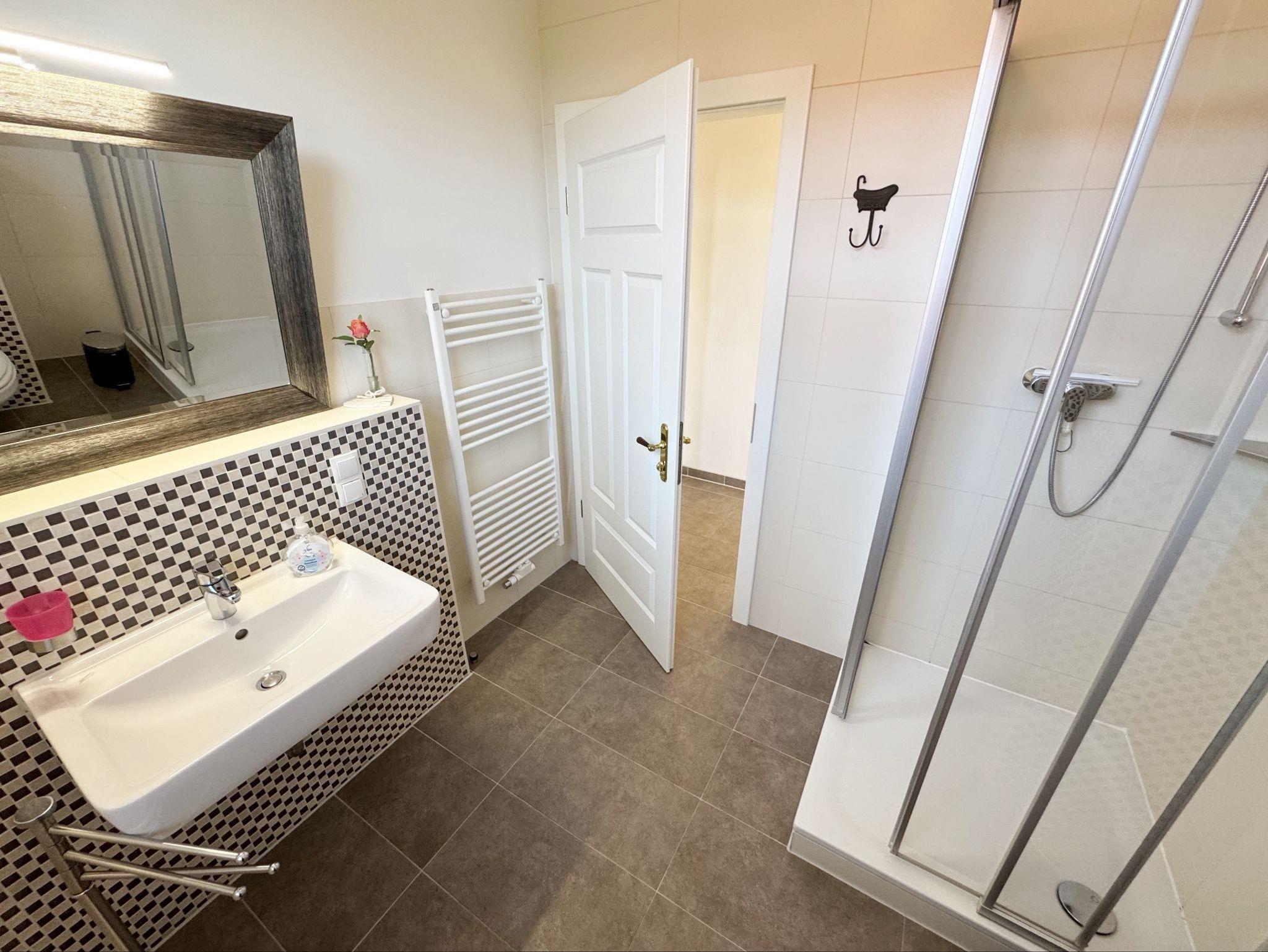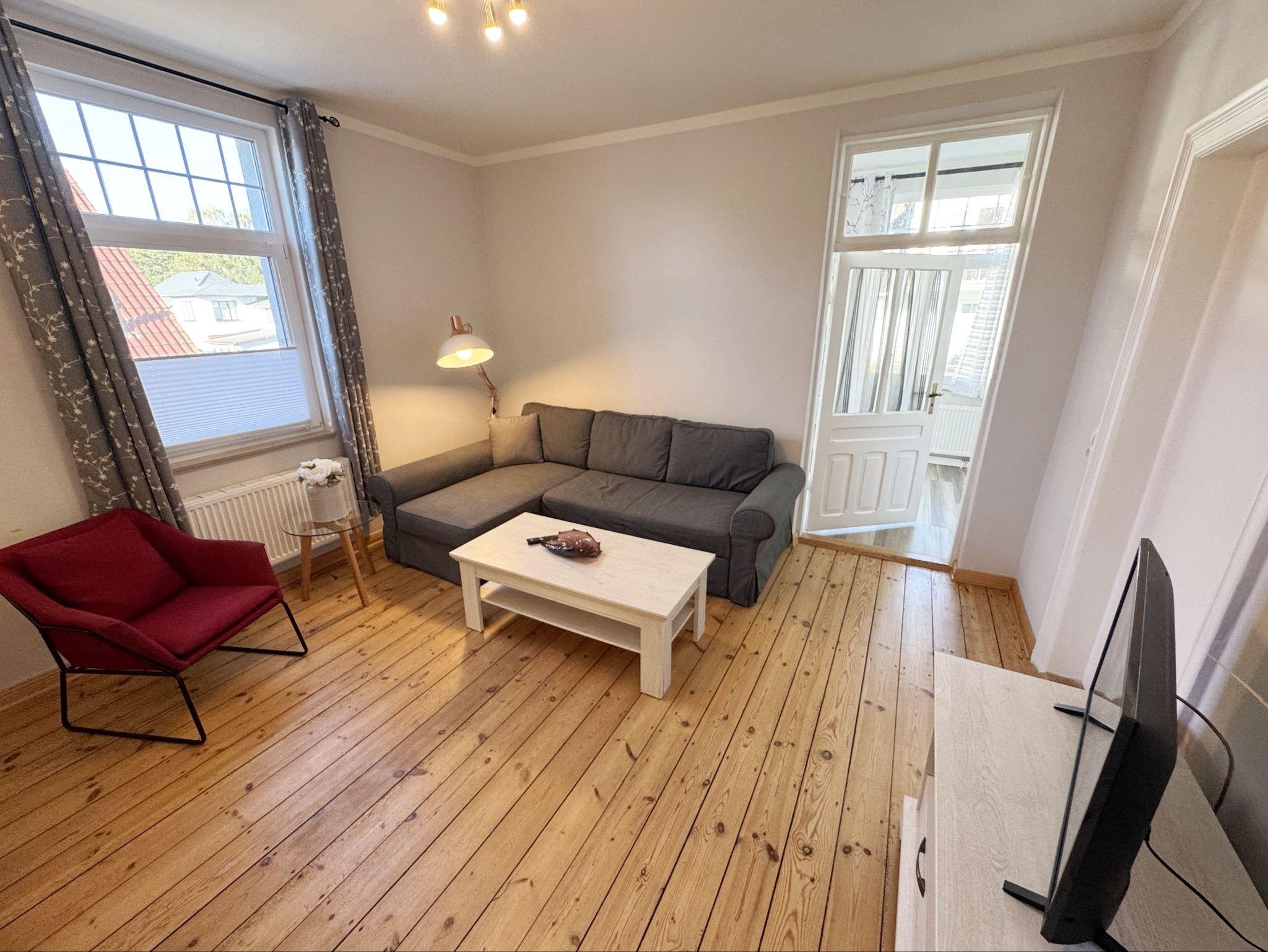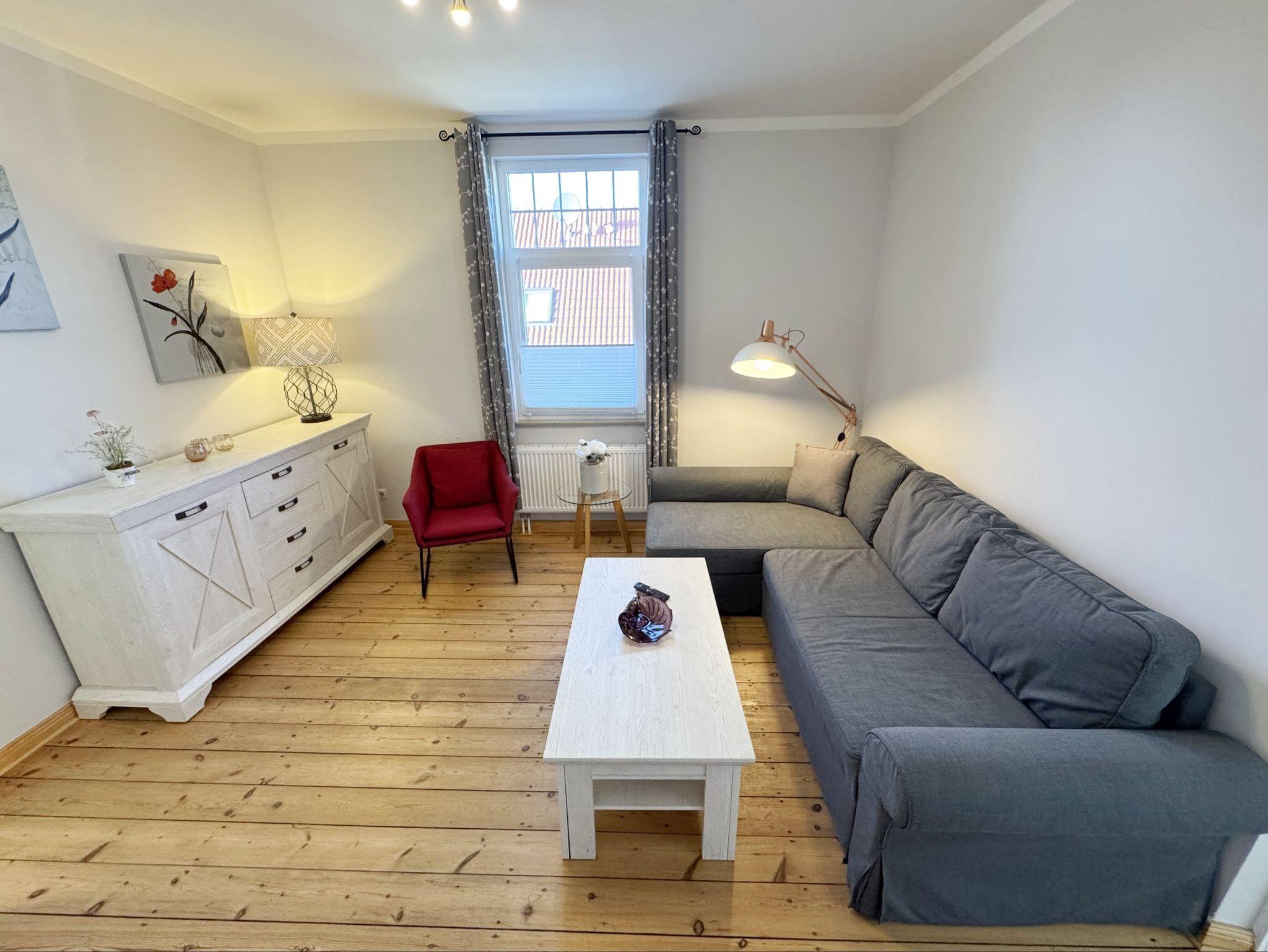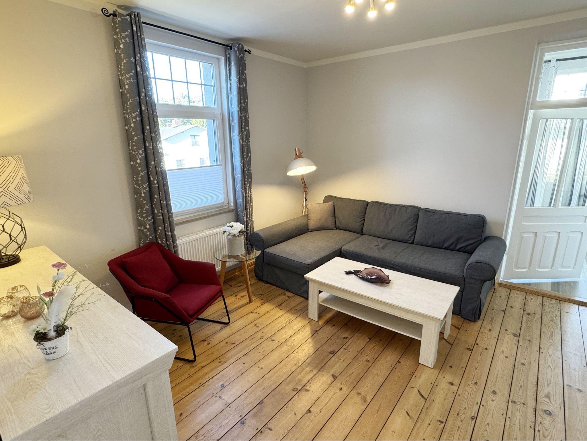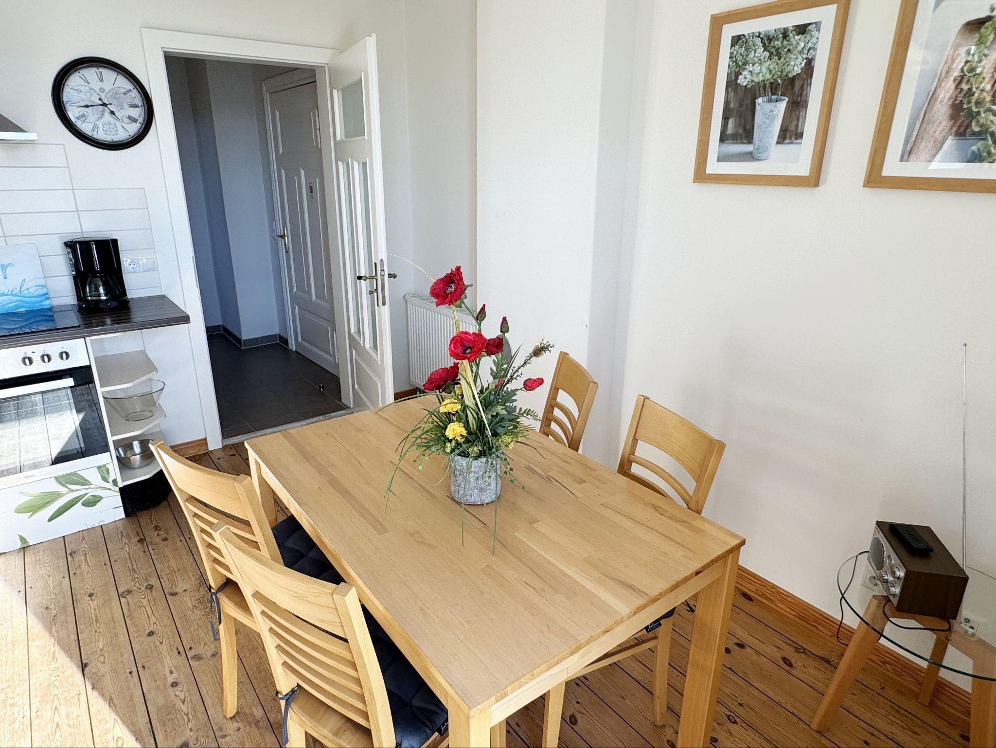 Die Ferienwohnung 3 ?Fischer un sin Fru? umfasst ca. 60 m² und bietet Platz für max. 3 Erwachsene und 1 Kleinkind bis 3 Jahre im Kinderreisebett. Diese Wohnung befindet sich im Obergeschoss des Hauses ?Seestern? und ist eine Nichtraucherwohnung. Sie betreten die Wohnung und ein kleiner Flur mit Garderobe bietet Platz und Stauraum. Von hier aus gelangen Sie in die geräumige Wohnküche, die mit modernen Einbaumöbeln komplett eingerichtet und voll ausgestatteten wurde, Herd mit Ceranfeld, Geschirrspüler, Kühlschrank mit Gefrierfach, Mikrowelle, Kaffeemaschine, Wasserkocher, Toaster sind ebenso vorhanden wie diverse Küchenutensilien. Hier können Sie gemeinsam Ihr Essen zubereiten. Alles was Sie brauchen steht zur Verfügung. Der Essplatz bietet Ihnen Platz zum Essen und zum Verweilen. Auch auf dem angrenzenden geräumigen und bestuhlten Balkon (West) ? Blick Richtung Bodden - finden Sie ausreichend Platz und können hier Ihren Strandtag in der Abendsonne in Ruhe ausklingen lassen. Eine elektrische Markise sorgt für Sonnenschutz. Im Wohnbereich mit Flachbild-TV und Radio mit Bluetooth, finden Sie einen gemütlichen Couchbereich zum Ausruhen (Aufbettungsmöglichkeit für 3. Person 1,40 m x 2,00 m) mit Couchtisch, Lesesessel, Sideboard und Leselampe. Hier schließt sich die Veranda an, die wir zu einem Schlafzimmer mit Boxspringbett (1,80 m x 2,00 m), Kleiderschrank und Sideboard eingerichtet haben. Hier können Sie nun abends vom Bett aus die Sterne betrachten und bei Ostwind die Ostsee rauschen hören. Im Bad mit Fenster wurden hochwertige Fliesen verlegt. Dusche, Waschplatz, Spiegel, Fön, WC und Handtuchheizkörper gehören hier zur Ausstattung. Auch auf Internetanschluss (WLAN) müssen Sie im Urlaub nicht verzichten. Dieser ist inklusive für Sie. Im Wohnzimmer und in der Küche konnten wir den alten Dielenboden erhalten und aufarbeiten. Insektenschutzgitter und Verdunklungsmöglichkeiten sind vorhanden. 2 Haustiere sind gegen eine Gebühr willkommen. Eine Waschmaschine und ein Trockner stehen allen Gästen gegen Gebühr zur Verfügung. Diese Räumlichkeiten befinden sich auf der Hofseite. Für unsere kleinen Gäste stehen je 1 Kinderreisebett (ohne Zusatzmatratze / ohne Bettinlett) und 1 Hochstuhl pro Wohnung inklusive zur Verfügung. Ihr PKW-Stellplatz (Nr. 3) befindet sich auf dem Grundstück sowie ein Gemeinschaftsgrill. Die Erstausstattung eines Wäschepaketes (komplette Bettwäsche, 1 Duschhandtuch, 2 kleine Handtücher) können Sie bis 14 Tage vor Anreise gegen einen Aufpreis dazu buchen oder durch eigene ergänzen. Ab 2 gebuchten Paketen erhalten Sie einmalig 1 Geschirrhandtuch und 1 Duschvorleger hinzu.