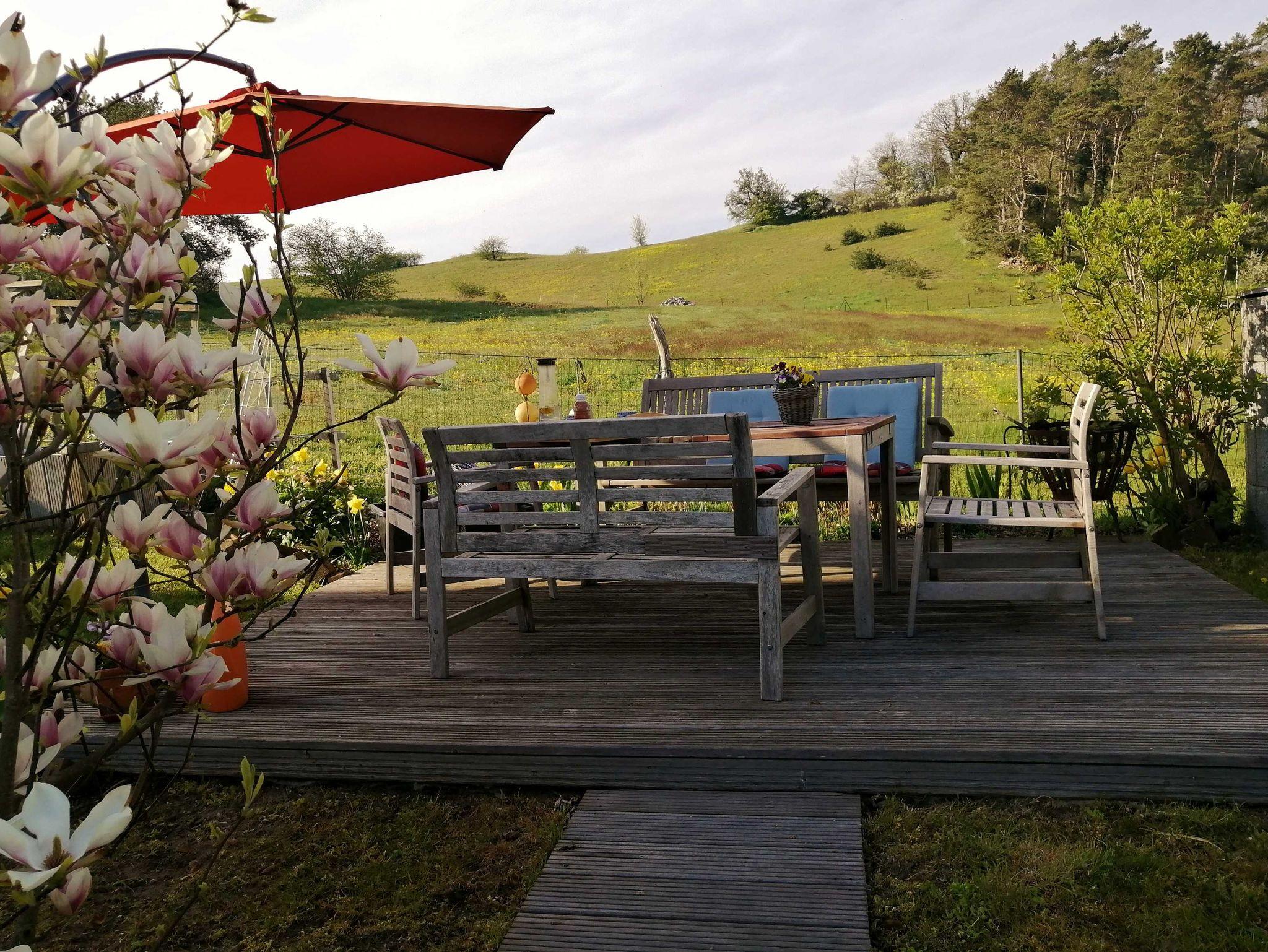 Eine sonnige Terrasse befindet sich direkt im Garten, mit Blick auf den Zicker Berg.