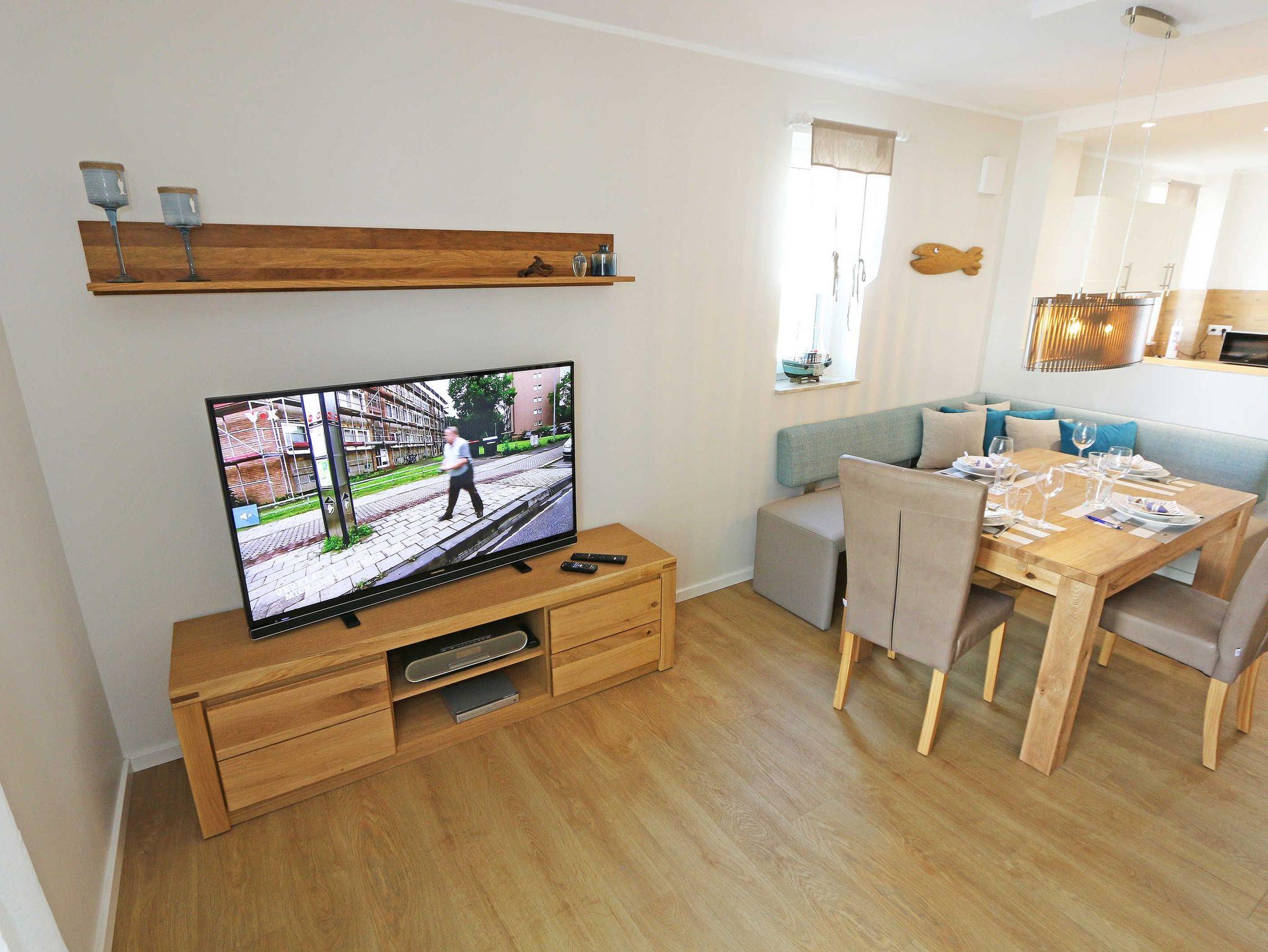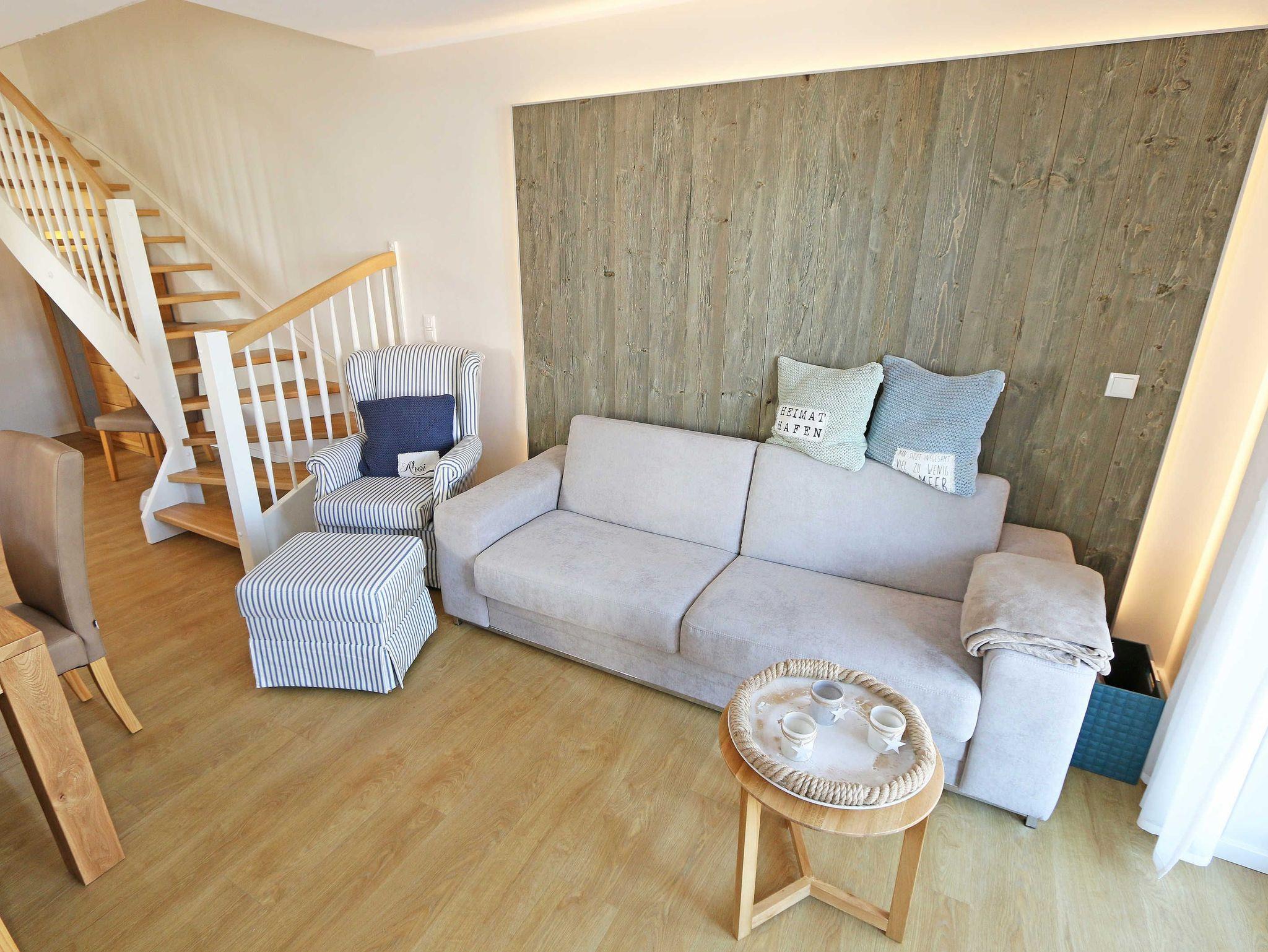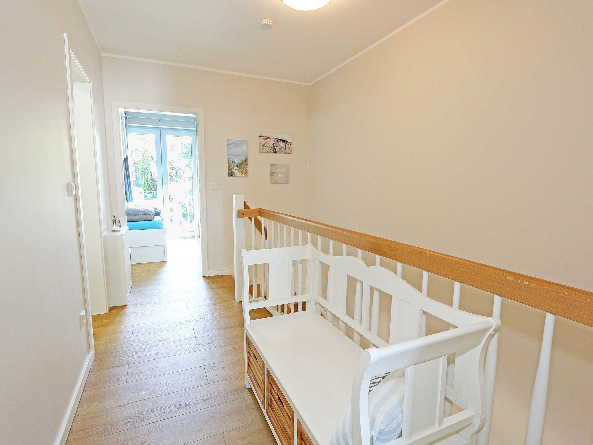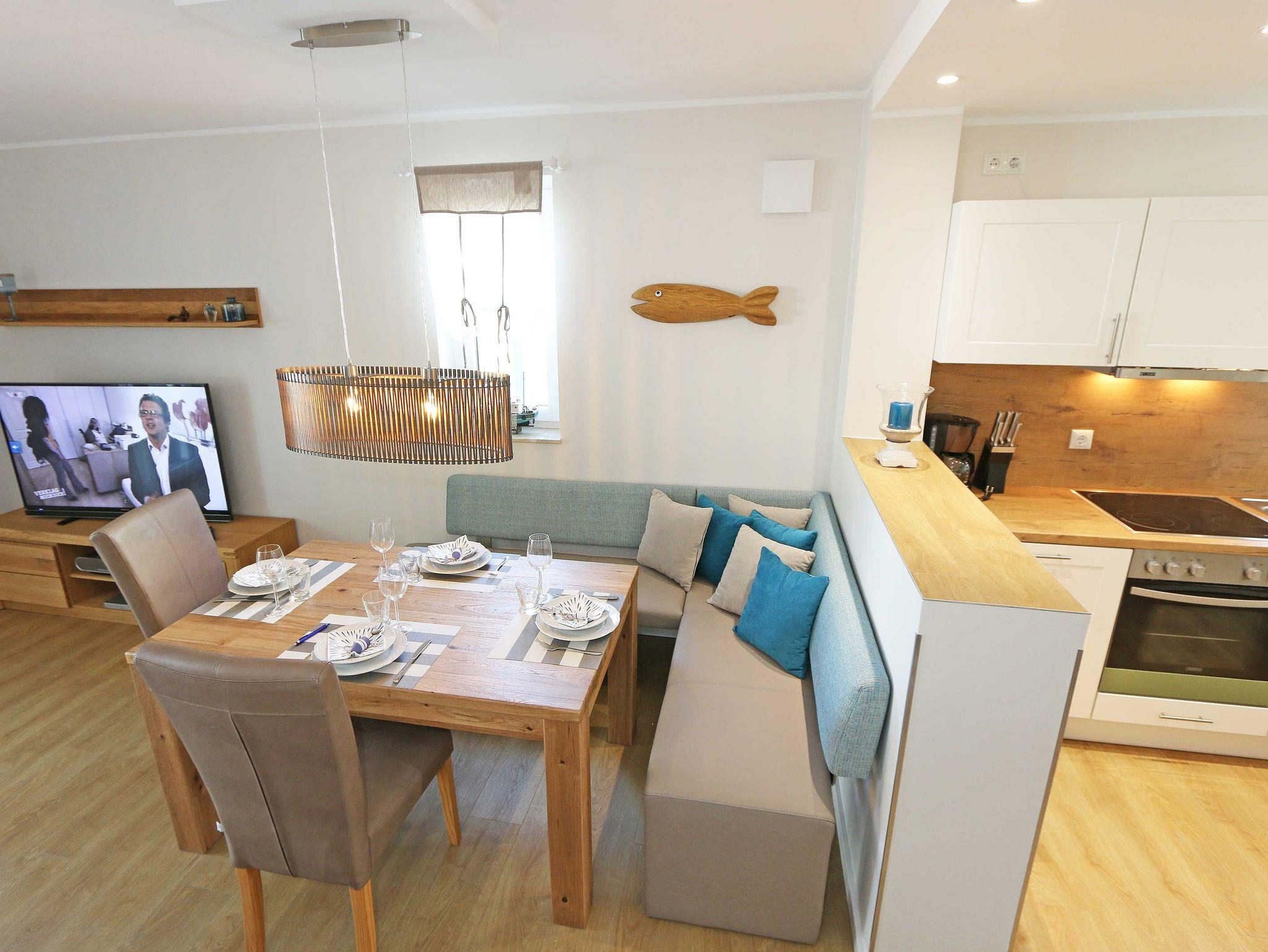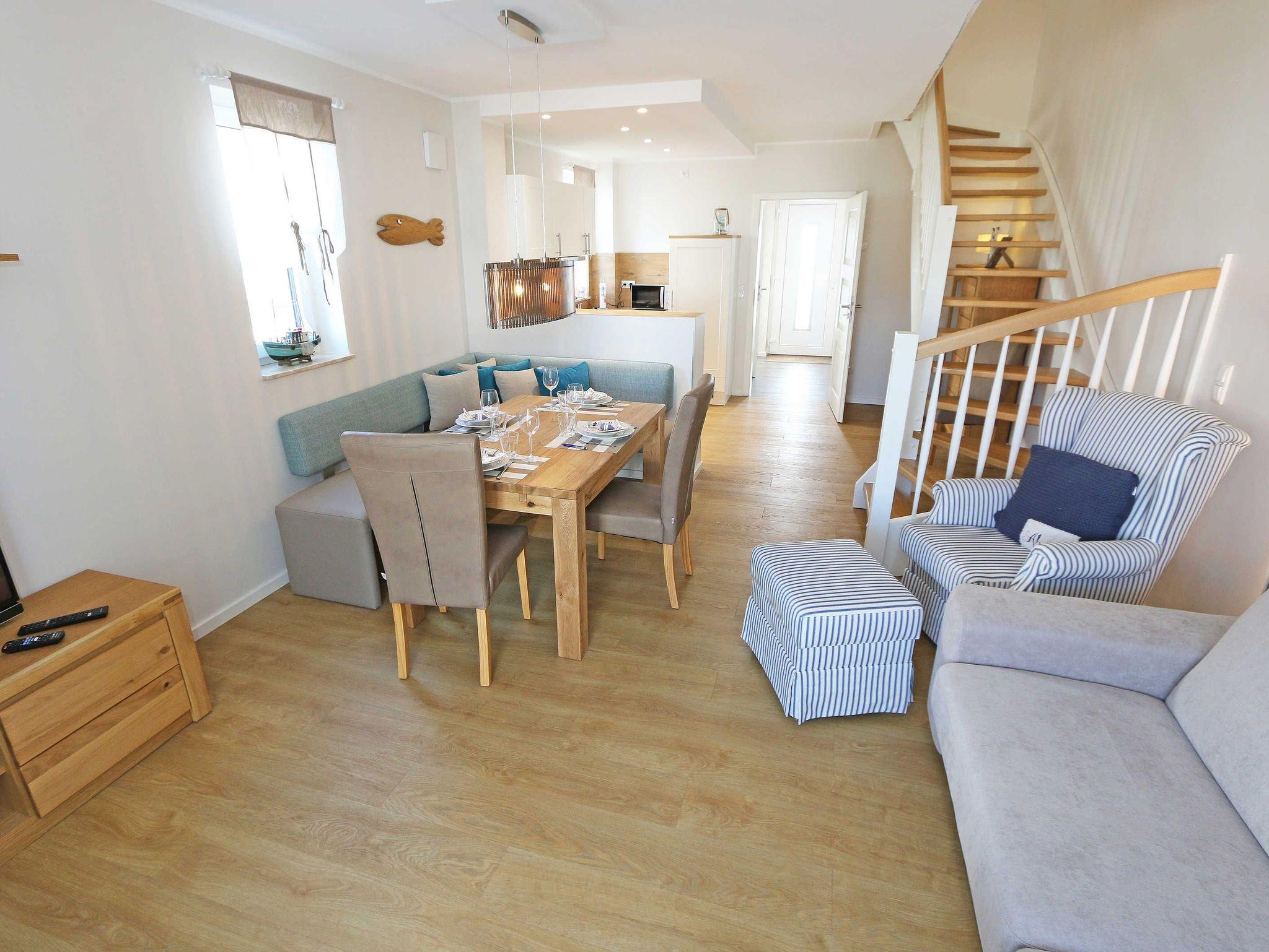 Die 81 qm große Nichtraucherferienwohnung Seehase erstreckt sich über 2 Etagen und bietet Ihnen Platz für 2 bis 4 Personen. Im Erdgeschoss befindet sich ein freundlicher Eingangsbereich mit einer Garderobe und einer Sitzgelegenheit. Daran schließt sich ein Gäste-WC mit Waschplatz. Der offene Wohn-Essbereich ist ausgestattet mit einer gemütlichen Couch, ein Couchtisch, eine Leselampe, ein Lowboard mit großer Smart-TV, mit Blu-Ray-Player, ein DAB-Radio-CD-Player mit USB sowie eine kleine Sammlung an Büchern und Gesellschaftsspielen laden zum Entspannen und Relaxen ein. Auch auf einen Internetzugang (WLAN) müssen Sie im Urlaub nicht verzichten. Dieser ist für Sie inklusive. Im angrenzenden Essbereich steht ein großer Esstisch mit Stühlen und Sitzbank für ein gemütliches Beisammen zur Verfügung. Die offene und integrierte Eck-Küchenzeile mit einem Kühlschrank mit Gefrierfach, einen Geschirrspüler, 4 Zonen Ceranfeld mit Backofen, eine Mikrowelle, eine Kaffeemaschine, Nespresso Maschine, einen Toaster, einen Wasserkocher sowie diverse Küchenutensilien bietet Ihnen somit alles, was man zum Kochen benötigt. Vom Wohnbereich gelangen Sie direkt auf die bestuhlte Terrasse (Süd/West) mit Sonnenschirm. Über eine Treppe vom Wohnbereich gelangen Sie in die obere Etage wo sich die Schlafräume sowie das vollwertige Badezimmer befinden. Das große Schlafzimmer verfügt über ein Boxspringbett (1,80m x 2,00m), mit Nachttischablagen und einem großen Kleiderschrank. Von hier haben Sie den direkten Zugang zum Balkon (Süd/West) wo Sie nicht nur am Tag, sondern auch in den Abendstunden in der Relax Muschel Zeit verbringen können. Das kleine Schlafzimmer ist mit einem Doppelbett (1,60m x 2,00m) und zwei kleinen Schränken sowie ein Flachbild-TV ausgestattet. Das moderne Tageslichtbad mit Waschplatz, WC, Fön, Kosmetikspiegel, einer ebenerdigen Glasdusche und einem Handtuchtrockner runden den Sanitärbereich ab. Alle Räumlichkeiten sind mit einer Fußbodenheizung ausgestattet und können durch Fensterläden verdunkelt werden. Der PKW kann auf dem kostenfreien Stellplatz (Nr.01) direkt vor dem Haus geparkt werden. Gerne dürfen Sie 1 Hund gegen eine Gebühr mitbringen. Da kein Schlafplatz (Körbchen, Decke, etc.) vorhanden ist, bringen Sie bitte Ihr eigenes ?Bettchen? für den Hund mit. Direkt am Haus befindet sich ein Grillplatz mit Sitzgelegenheiten. Ihre mitgebrachten oder geliehenen Fahrräder können Sie in den zur Wohnung gehörenden Abstellraum unterbringen. Die Erstausstattung eines Wäschepaketes (komplette Bettwäsche, 1 Duschhandtuch, 2 kleine Handtücher) können Sie bis 14 Tage vor Anreise gegen einen Aufpreis dazu buchen oder durch eigene ergänzen. Ab 2 gebuchten Paketen erhalten Sie einmalig 1 Geschirrhandtuch und 1 Duschvorleger hinzu. Wir wünschen Ihnen einen traumhaften Urlaub an der Ostsee, erholen Sie sich gut und genießen Sie die Zeit.