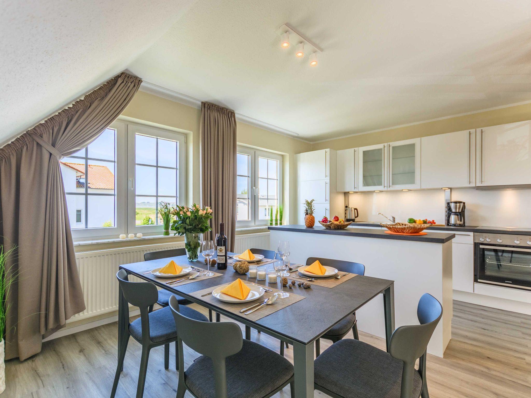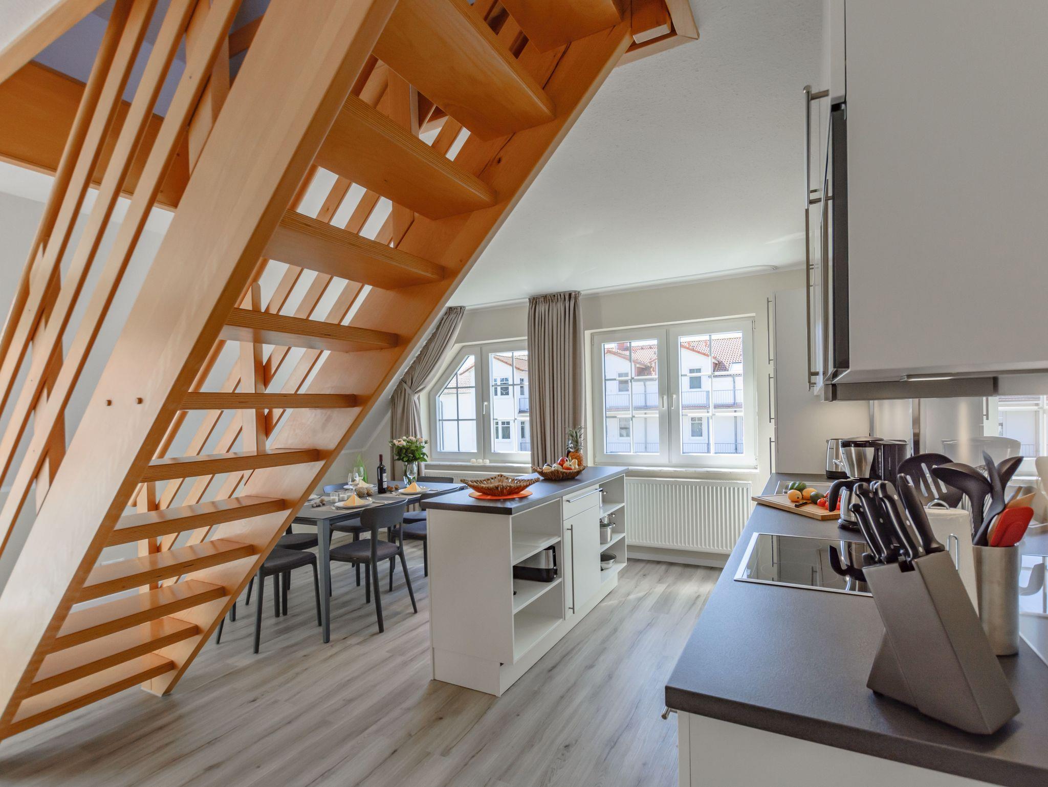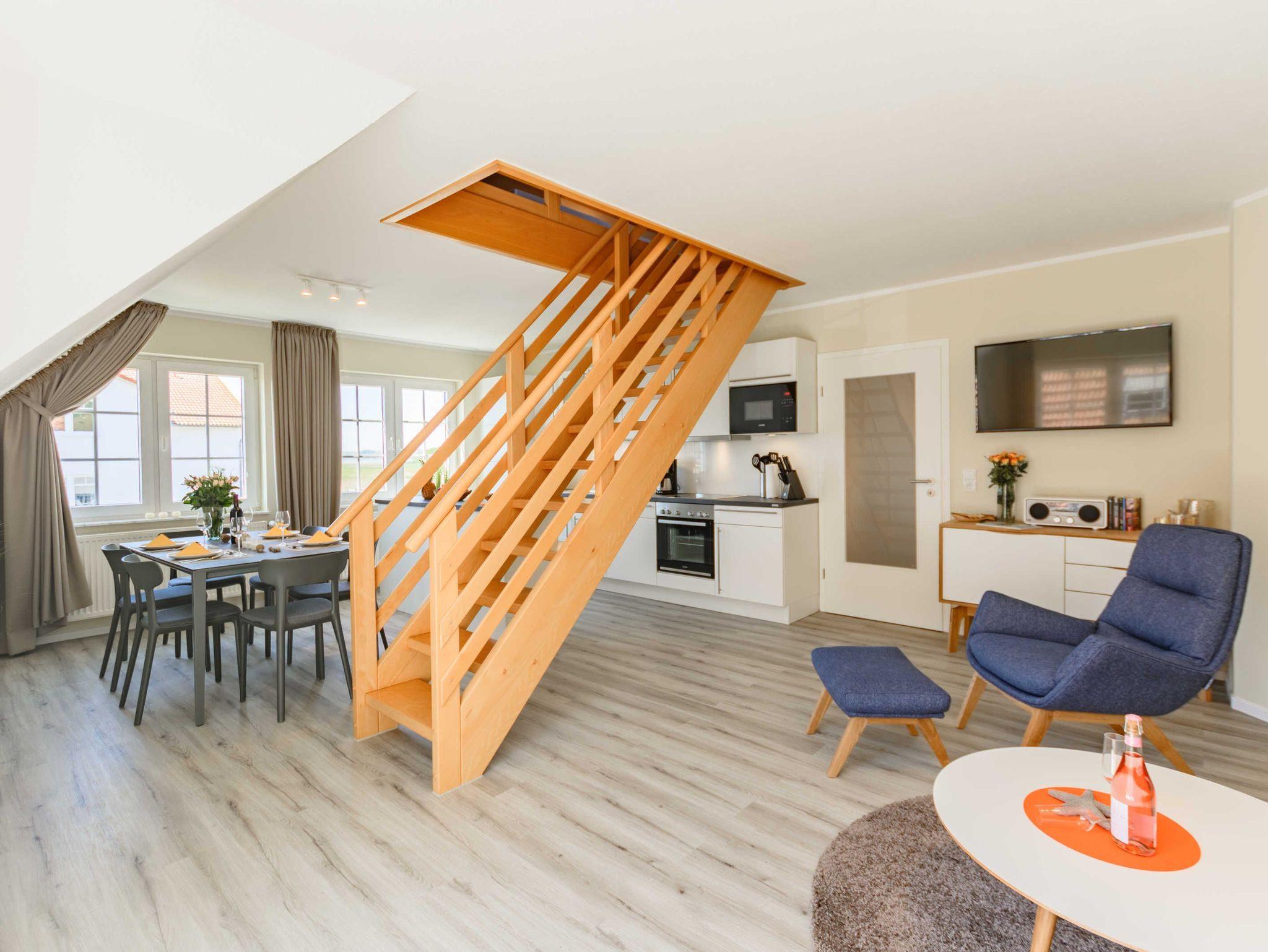 Die Nichtraucherferienwohnung befindet sich in der 1. Etage und erstreckt sich über 2 Etagen. Mit Ihren ca. 75 qm können sich max. 6 Erwachsene wohlfühlen. Der großzügige und helle Wohn- Essbereich ist mit einer modernen Küchenzeile ausgestattet. Mit einem Kühlschrank mit Eisfach, Geschirrspüler, Cerankochfeld, Backofen, Mikrowelle, Wasserkocher, Kaffeemaschine, Toaster, Mixer, Waffeleisen können Sie Ihre gemütlichen Kochabende ganz individuell gestalten. Ein passender Essbereich rundet die Gemütlichkeit ab. Im angrenzenden Wohnbereich trägt eine bequeme Couch (Aufbettungsmöglichkeit für 5./6.Person, 1,50m x 1,95m) mit Couchtisch, ein Lesesessel mit Hocker sowie ein TV-Board zu Ihrer Entspannung bei. Die technische Ausstattung umfasst einen Smart-TV, ein DAB-Bluetooth-Radio sowie einen WLAN-Anschluss. Vom Wohnbereich gelangen Sie auf Ihren bestuhlten Balkon (Süd), von wo Sie aus Ihren Tag entspannt bei einem Glas Wein ausklingen lassen können. Hell und freundlich eingerichtet erwartet Sie ein gemütliches Schlafzimmer auf gleicher Ebene, mit einem komfortablen Boxspring-Bett (1,80m x 2,00m) mit 5 Zonen Tonnen-Taschenfederkern-Matratzen, Nachttischablagen, einen großzügigen Kleiderschrank sowie ein Smart-TV. Das 2. Schlafzimmer erreichen Sie durch eine Treppe, welche vom Wohnbereich aus startet. Hier befindet sich ebenfalls ein bequemes Boxspringbett (1,80m x 2,00m) mit Nachttischablagen sowie einer kleinen Leseecke oder Relax-Ecke. Beide Schlafbereiche verfügen zudem über Vorhänge/Rollos, die nahezu lichtundurchlässig sind und einen guten Sicht- und Sonnenschutz bieten. Für einen angenehmen Schlaf sorgen zusätzlich Insektenschutzgitter im Wohn- & Schlafbereich. Das Tageslicht-Badezimmer ist mit einer ebenerdigen Dusche, einem WC, einen Handtuchtrockner, einem Fön sowie einem Waschtisch ausgestattet. In der Wohnung finden Sie zusätzlich ein Staubsauger, ein Besen mit Kehrset, ein Wäscheständer sowie ein Wäschekorb. Im Nachbarhaus C können Sie eine Waschmaschine sowie einen Trockner gegen Gebühr nutzen. Hier stehen auch ein Bügelbrett und ein Bügeleisen zur Verfügung. Haustiere sind nicht erlaubt. Das Grillen auf dem ausgewiesenen Gemeinschaftsplatz lädt zu gemütlichen Abenden ein. Zur Entspannung lädt eine münzbetriebene Sauna mit kleinem Ruheraum im Untergeschoss von Haus B ein. Ihre Fahrräder können Sie begrenzt im Gemeinschaftskeller oder auf dem Grundstück abstellen. Die Erstausstattung eines Wäschepaketes (komplette Bettwäsche, 1 Duschhandtuch, 2 kleine Handtücher) können Sie bis 14 Tage vor Anreise gegen einen Aufpreis dazu buchen oder durch eigene ergänzen. Ab 2 gebuchten Paketen erhalten Sie einmalig 1 Geschirrhandtuch und 1 Duschvorleger hinzu.
