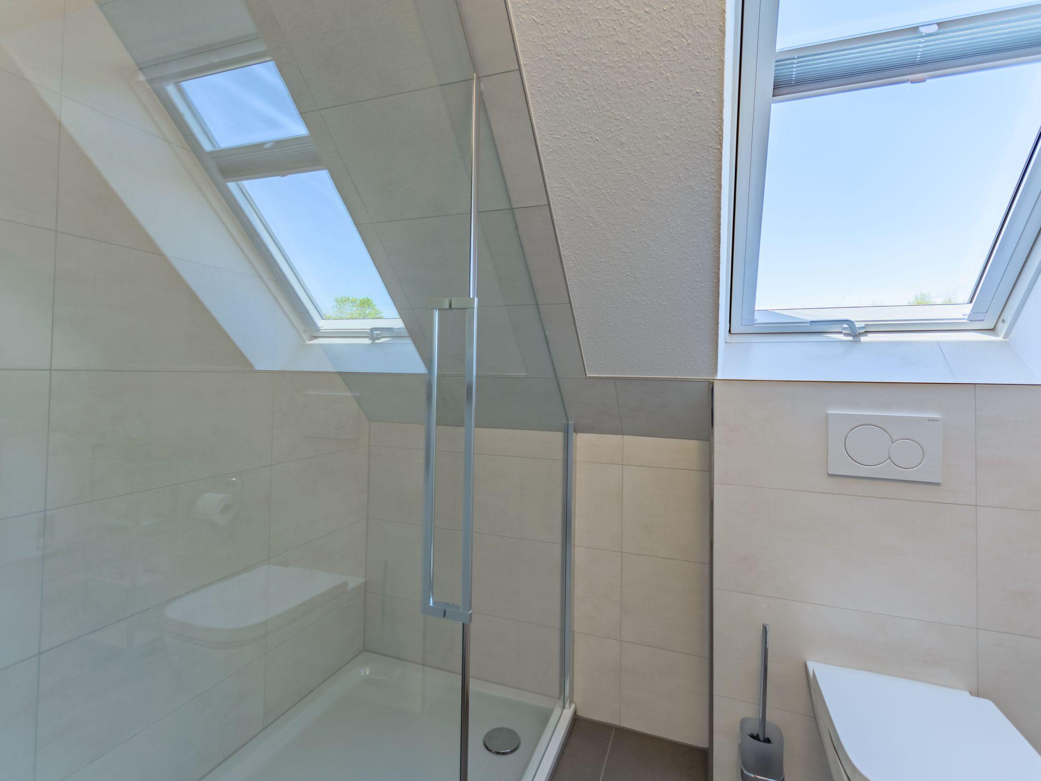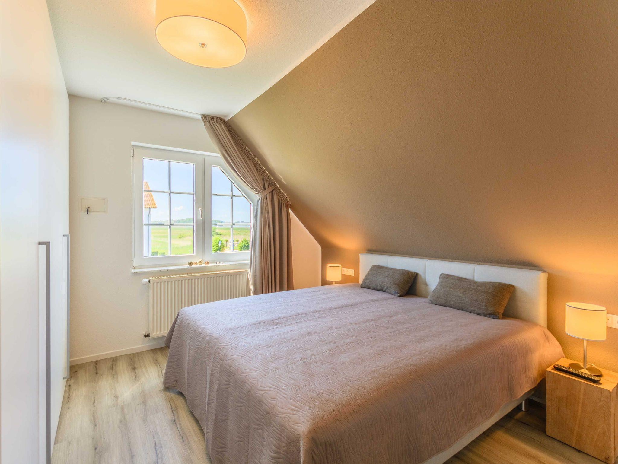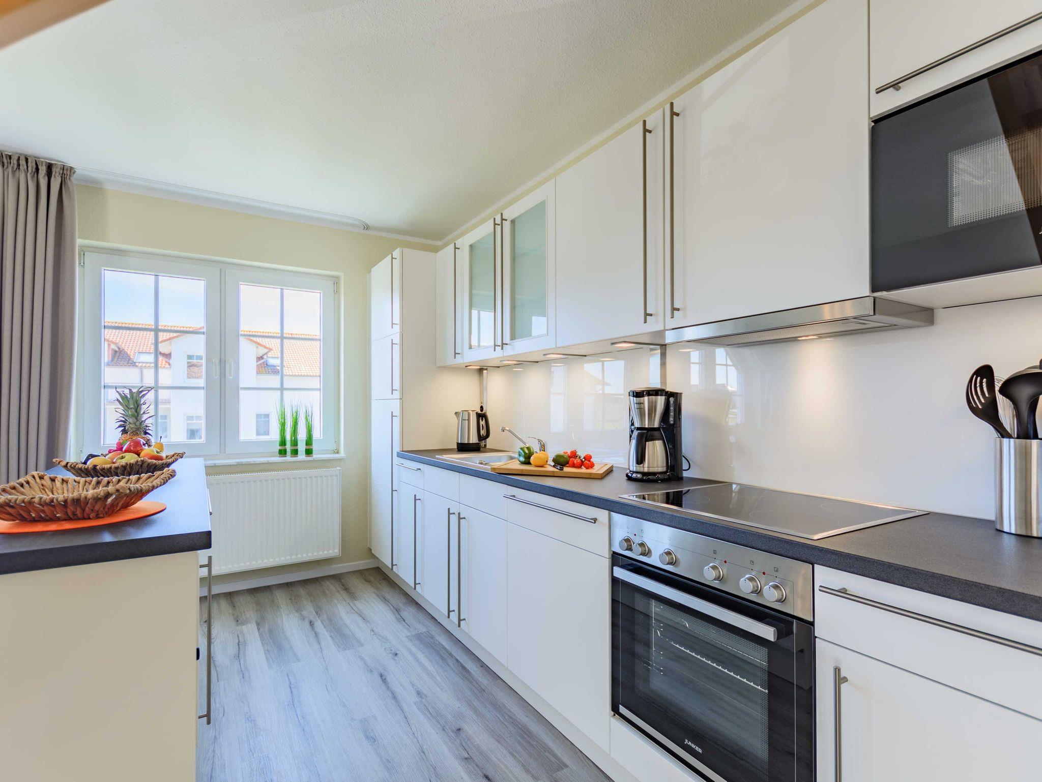 Die Nichtraucherferienwohnung befindet sich in der 1. Etage und erstreckt sich über 2 Etagen. Mit Ihren ca. 75 qm können sich max. 6 Erwachsene wohlfühlen. Der großzügige und helle Wohn- Essbereich ist mit einer modernen Küchenzeile ausgestattet. Mit einem Kühlschrank mit Eisfach, Geschirrspüler, Cerankochfeld, Backofen, Mikrowelle, Wasserkocher, Kaffeemaschine, Toaster, Mixer, Waffeleisen können Sie Ihre gemütlichen Kochabende ganz individuell gestalten. Ein passender Essbereich rundet die Gemütlichkeit ab. Im angrenzenden Wohnbereich trägt eine bequeme Couch (Aufbettungsmöglichkeit für 5./6.Person, 1,50m x 1,95m) mit Couchtisch, ein Lesesessel mit Hocker sowie ein TV-Board zu Ihrer Entspannung bei. Die technische Ausstattung umfasst einen Smart-TV, ein DAB-Bluetooth-Radio sowie einen WLAN-Anschluss. Vom Wohnbereich gelangen Sie auf Ihren bestuhlten Balkon (Süd), von wo Sie aus Ihren Tag entspannt bei einem Glas Wein ausklingen lassen können. Hell und freundlich eingerichtet erwartet Sie ein gemütliches Schlafzimmer auf gleicher Ebene, mit einem komfortablen Boxspring-Bett (1,80m x 2,00m) mit 5 Zonen Tonnen-Taschenfederkern-Matratzen, Nachttischablagen, einen großzügigen Kleiderschrank sowie ein Smart-TV. Das 2. Schlafzimmer erreichen Sie durch eine Treppe, welche vom Wohnbereich aus startet. Hier befindet sich ebenfalls ein bequemes Boxspringbett (1,80m x 2,00m) mit Nachttischablagen sowie einer kleinen Leseecke oder Relax-Ecke. Beide Schlafbereiche verfügen zudem über Vorhänge/Rollos, die nahezu lichtundurchlässig sind und einen guten Sicht- und Sonnenschutz bieten. Für einen angenehmen Schlaf sorgen zusätzlich Insektenschutzgitter im Wohn- & Schlafbereich. Das Tageslicht-Badezimmer ist mit einer ebenerdigen Dusche, einem WC, einen Handtuchtrockner, einem Fön sowie einem Waschtisch ausgestattet. In der Wohnung finden Sie zusätzlich ein Staubsauger, ein Besen mit Kehrset, ein Wäscheständer sowie ein Wäschekorb. Im Nachbarhaus C können Sie eine Waschmaschine sowie einen Trockner gegen Gebühr nutzen. Hier stehen auch ein Bügelbrett und ein Bügeleisen zur Verfügung. Haustiere sind nicht erlaubt. Das Grillen auf dem ausgewiesenen Gemeinschaftsplatz lädt zu gemütlichen Abenden ein. Zur Entspannung lädt eine münzbetriebene Sauna mit kleinem Ruheraum im Untergeschoss von Haus B ein. Ihre Fahrräder können Sie begrenzt im Gemeinschaftskeller oder auf dem Grundstück abstellen. Die Erstausstattung eines Wäschepaketes (komplette Bettwäsche, 1 Duschhandtuch, 2 kleine Handtücher) können Sie bis 14 Tage vor Anreise gegen einen Aufpreis dazu buchen oder durch eigene ergänzen. Ab 2 gebuchten Paketen erhalten Sie einmalig 1 Geschirrhandtuch und 1 Duschvorleger hinzu.
