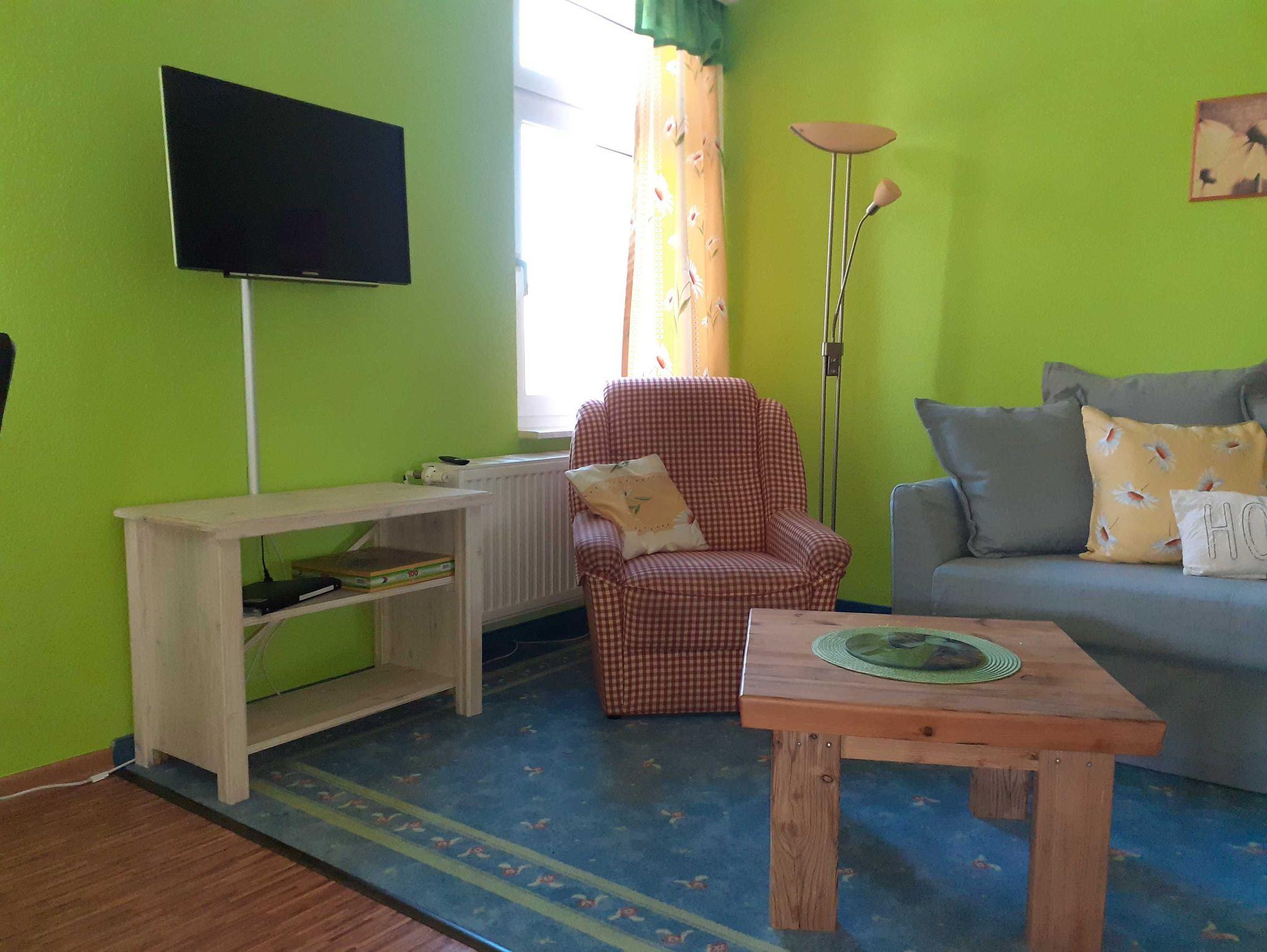2-4 Pers.: 2-Zimmer-Wohnung mit 37 qm Wohnfläche, 1. Etage. Wohn-/Essraum mit Couchgarnitur (Ausziehcouch 2 Pers.), Esstisch, Küchenzeile (2 P. E-Herd, Spülmaschine, Minibackofen, Kaffeemaschine, Wasserkocher, 8-Set-Ess-Geschirr und Besteck, kleine Auswahl an Gläsern, kleine Topfsammlung, ein paar kleine Küchenhelfer --- Grundausstattung!!!)). Doppelbett, Couchgarnitur (Ausziehcouch 2 Personen). Bad/WC.
