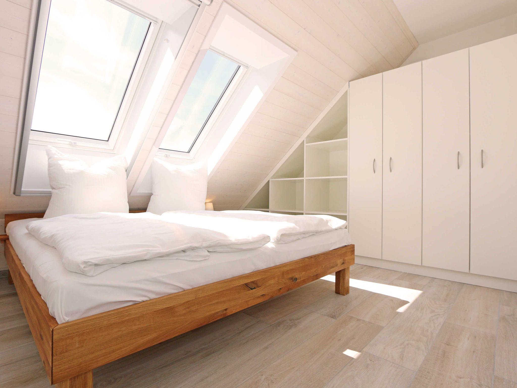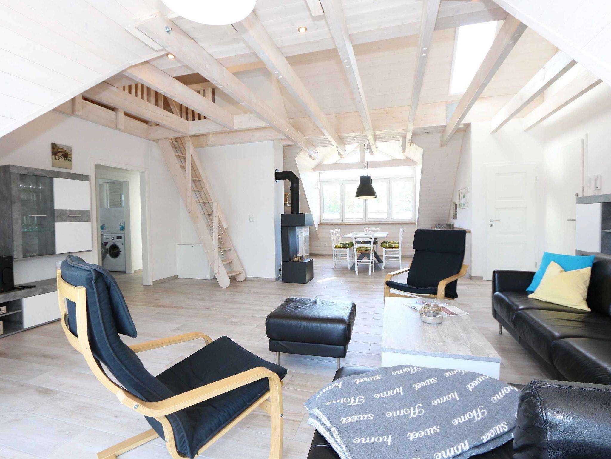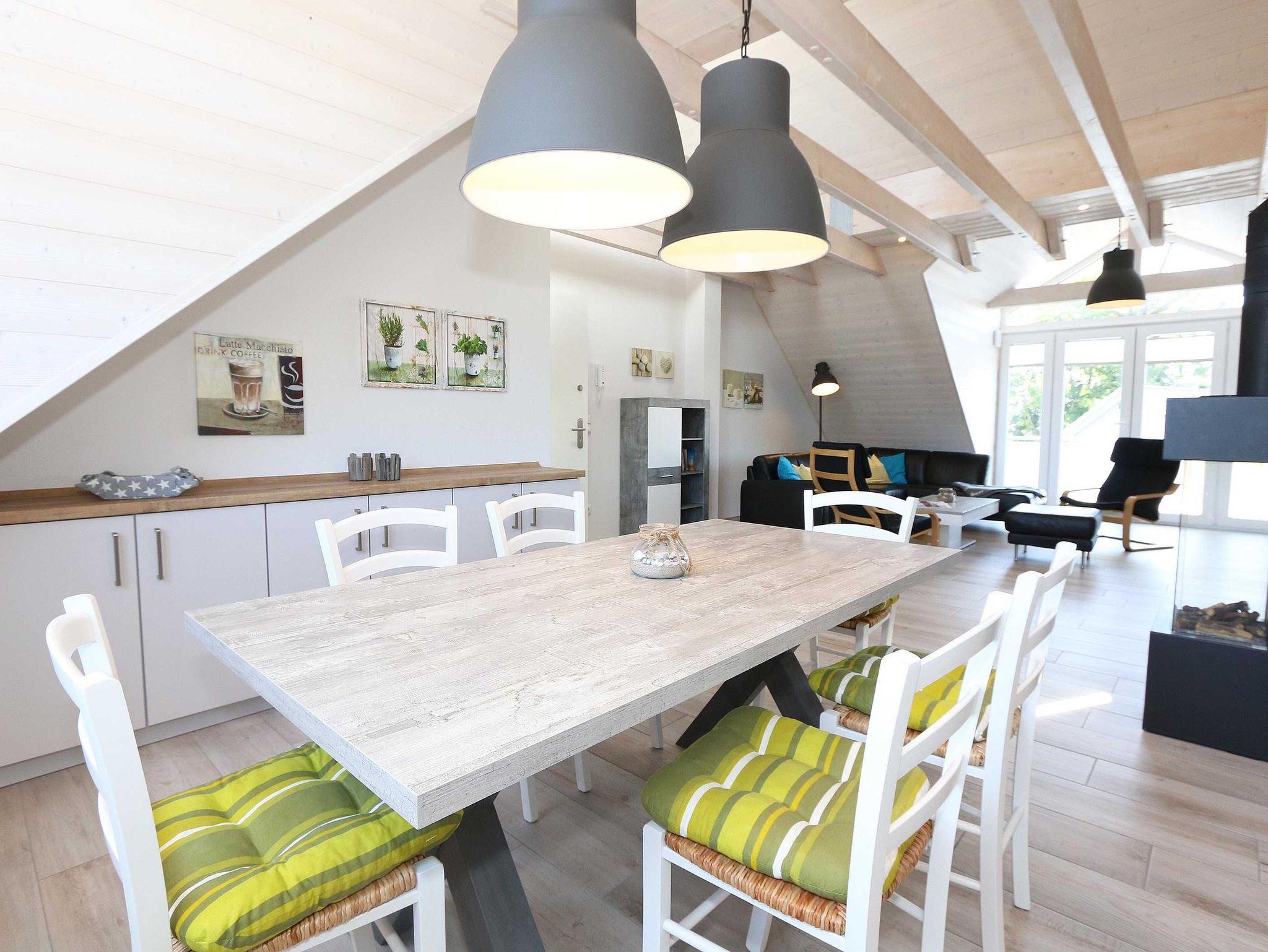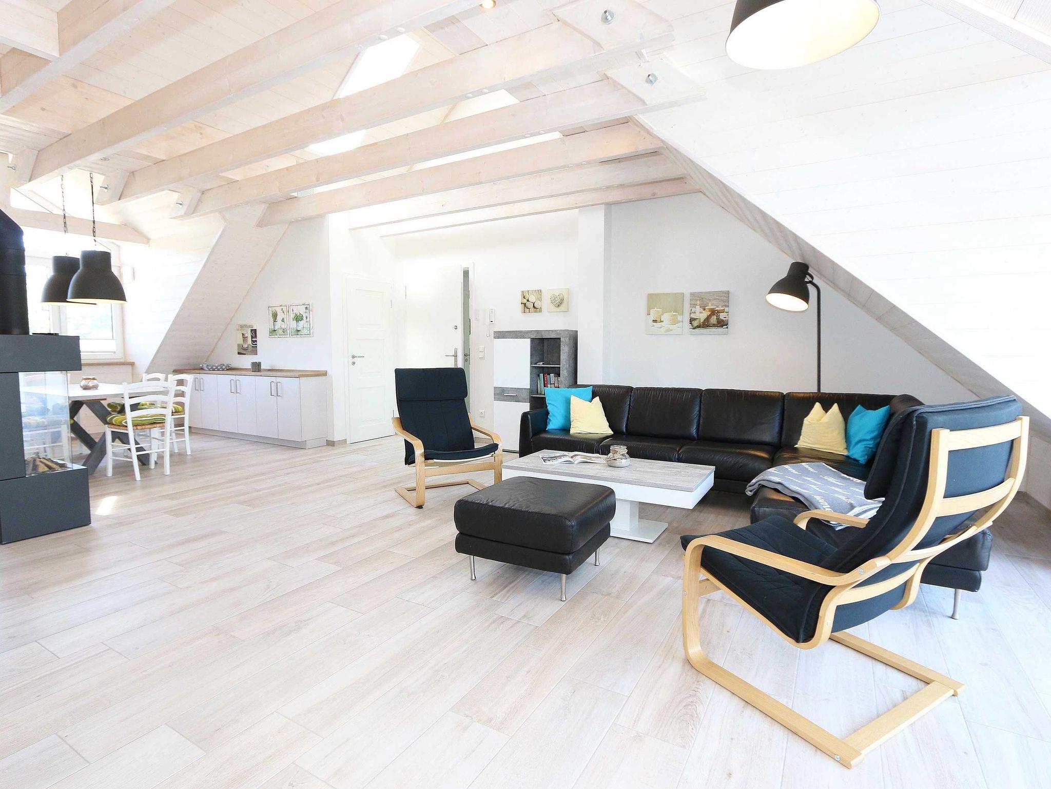 Die im nordischen Stil eingerichtete Nichtraucherwohnung mit 89 m² findet sich in der 2. Etage. Sie ist lichtdurchflutet und geprägt durch Holzschrägen, dicke naturbelassene Holzbalken, die einen Blick in den First zulassen. Die Ferienwohnung ?Seestern? ist für max. 6 Erwachsene und 1 Kleinkind bis 3 Jahre im Kinderreisebett bestens geeignet. Sie ist modern eingerichtet mit einem großen Ledersofa, Leselampe, 2 Relax-Sessel und einem Lowboard mit Smart-TV, Soundanlage, Blue Ray-Player und Radio mit CD-Player. Auch im Urlaub brauchen Sie auf einen Internetanschluss (WLAN) nicht verzichten. Dieser ist für Sie inklusive. An kühleren Tagen sorgt ein Gaskamin für angenehme Wärme. Vom Wohnbereich gelangen Sie auf den großen und bestuhlten Balkon (Süd) mit Sonnenschirm, auf dem Sie bei einem gemütlichen Frühstück Ihren Urlaubstag in Ruhe beginnen können. Bei der offenen Einbauküche müssen Sie auf nichts verzichten. Vom Geschirrspüler, Backofen, 4-Zonen-Cerankochfeld, Kühlschrank mit Gefrierkombination, Mikrowelle, Kaffeemaschine, Toaster, Wasserkocher bis hin zu vielen Küchenhelfern. Vom großen Esstisch, an dem 6 Personen Platz finden, genießen Sie einen Blick in ein Wäldchen, hinter welchem sich die Ostsee befindet. 2 Schlafzimmer verfügen über eingebaute Kleiderschränke sowie je ein Doppelbett (1,80 m x 2,00 m) mit Nachttischablagen, welche für Entspannung sorgen und erholt in den nächsten Urlaubstag schlafen lassen. An ein Schlafzimmer schließt sich ein En Suite Tageslichtbad mit WC, Waschplatz, Kosmetikspiegel, Fön und Dusche an. Das größere Tageslichtbad mit Infrarotsauna verfügt unter anderem auch über einen Wasch- und Trockenautomat, WC, Waschtisch, Fön sowie eine Dusche. Ein weiteres Highlight ist ein offener, durch ein Geländer abgegrenzter Schlafboden im Gebälk (Höhe 1,52 m), der über eine Raumspartreppe aus dem Wohnbereich erreicht wird. Dort befinden sich zwei große Einzelbetten (0,90 m x 2,00 m). Insektenschutzgitter sind vorhanden. In der Zeit vom 01. Juni - 31. August sind der Kamin und die Sauna nicht zu nutzen! Für unsere kleinen Gäste stehen 1x Kinderreisebett (ohne Zusatzmatratze, ohne Bettinlett) sowie 1x Hochstuhl (ohne Gurt) inklusive zur Verfügung. Im abschließbaren Nebengebäude können Sie Ihre Fahrräder sicher unterstellen. Ihren PKW können Sie auf dem zur Wohnung gehörenden Stellplatz (Nr. 9) direkt am Haus abstellen. Ein Grillplatz für alle Hausgäste ist vorhanden. Haustiere sind leider nicht erlaubt. Die Erstausstattung eines Wäschepaketes (komplette Bettwäsche, 1 Duschhandtuch, 2 kleine Handtücher) können Sie bis 14 Tage vor Anreise gegen einen Aufpreis dazu buchen oder durch eigene ergänzen. Ab 2 gebuchten Paketen erhalten Sie einmalig 1 Geschirrhandtuch und 1 Duschvorleger hinzu.