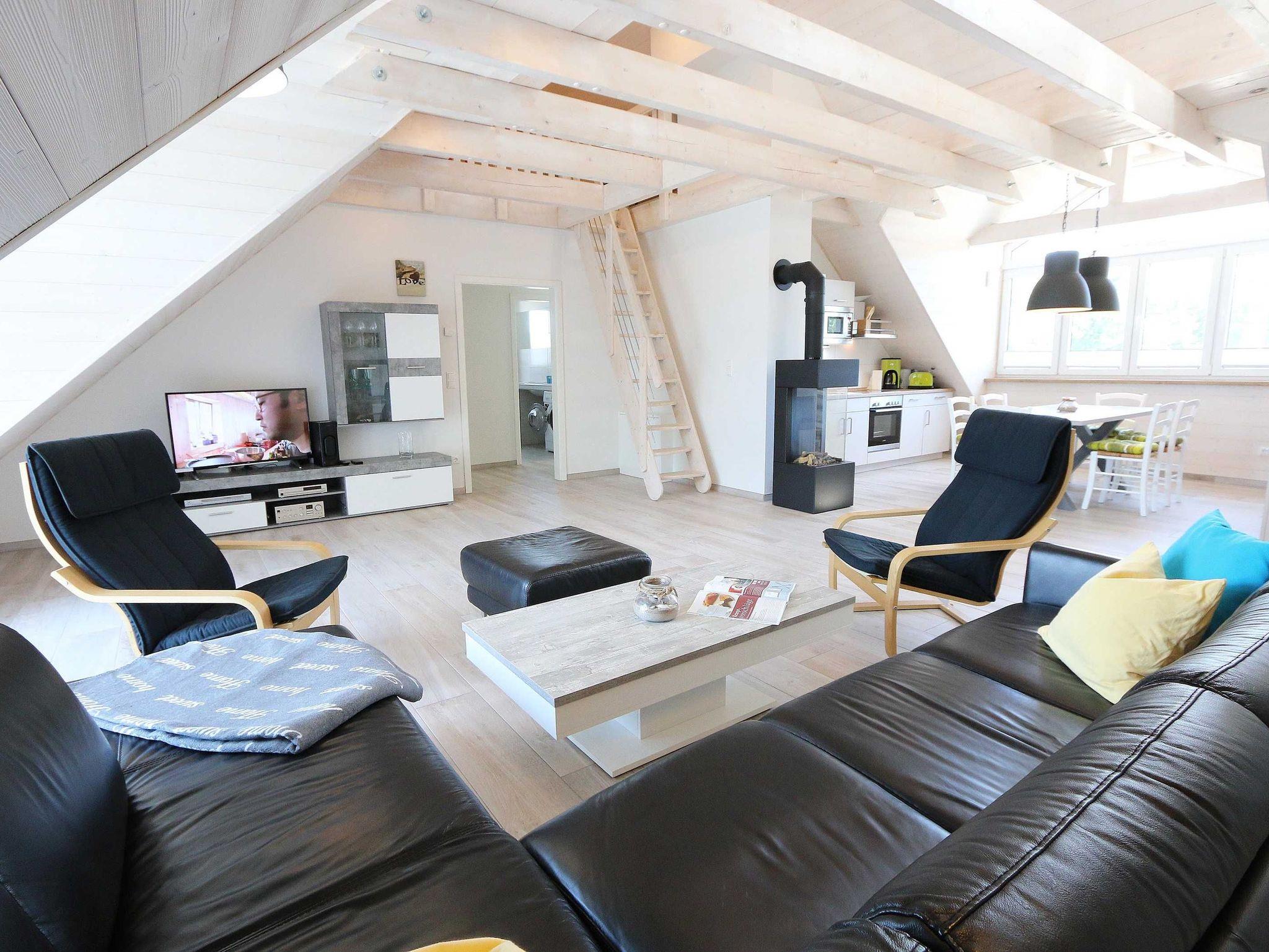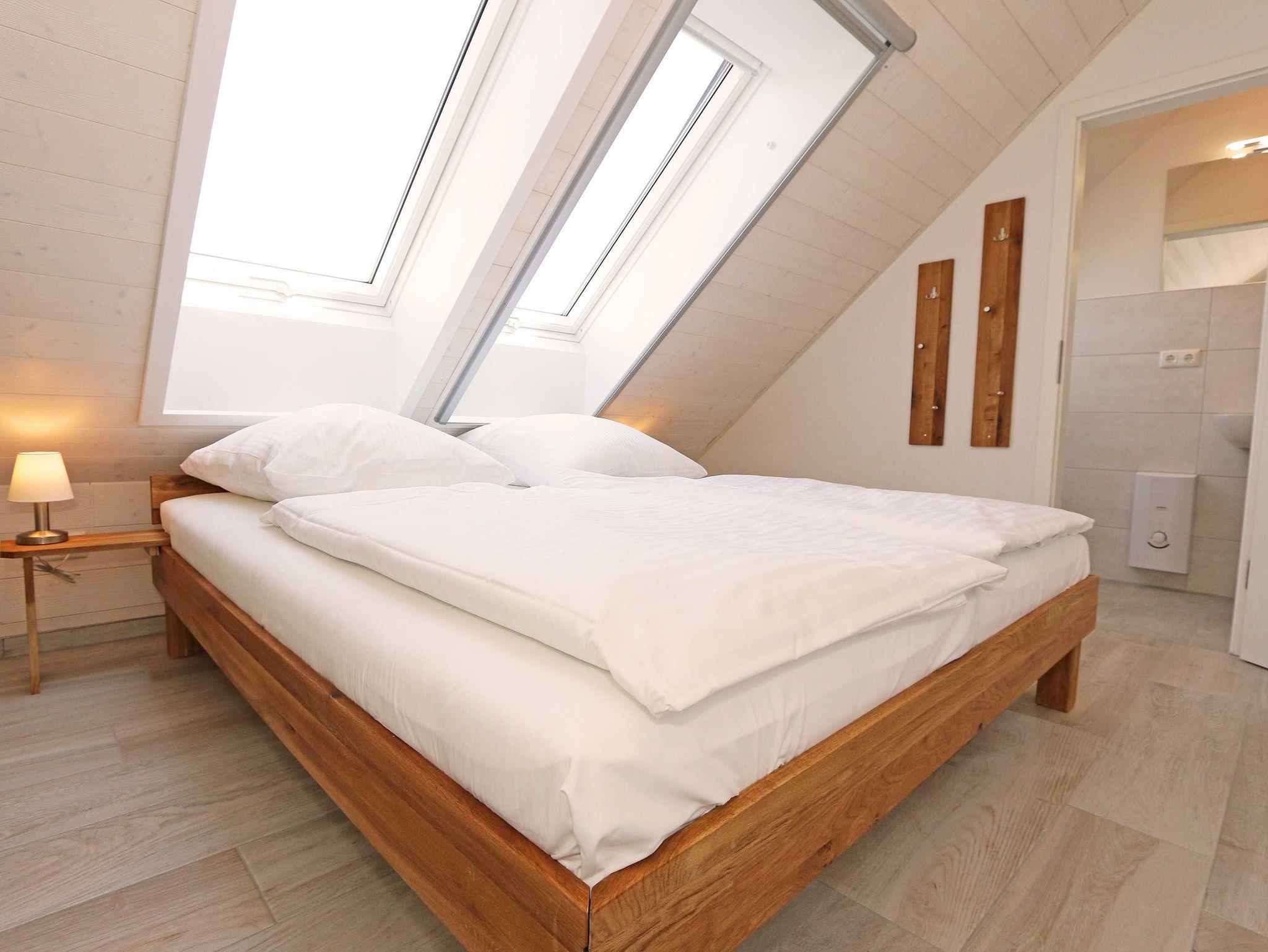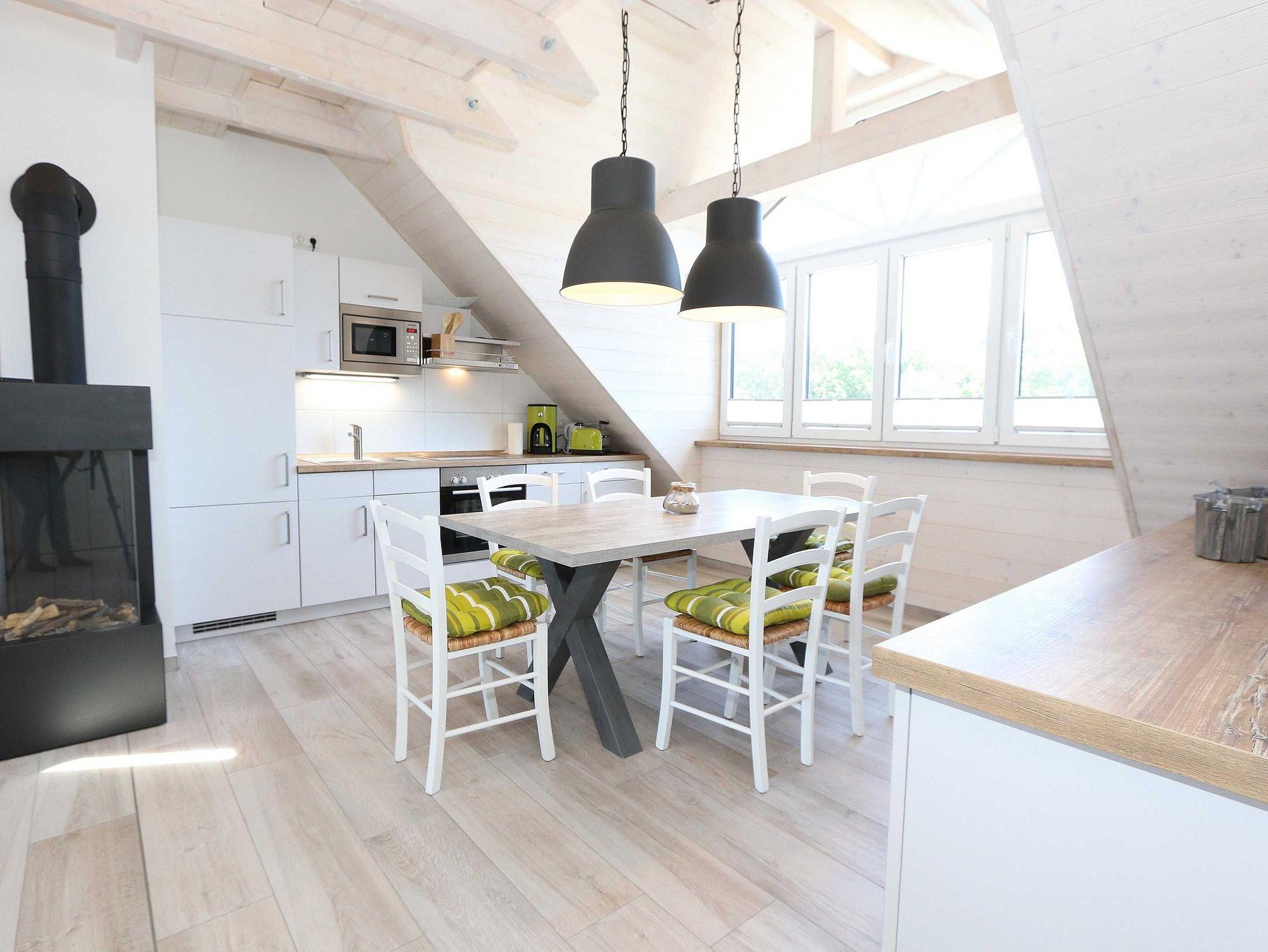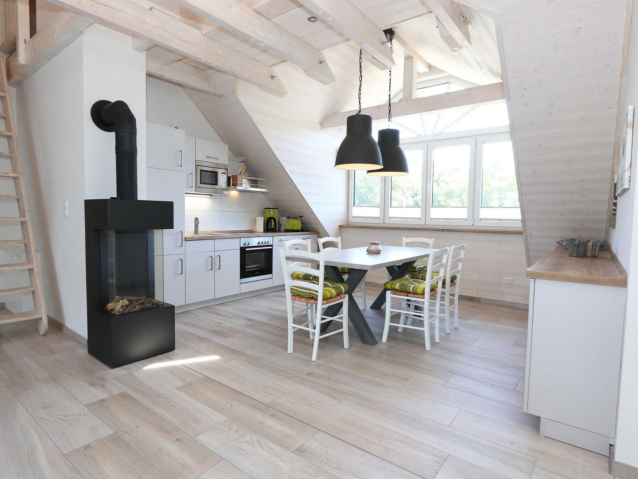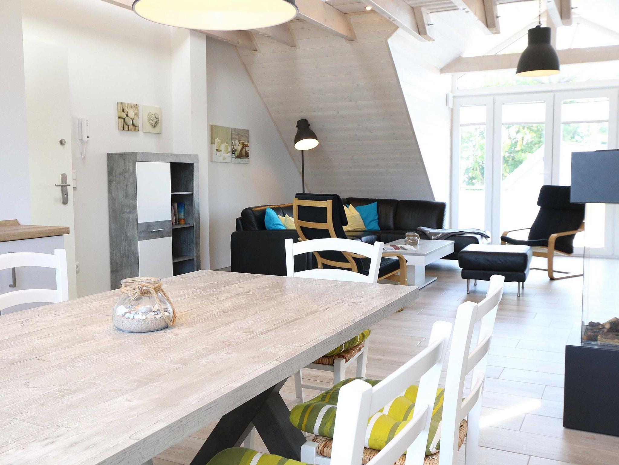 Die im nordischen Stil eingerichtete Nichtraucherwohnung mit 89 m² findet sich in der 2. Etage. Sie ist lichtdurchflutet und geprägt durch Holzschrägen, dicke naturbelassene Holzbalken, die einen Blick in den First zulassen. Die Ferienwohnung ?Seestern? ist für max. 6 Erwachsene und 1 Kleinkind bis 3 Jahre im Kinderreisebett bestens geeignet. Sie ist modern eingerichtet mit einem großen Ledersofa, Leselampe, 2 Relax-Sessel und einem Lowboard mit Smart-TV, Soundanlage, Blue Ray-Player und Radio mit CD-Player. Auch im Urlaub brauchen Sie auf einen Internetanschluss (WLAN) nicht verzichten. Dieser ist für Sie inklusive. An kühleren Tagen sorgt ein Gaskamin für angenehme Wärme. Vom Wohnbereich gelangen Sie auf den großen und bestuhlten Balkon (Süd) mit Sonnenschirm, auf dem Sie bei einem gemütlichen Frühstück Ihren Urlaubstag in Ruhe beginnen können. Bei der offenen Einbauküche müssen Sie auf nichts verzichten. Vom Geschirrspüler, Backofen, 4-Zonen-Cerankochfeld, Kühlschrank mit Gefrierkombination, Mikrowelle, Kaffeemaschine, Toaster, Wasserkocher bis hin zu vielen Küchenhelfern. Vom großen Esstisch, an dem 6 Personen Platz finden, genießen Sie einen Blick in ein Wäldchen, hinter welchem sich die Ostsee befindet. 2 Schlafzimmer verfügen über eingebaute Kleiderschränke sowie je ein Doppelbett (1,80 m x 2,00 m) mit Nachttischablagen, welche für Entspannung sorgen und erholt in den nächsten Urlaubstag schlafen lassen. An ein Schlafzimmer schließt sich ein En Suite Tageslichtbad mit WC, Waschplatz, Kosmetikspiegel, Fön und Dusche an. Das größere Tageslichtbad mit Infrarotsauna verfügt unter anderem auch über einen Wasch- und Trockenautomat, WC, Waschtisch, Fön sowie eine Dusche. Ein weiteres Highlight ist ein offener, durch ein Geländer abgegrenzter Schlafboden im Gebälk (Höhe 1,52 m), der über eine Raumspartreppe aus dem Wohnbereich erreicht wird. Dort befinden sich zwei große Einzelbetten (0,90 m x 2,00 m). Insektenschutzgitter sind vorhanden. In der Zeit vom 01. Juni - 31. August sind der Kamin und die Sauna nicht zu nutzen! Für unsere kleinen Gäste stehen 1x Kinderreisebett (ohne Zusatzmatratze, ohne Bettinlett) sowie 1x Hochstuhl (ohne Gurt) inklusive zur Verfügung. Im abschließbaren Nebengebäude können Sie Ihre Fahrräder sicher unterstellen. Ihren PKW können Sie auf dem zur Wohnung gehörenden Stellplatz (Nr. 9) direkt am Haus abstellen. Ein Grillplatz für alle Hausgäste ist vorhanden. Haustiere sind leider nicht erlaubt. Die Erstausstattung eines Wäschepaketes (komplette Bettwäsche, 1 Duschhandtuch, 2 kleine Handtücher) können Sie bis 14 Tage vor Anreise gegen einen Aufpreis dazu buchen oder durch eigene ergänzen. Ab 2 gebuchten Paketen erhalten Sie einmalig 1 Geschirrhandtuch und 1 Duschvorleger hinzu.