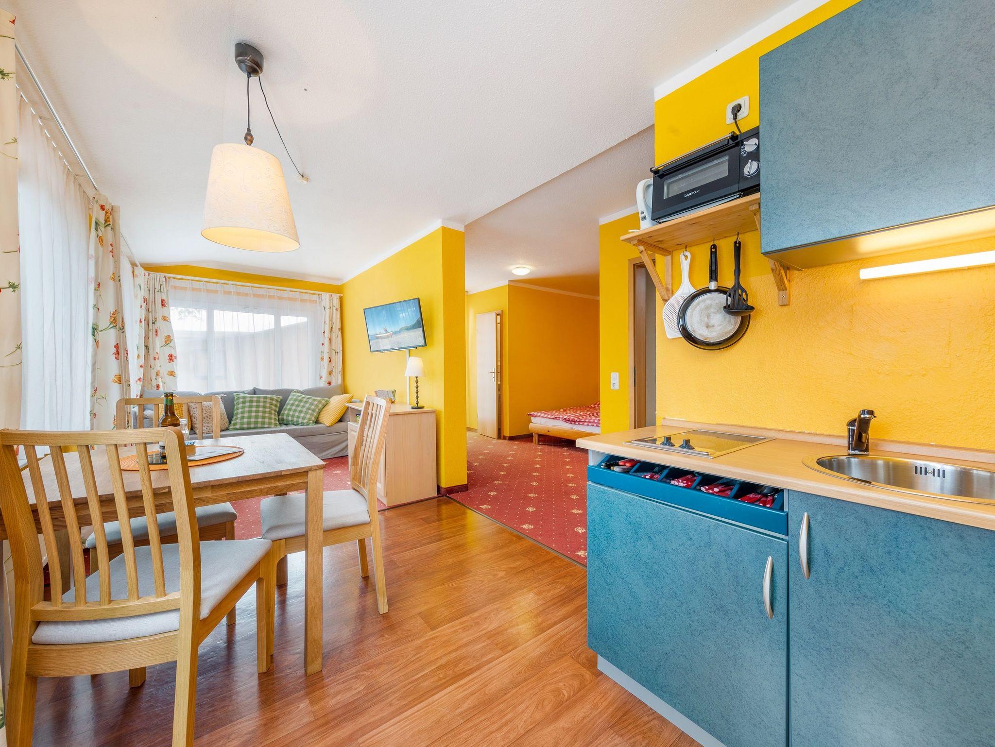 2-3 Pers.: Studio mit 35 qm Wohnfläche, Parterre. Wohn-/Schlafraum mit Esstisch, Pantry-Küche (2 P. E-Herd, Spülmaschine, Minibackofen, Kaffeemaschine, Wasserkocher, 6-Set-Ess-Geschirr und Besteck, kleine Auswahl an Gläsern, kleine Topfsammlung, ein paar kleine Küchenhelfer --- Grundausstattung!!!), Doppelbett, Couchgarnitur (weitere Schlafmöglichkeit 1 Pers.). Bad/WC. Balkon mit Sitzmöbeln.