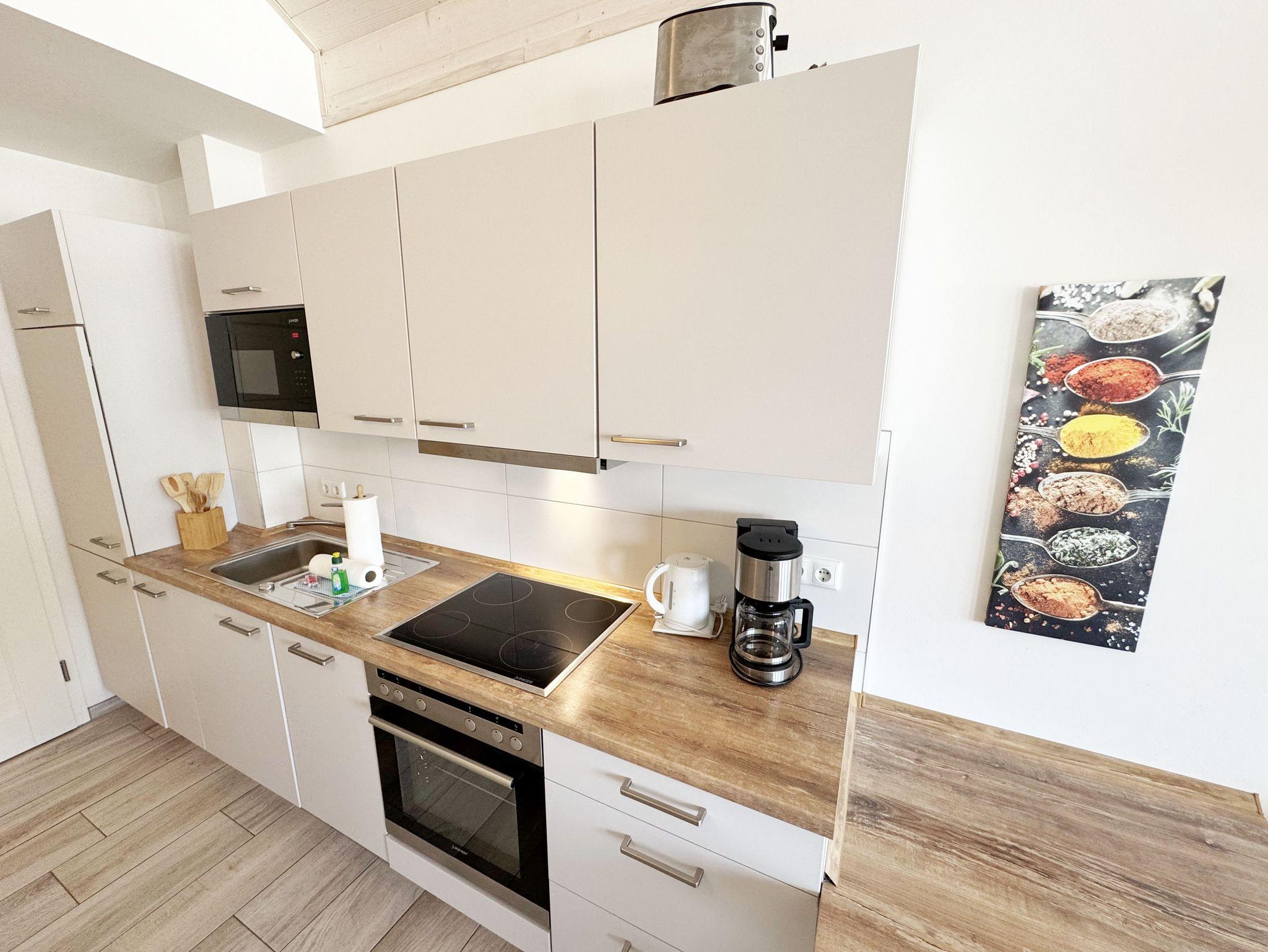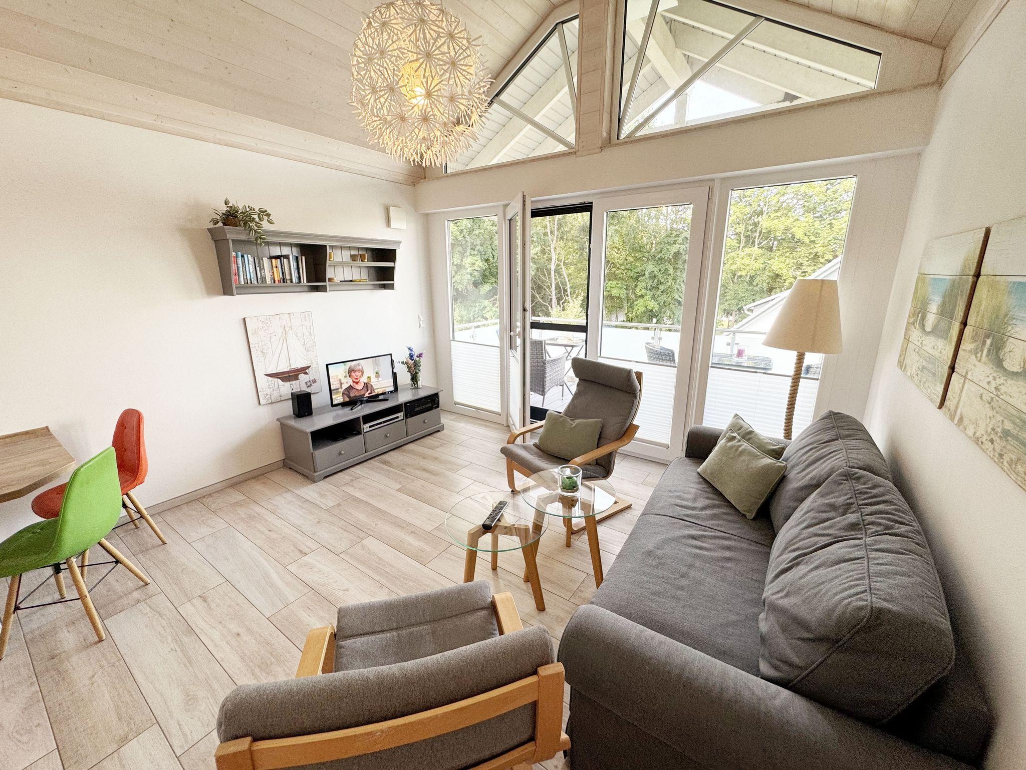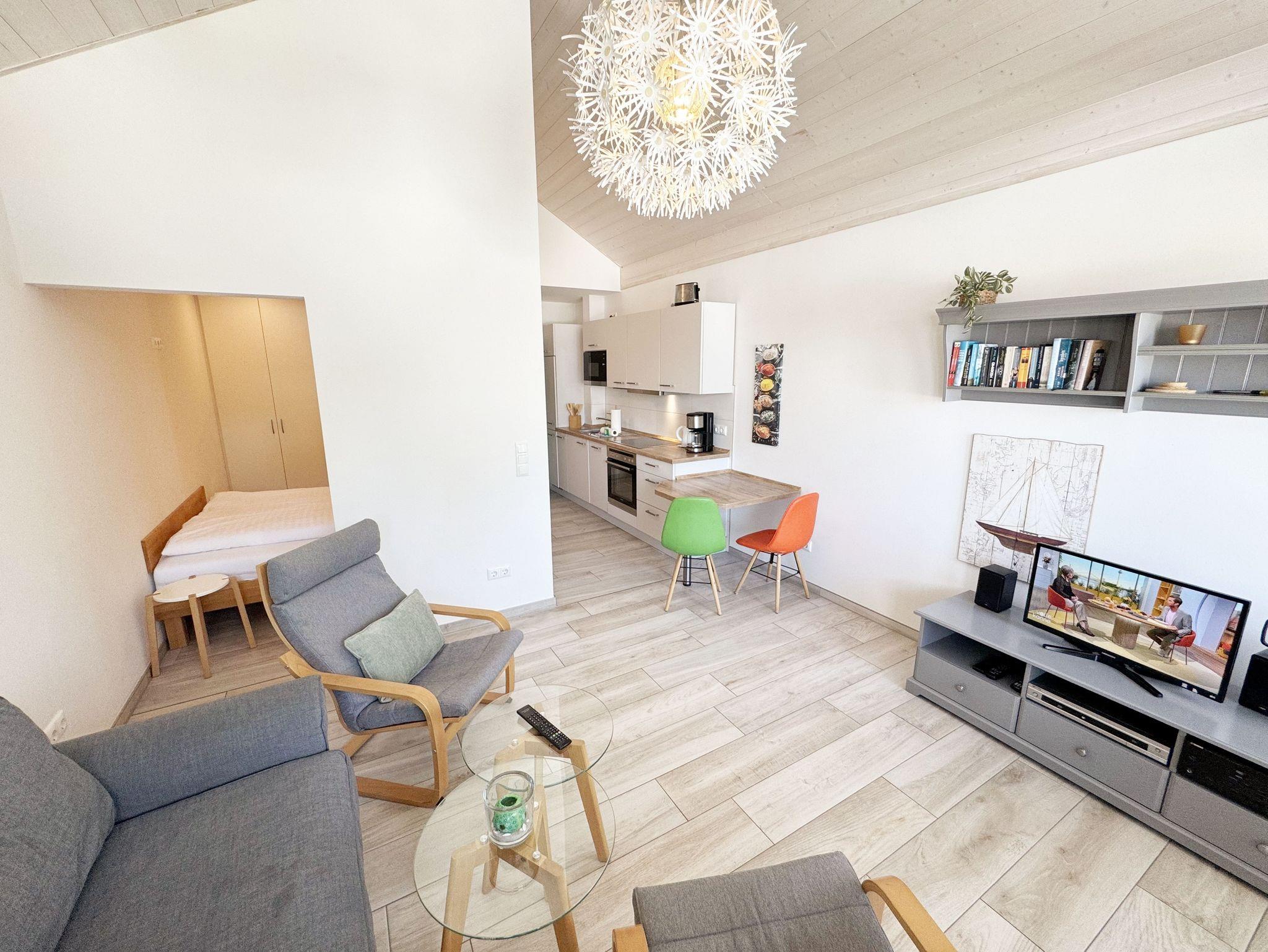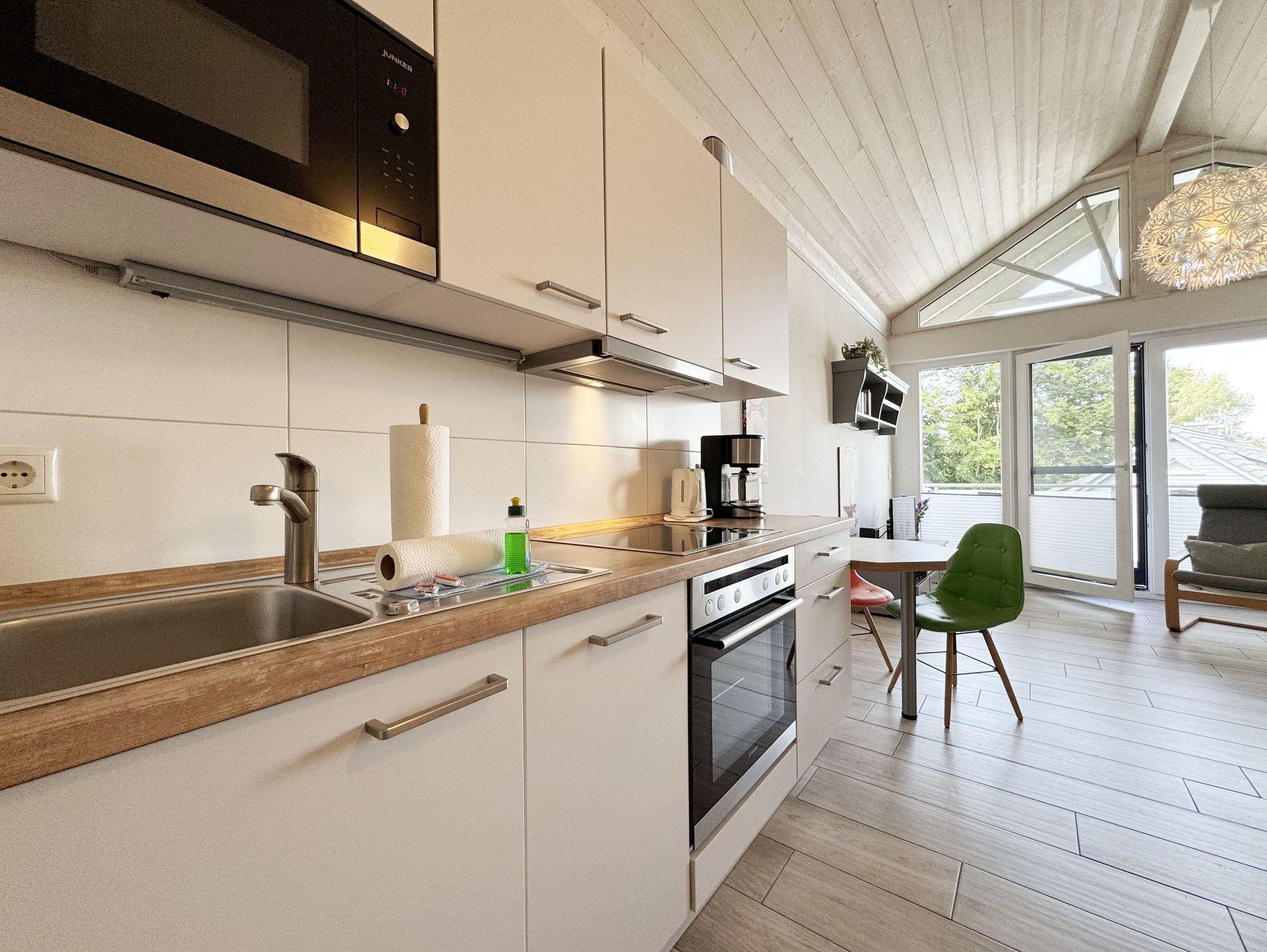Die helle und freundliche ca. 40 m² große Nichtraucherferienwohnung befindet sich in der 2. Etage des Hauses Windrose und bietet Platz für max. 2 bis 3 Erwachsene. Sie besticht durch einen Blick in ein Gebälk bis zum Dachfirst. Durch das große Panoramafenster genießen Sie einen Ausblick auf Thiessow und ein kleines Wäldchen. Durch einen kleinen Eingangsbereich mit Garderobe erreichen Sie den offenen Wohn- und Essbereich mit Küchenzeile, welche mit einem Kühlschrank mit Gefrierfach, einem 4 -Zonen-Ceranfeld, einem Backofen, einem Geschirrspüler, einer Mikrowelle und diversen Küchenutensilien wie Kaffeemaschine, Wasserkocher, Toaster, Handmixer usw. ausgestattet ist. Ein Esstisch mit Stühlen schließt sich der Küchenzeile an. Ein Lowboard mit Smart-TV, Blue Ray-Player, Mini-Stereo-Anlage sowie eine Couch, die sich mit wenigen Handgriffen als Aufbettung für die 3. Person verwandeln lässt (1,40m x 2,00m), Couchtisch, Relax-Sessel und Leselampe prägen den Wohnbereich. Von hier gelangen Sie auf den großen, überdachten und bestuhlten Balkon (Süd/West) mit Insektenschutztür. Auch im Urlaub brauchen Sie auf einen Internetanschluss (WLAN) nicht verzichten. Dieser ist für Sie inklusive. Ein angrenzender Schlafraum mit Kleiderschrank und Doppelbett (1,60 m x 2,00 m) mit 7-Zonen-Kaltschaummatratzen sowie Nachttischablagen sorgt für Ruhe und Entspannung. Ein modernes Bad mit ebenerdiger Dusche, Handtuchtrockner, Waschtisch, Kosmetikspiegel, Fön, WC und Waschmaschine lässt keinen Wunsch offen. Für eine angenehme Wärme sorgt die Fußbodenheizung in allen Räumlichkeiten. Haustiere sind nicht erlaubt. Auf der gepflegten Außenanlage steht Ihnen ein zur Wohnung gehörender abschließbarer Fahrradschuppen (Nr. 10) für Ihre mitgebrachten oder geliehenen Fahrräder zur Verfügung. Auf dem gemeinschaftlichen Grillplatz mit Sitzmöglichkeiten können Sie Ihren Urlaubstag ausklingen lassen. Ein PKW-Stellplatz (Nr. 10) steht inklusive zur Verfügung. Die Erstausstattung eines Wäschepaketes (komplette Bettwäsche, 1 Duschhandtuch, 2 kleine Handtücher) können Sie bis 14 Tage vor Anreise gegen einen Aufpreis dazu buchen oder durch eigene ergänzen. Ab 2 gebuchten Paketen erhalten Sie einmalig 1 Geschirrhandtuch und 1 Duschvorleger hinzu.