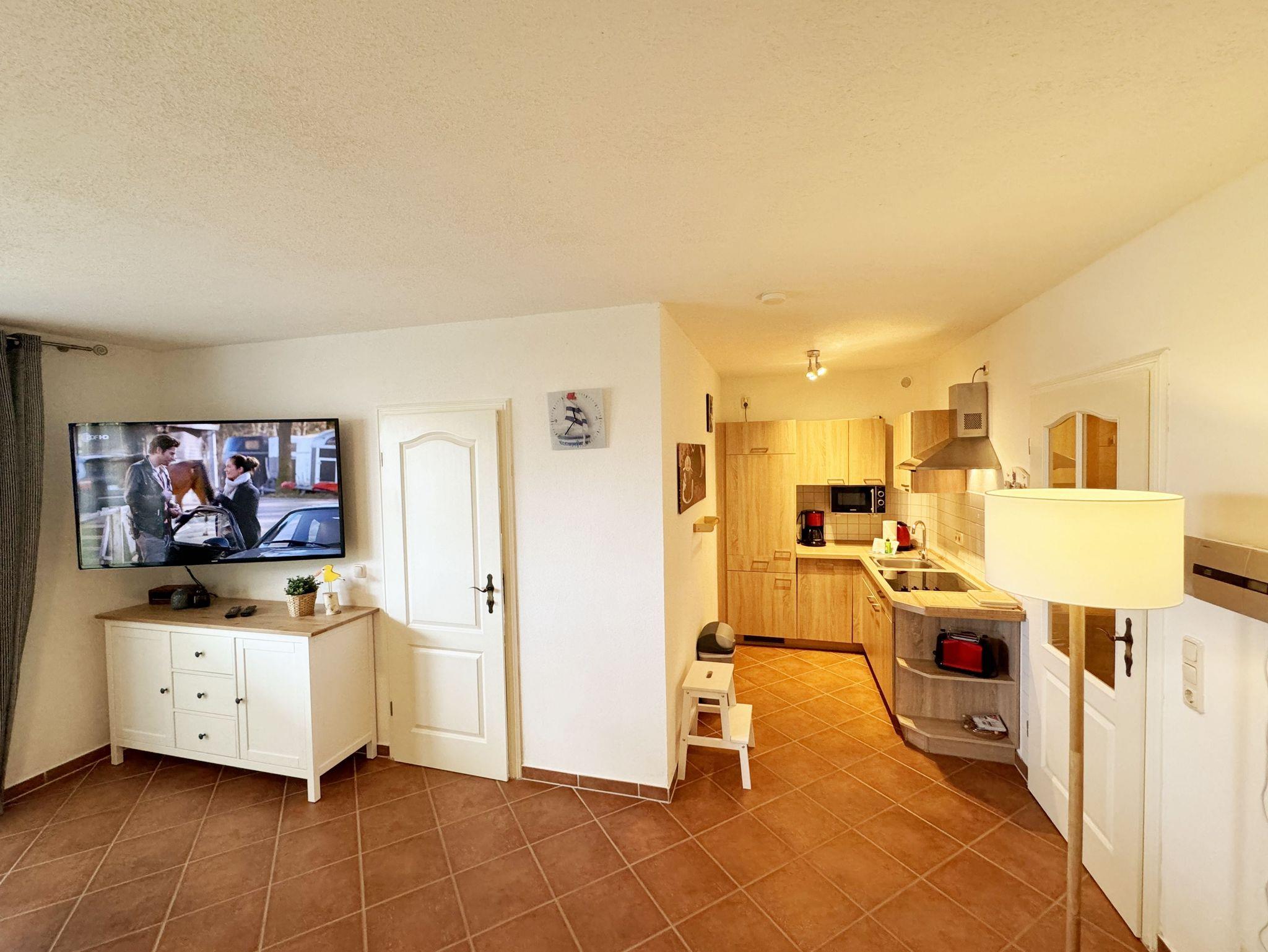 Die Nichtraucher-Ferienwohnung Strandläufer bietet Ihnen mit Ihren ca. 43qm Platz für max. 2 bis 3 Personen. Im hellen Wohnbereich befindet sich eine Eckcouch (welche mit wenigen Handgriffen als Aufbettung für die 3. Person genutzt werden kann, 1,20m x 1,95m) mit Couchtisch, eine Stehlampe, eine Vitrine sowie ein Sideboard mit Flachbild-TV. Der technische Bereich wird zusätzlich durch einen WLAN-Zugang (50 Mbit/S) abgerundet. Ein Esstisch komplettiert den Raum. Die offene Küchenzeile verfügt über einen Geschirrspüler, ein Cerankochfeld, einen Kühlschrank mit Eisfach, eine Mikrowelle, eine Kaffeemaschine, einen Wasserkocher und einen Toaster. Vom Wohnbereich gelangen Sie auf Ihre bestuhlte und überdachte West/Südwest-Terrasse. Das Schlafzimmer ist mit einem Doppelbett (1,80m x 2,00m), Nachttischablagen und einem Kleiderschrank ausgestattet. Für einen ruhigen Schlaf sorgt eine Verdunklungsmöglichkeit sowie ein Insektenschutzgitter. Das innenliegende Bad bietet Ihnen eine Dusche, ein Fön, ein WC sowie einen Waschplatz. Haustiere sind nicht erlaubt. Ihr PKW-Stellplatz (Nr.03) befindet sich direkt am Objekt. Ihre mitgebrachten Fahrräder können Sie im Schuppen (Nr.03) welcher direkt zur Wohnung gehört sicher einschließen. Die Erstausstattung eines Wäschepaketes (komplette Bettwäsche, 1 Duschhandtuch, 2 kleine Handtücher) können Sie bis 14 Tage vor Anreise gegen einen Aufpreis dazu buchen oder durch eigene ergänzen. Ab 2 gebuchten Paketen erhalten Sie einmalig 1 Geschirrhandtuch und 1 Duschvorleger hinzu.