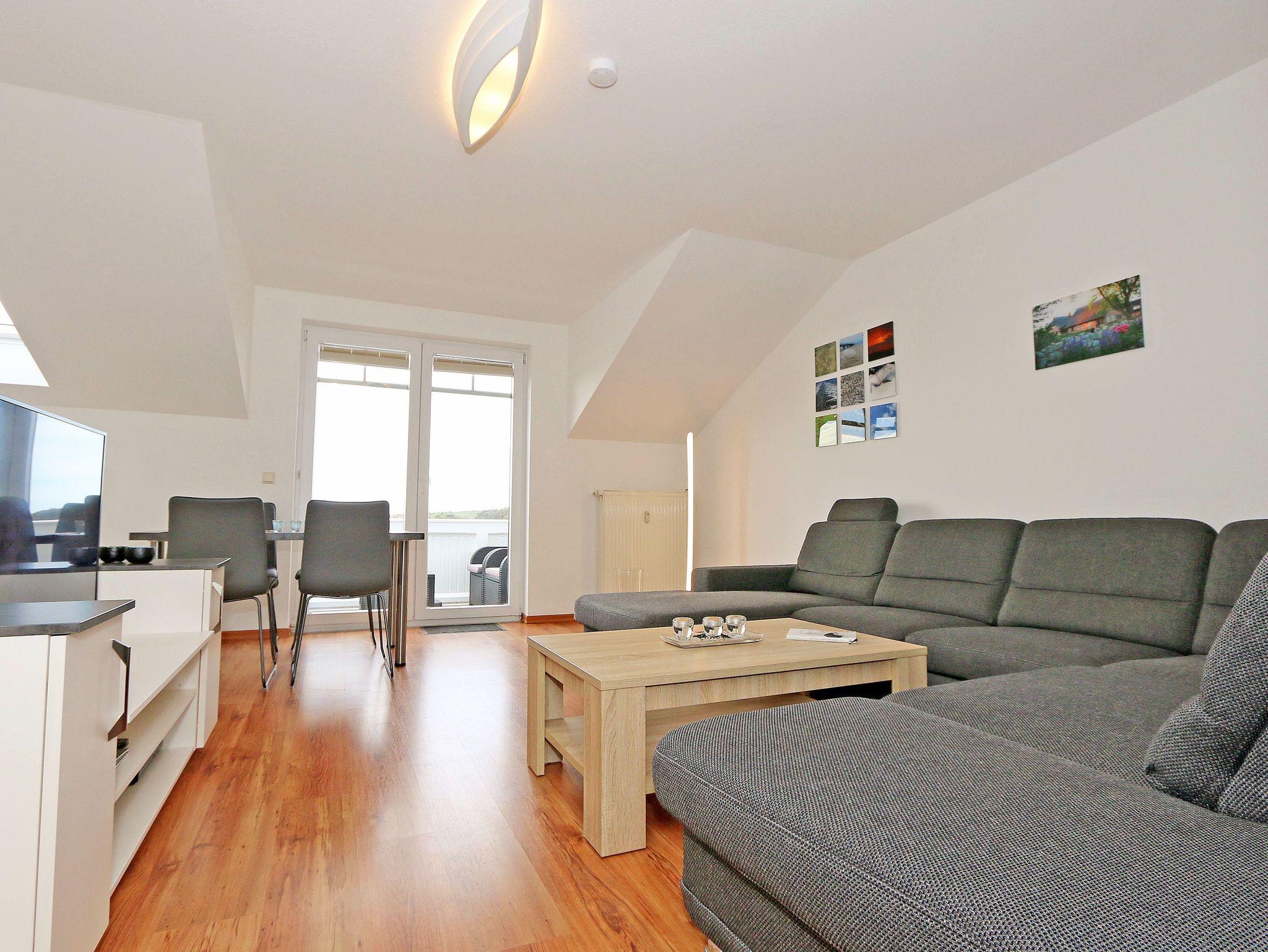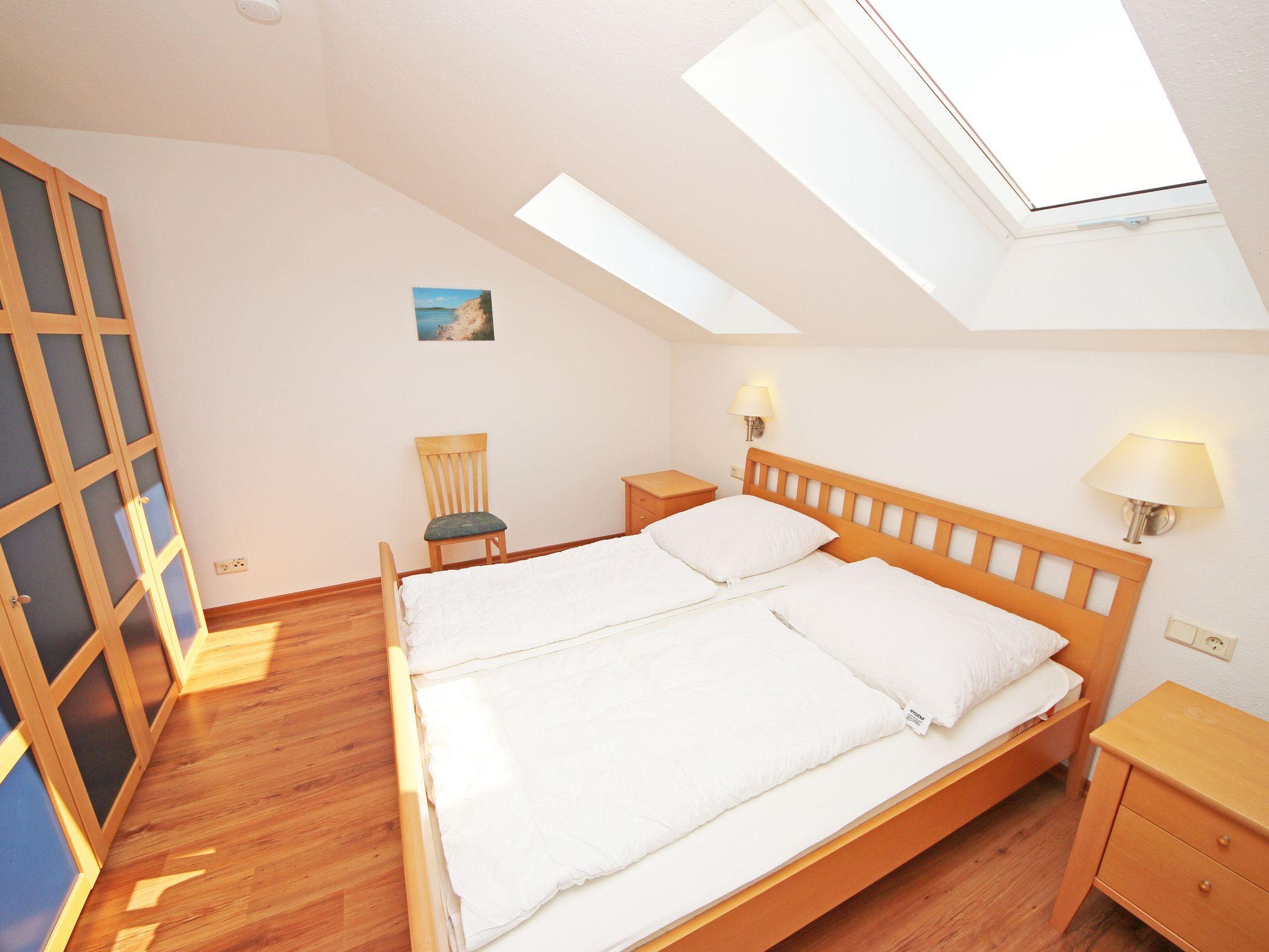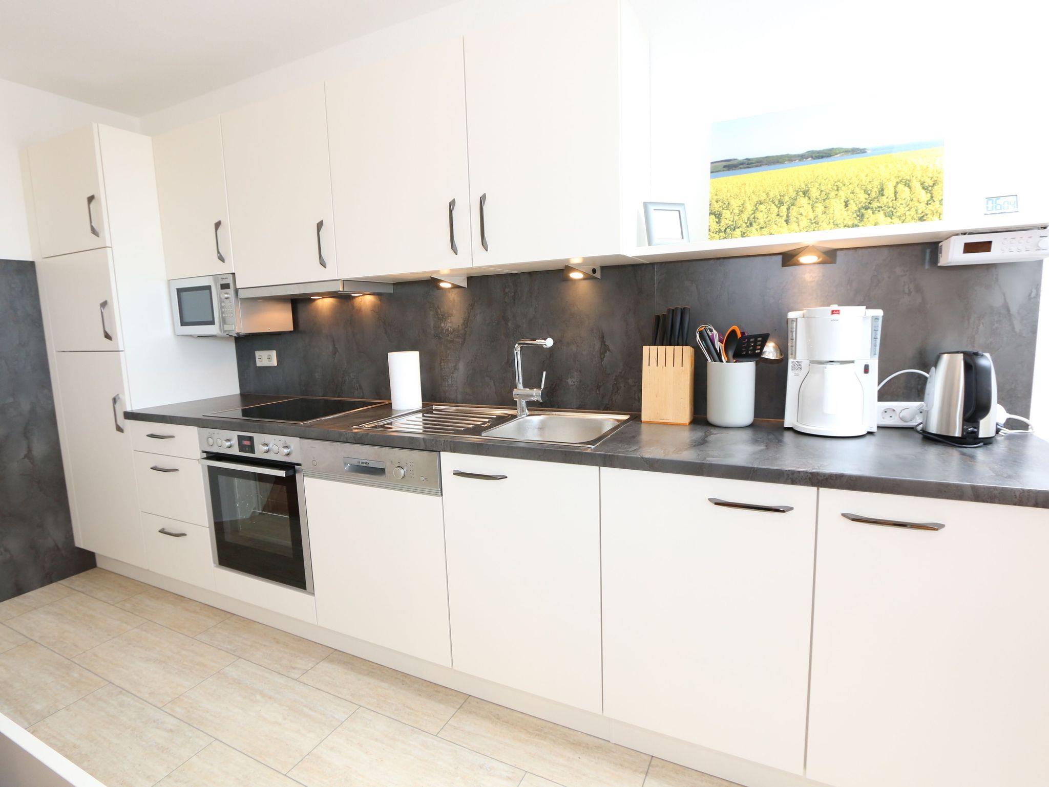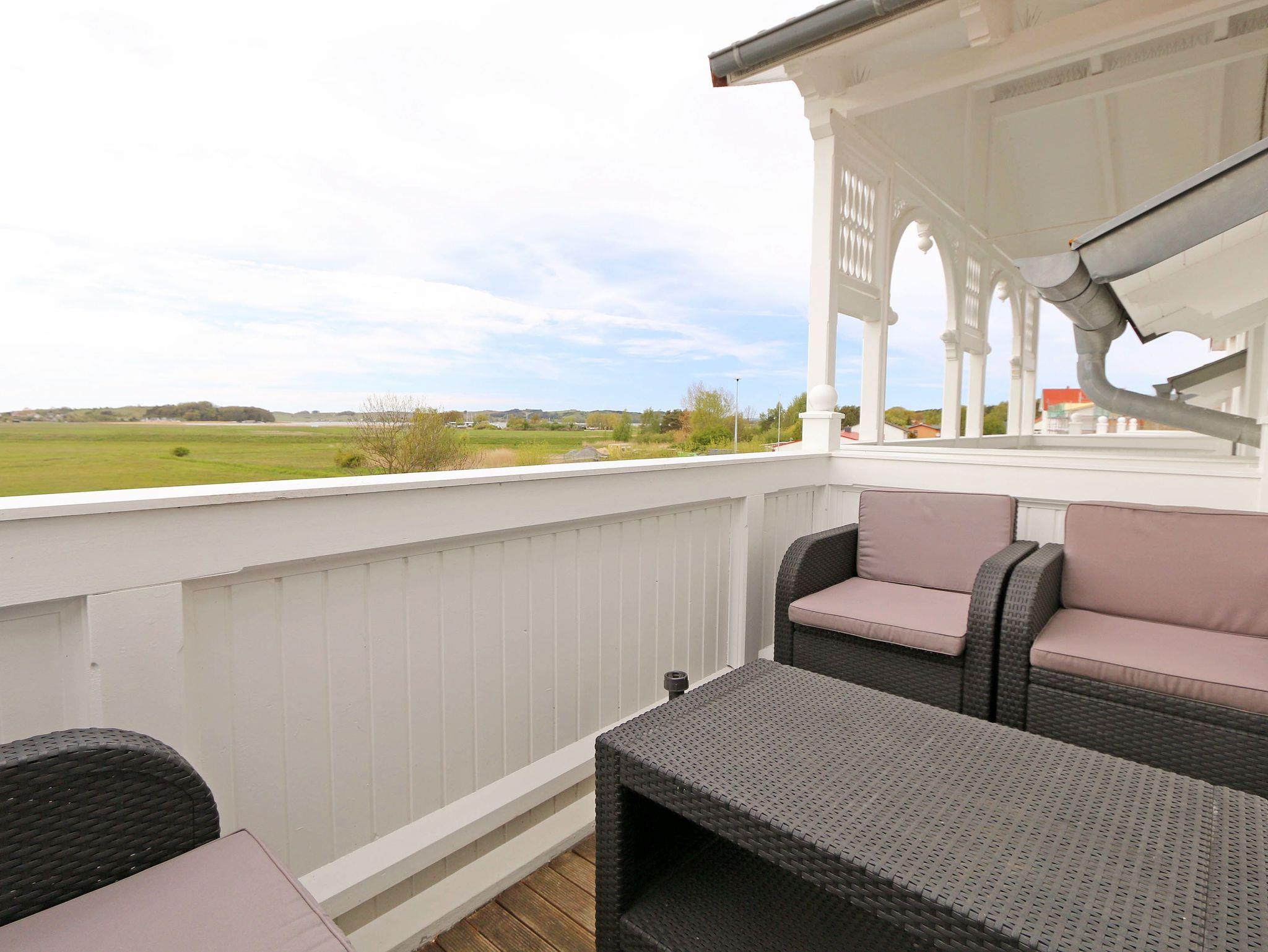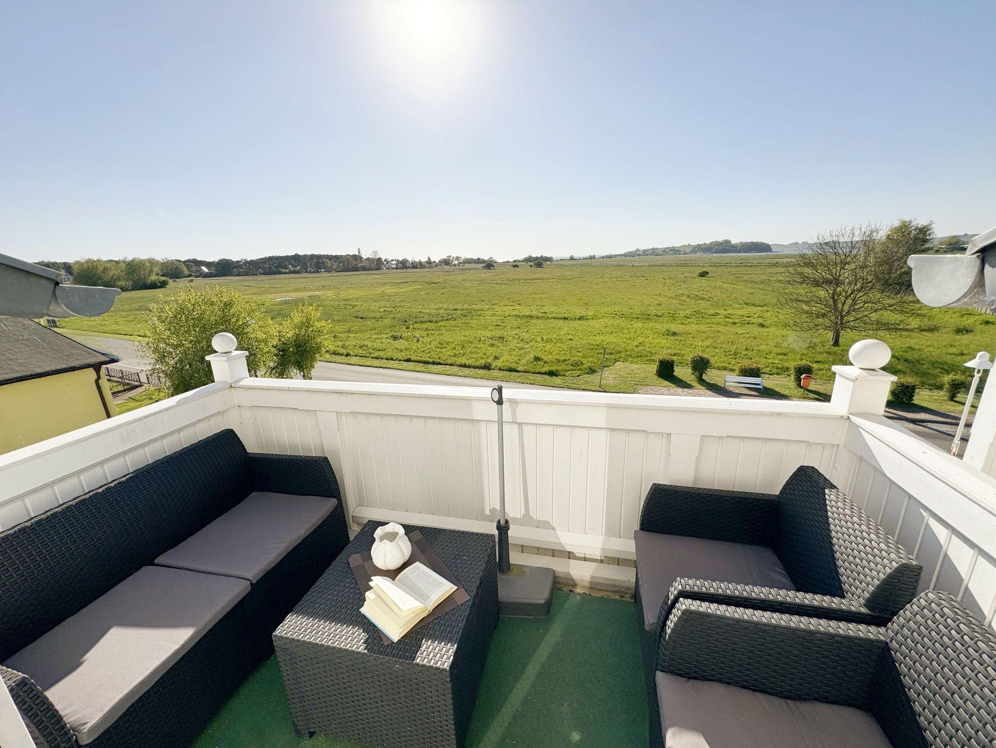 Ihr Urlaub hat begonnen! Sobald Sie das komfortabel eingerichtete Appartement betreten, werden Sie mit einem tollen Panoramablick über den Bodden belohnt, der Sie bei jedem Wetter fesseln wird. Dieses Nichtraucherappartement im 2. Obergeschoß ist mit 60m² für den Besuch von 2 ? 4 Personen liebevoll eingerichtet. Vom hellen Flur mit Garderobe und großem Spiegel aus betreten Sie den großzügigen Wohnbereich. Dort finden Sie eine neue und komplett ausgestattete Küchenzeile mit NEFF und BOSCH-Markengeräten wie ein Geschirrspüler, Kühlschrank mit Gefrierfach, Ceranfeld und Dunstabzugshaube, Backofen, Mikrowelle, Kaffeemaschine, Toaster, Wasserkocher, diverse Küchenhelfer mit einer großen Arbeitsfläche und viel Stauraum. Am stilvollen Esszimmertisch mit bequemen Stühlen genießen Sie bei jeder Jahreszeit einen tollen Blick über den Zicker See. Moderne Leuchten tauchen den Wohnbereich in ein stimmungsvolles Licht. Ein Couchtisch und die großzügige Wohnlandschaft mit Ausziehfunktion und breiter Liegefläche (1,60m x 2,00m) schafft Platz für die 3.oder 4. Person. Ein Smart-TV auf dem Low Board mit DVD-Player, DAB-Radio und eine Büchersammlung für die ruhigen Minuten sorgen für eine Auszeit. Dabei steht Ihnen schnelles WLAN ebenso zur Verfügung wie ein modernes Internet-Radio. Bei dem einen oder anderen Glas Wein tanken Sie Energie auf dem möblierten Süd/West-Balkon mit Sonnenschirm und können Ihre Seele über die Salzwiesen tanzen lassen. Im geräumigen Schlafzimmer mit breitem Doppelbett (1,80m x 2,00m), verstellbare Lattenroste, großzügigem Kleiderschrank, Nachttischablagen mit Leseleuchten und Wand Safe. Ihr erholsamer Schlaf wird durch Verdunklungs-Rollos und -Plissees im gesamten Appartement unterstützt. Das geräumige Badezimmer mit Dusche verfügt über ein Wandtiefspül-WC, Haartrockner, ausreichend Ablagefläche für Ihre Kosmetikartikel und einen großen Spiegel. Für unsere kleinen Gäste stehen ein Kinderreisebett und Hochstuhl bereit. In der kleinen Anlage kann ein Grillplatz genauso genutzt werden, wie eine Tischtennisplatte. Gerne können Sie die vorhandene Waschmaschine und Trockner im Keller des Gebäudes gegen Gebühr nutzen. Ein Haustier ist gegen eine Gebühr ein gern gesehener Gast. Ein Wäscheständer sowie diverse Reinigungsutensilien sind vorhanden. Während Ihre Fahrräder am Objekt oder im Keller untergestellt werden können, parkt Ihr PKW auf Ihren eigenen Stellplatz (Nr. 14) am Haus. Die Erstausstattung eines Wäschepaketes (komplette Bettwäsche, 1 Duschhandtuch, 2 kleine Handtücher) können Sie bis 14 Tage vor Anreise gegen einen Aufpreis dazu buchen oder durch eigene ergänzen. Ab 2 gebuchten Paketen erhalten Sie einmalig 1 Geschirrhandtuch und 1 Duschvorleger hinzu.