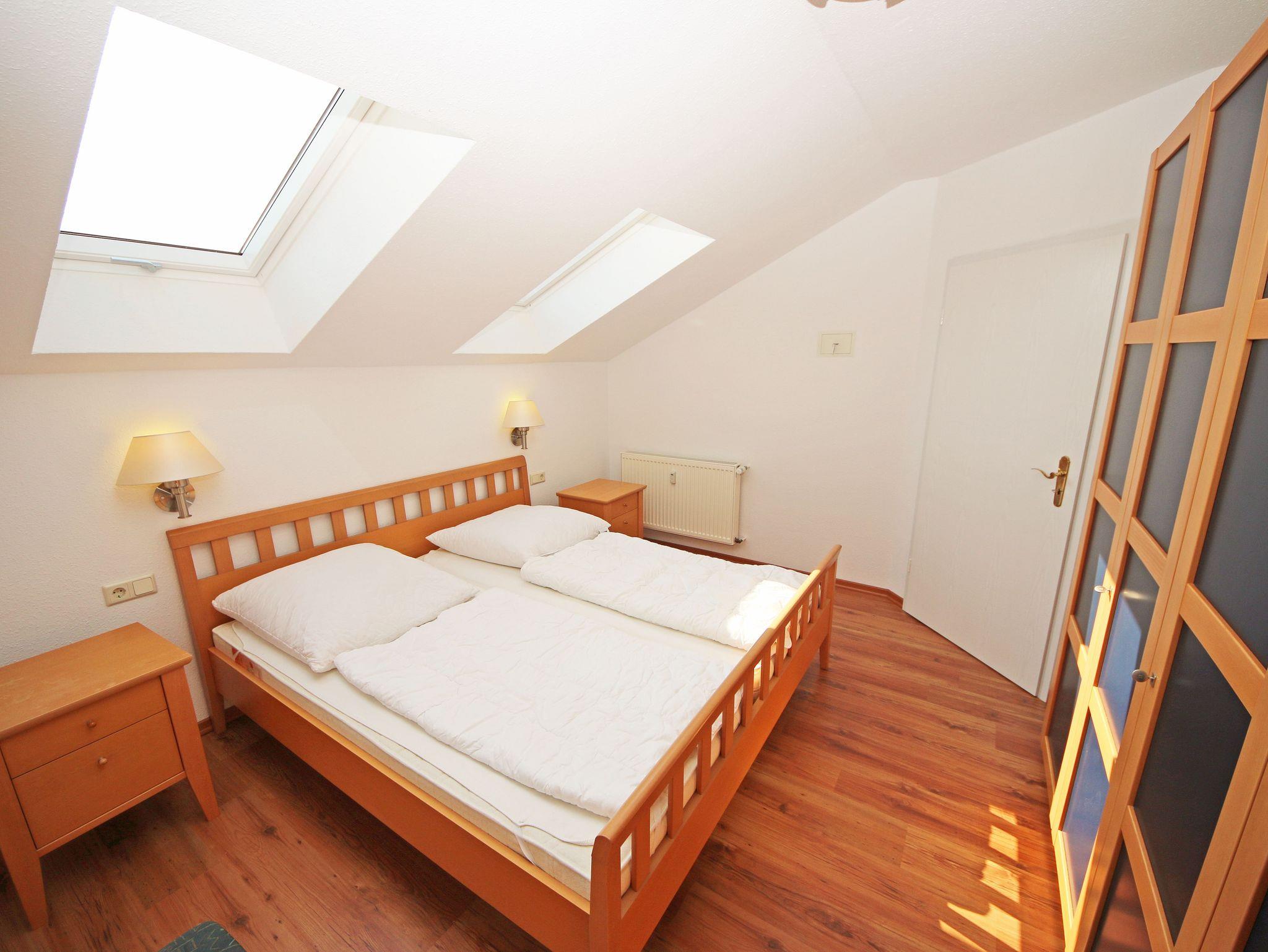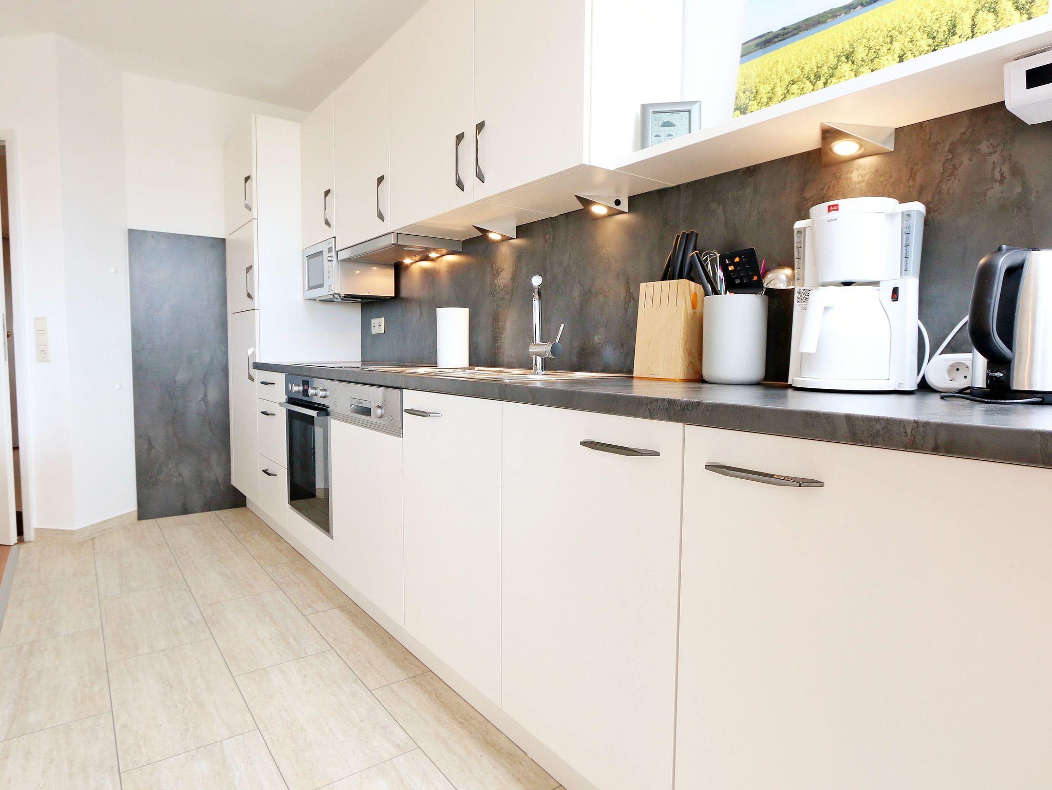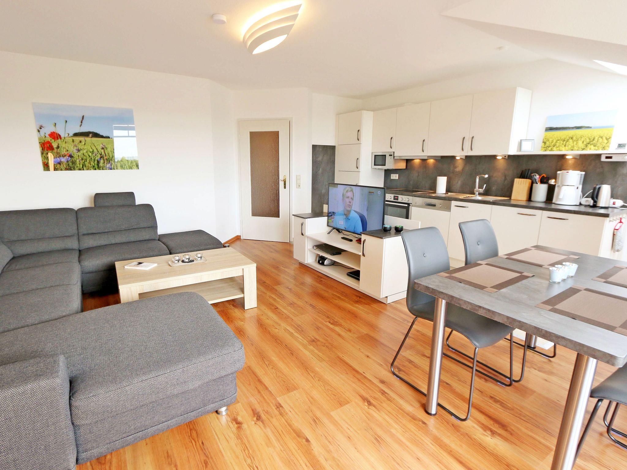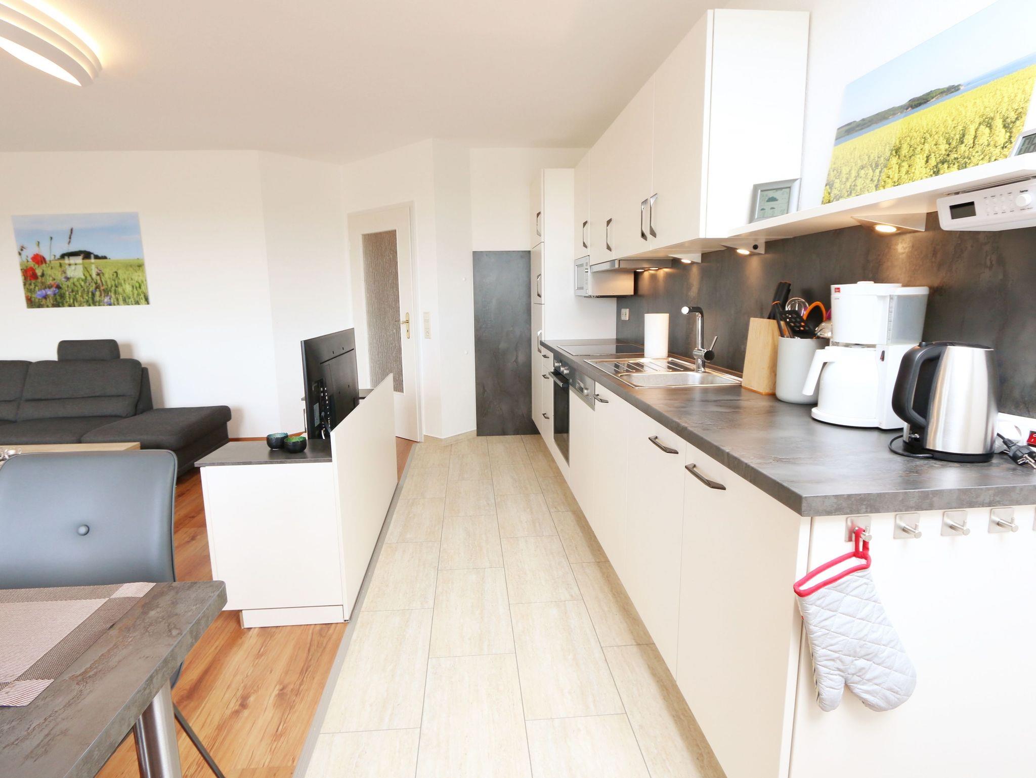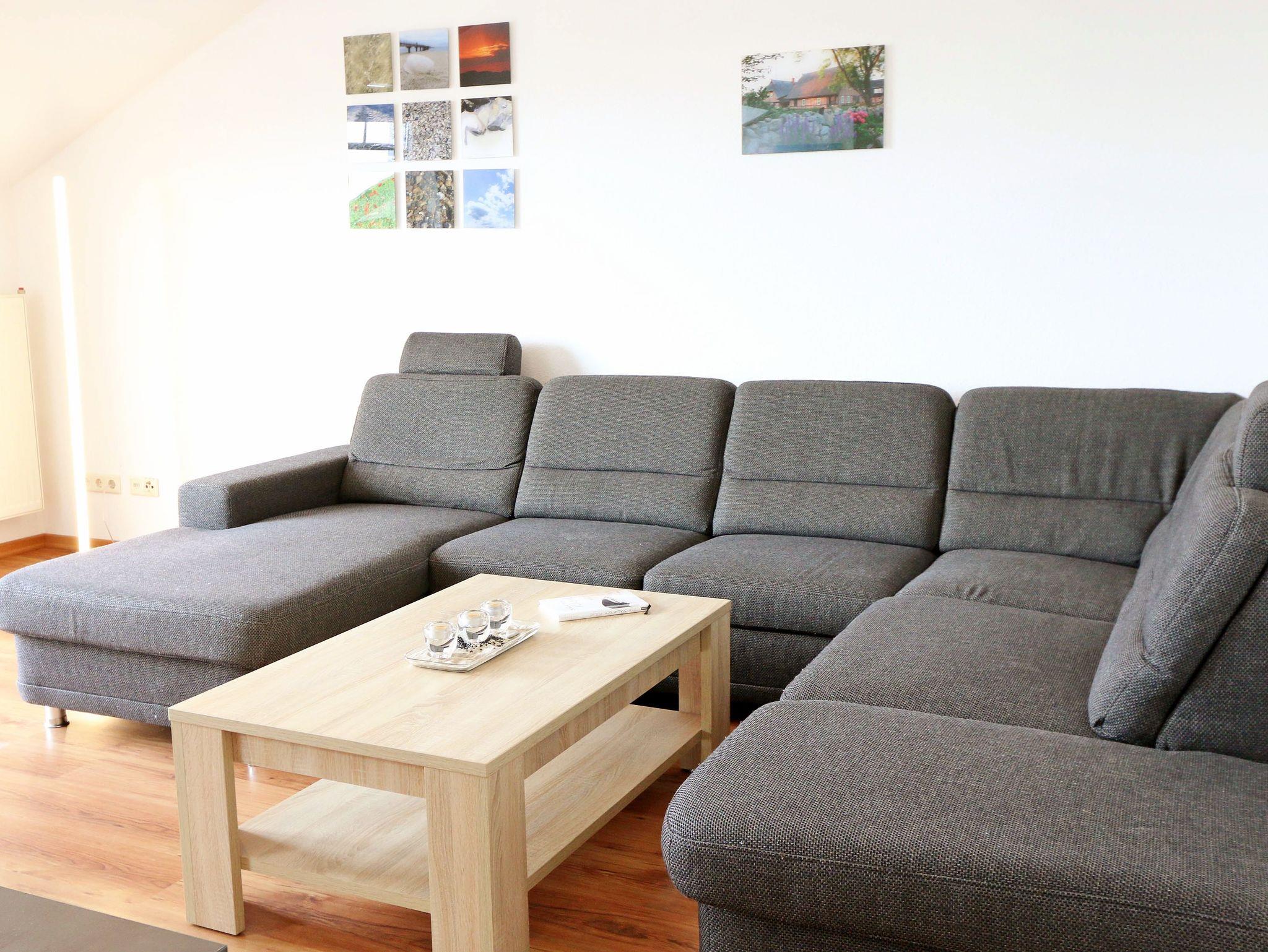 Ihr Urlaub hat begonnen! Sobald Sie das komfortabel eingerichtete Appartement betreten, werden Sie mit einem tollen Panoramablick über den Bodden belohnt, der Sie bei jedem Wetter fesseln wird. Dieses Nichtraucherappartement im 2. Obergeschoß ist mit 60m² für den Besuch von 2 ? 4 Personen liebevoll eingerichtet. Vom hellen Flur mit Garderobe und großem Spiegel aus betreten Sie den großzügigen Wohnbereich. Dort finden Sie eine neue und komplett ausgestattete Küchenzeile mit NEFF und BOSCH-Markengeräten wie ein Geschirrspüler, Kühlschrank mit Gefrierfach, Ceranfeld und Dunstabzugshaube, Backofen, Mikrowelle, Kaffeemaschine, Toaster, Wasserkocher, diverse Küchenhelfer mit einer großen Arbeitsfläche und viel Stauraum. Am stilvollen Esszimmertisch mit bequemen Stühlen genießen Sie bei jeder Jahreszeit einen tollen Blick über den Zicker See. Moderne Leuchten tauchen den Wohnbereich in ein stimmungsvolles Licht. Ein Couchtisch und die großzügige Wohnlandschaft mit Ausziehfunktion und breiter Liegefläche (1,60m x 2,00m) schafft Platz für die 3.oder 4. Person. Ein Smart-TV auf dem Low Board mit DVD-Player, DAB-Radio und eine Büchersammlung für die ruhigen Minuten sorgen für eine Auszeit. Dabei steht Ihnen schnelles WLAN ebenso zur Verfügung wie ein modernes Internet-Radio. Bei dem einen oder anderen Glas Wein tanken Sie Energie auf dem möblierten Süd/West-Balkon mit Sonnenschirm und können Ihre Seele über die Salzwiesen tanzen lassen. Im geräumigen Schlafzimmer mit breitem Doppelbett (1,80m x 2,00m), verstellbare Lattenroste, großzügigem Kleiderschrank, Nachttischablagen mit Leseleuchten und Wand Safe. Ihr erholsamer Schlaf wird durch Verdunklungs-Rollos und -Plissees im gesamten Appartement unterstützt. Das geräumige Badezimmer mit Dusche verfügt über ein Wandtiefspül-WC, Haartrockner, ausreichend Ablagefläche für Ihre Kosmetikartikel und einen großen Spiegel. Für unsere kleinen Gäste stehen ein Kinderreisebett und Hochstuhl bereit. In der kleinen Anlage kann ein Grillplatz genauso genutzt werden, wie eine Tischtennisplatte. Gerne können Sie die vorhandene Waschmaschine und Trockner im Keller des Gebäudes gegen Gebühr nutzen. Ein Haustier ist gegen eine Gebühr ein gern gesehener Gast. Ein Wäscheständer sowie diverse Reinigungsutensilien sind vorhanden. Während Ihre Fahrräder am Objekt oder im Keller untergestellt werden können, parkt Ihr PKW auf Ihren eigenen Stellplatz (Nr. 14) am Haus. Die Erstausstattung eines Wäschepaketes (komplette Bettwäsche, 1 Duschhandtuch, 2 kleine Handtücher) können Sie bis 14 Tage vor Anreise gegen einen Aufpreis dazu buchen oder durch eigene ergänzen. Ab 2 gebuchten Paketen erhalten Sie einmalig 1 Geschirrhandtuch und 1 Duschvorleger hinzu.