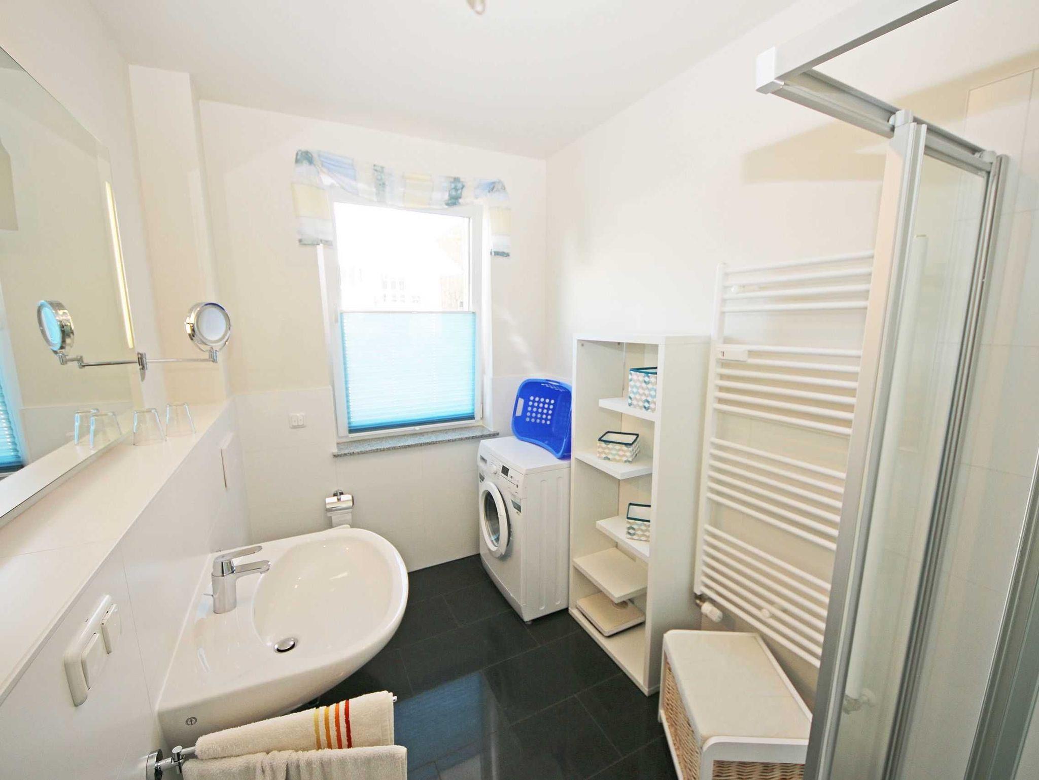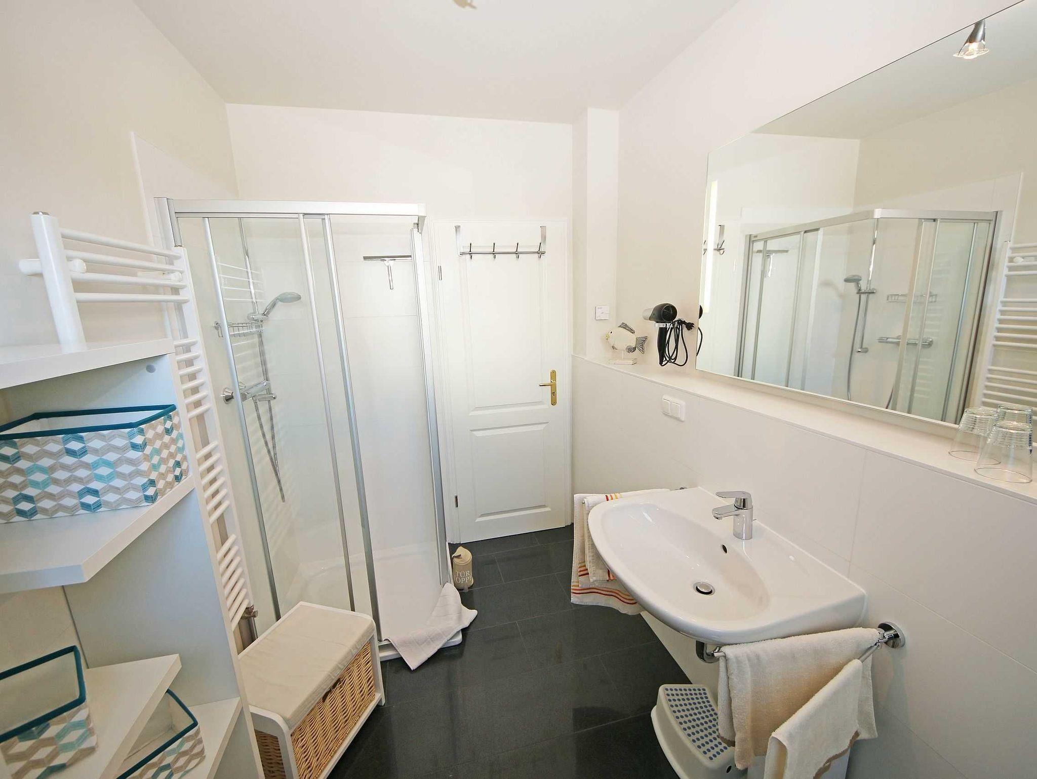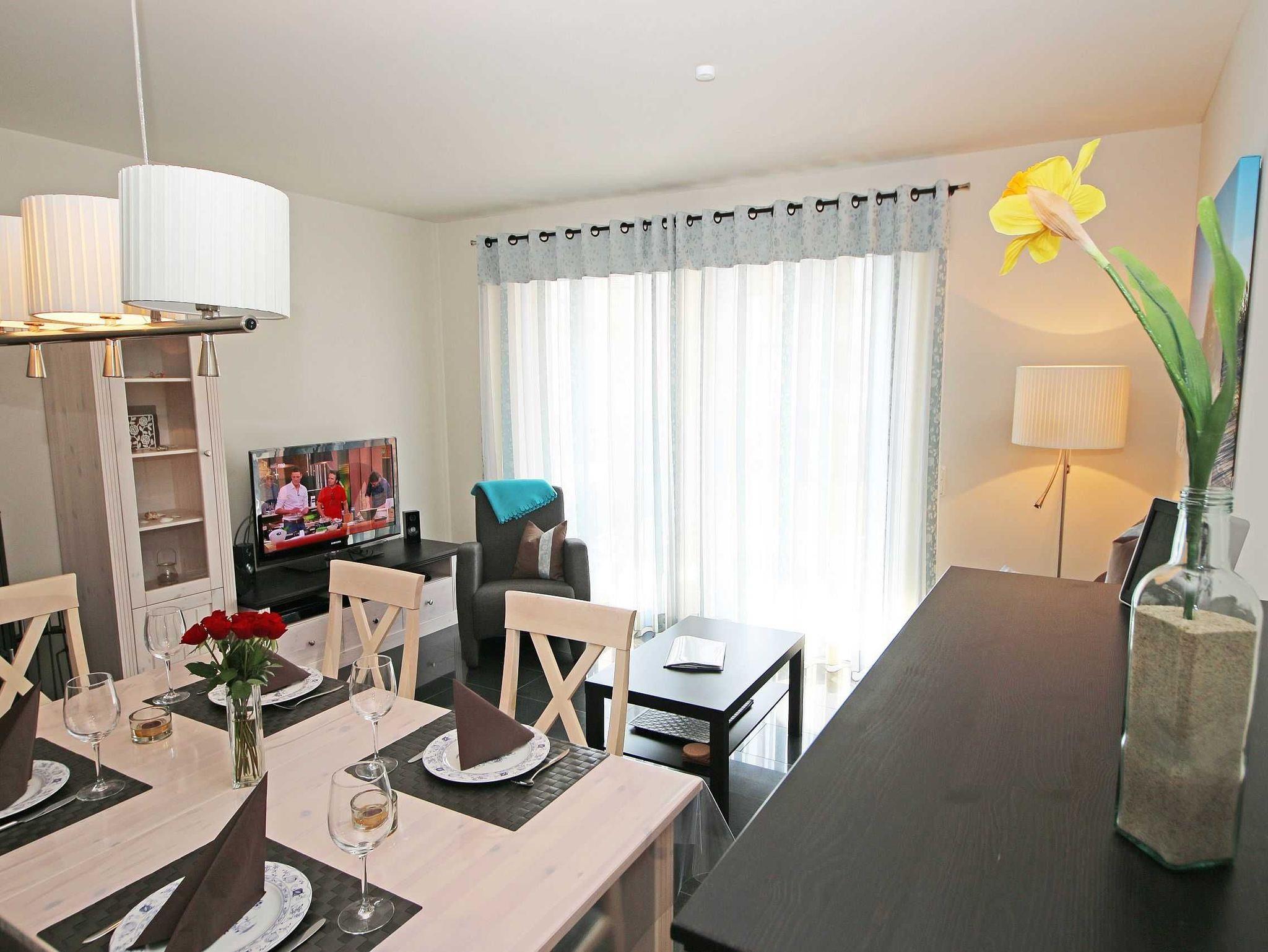 Das 3-Raumappartement (Nichtraucher) befindet sich in Parterre und bietet mit ca. 61 qm ausreichend Platz für bis zu 4 Personen. Die Wohnung ist im gehobenen Standard eingerichtet. An kälteren Abenden sorgt ein Kaminofen für eine wohlige Wärme und gemütliche Atmosphäre. Das Brennholz (solange der Vorrat reicht) steht Ihnen inklusive zur Verfügung. In der Ferienwohnung wurde ein hochwertiger Granitfußboden verarbeitet sowie in den beiden Schlafzimmern ein hochwertiger Parkettboden verlegt. An jedem Fenster wurde Insektenschutz angebracht sowie elektrische Rollläden. Der Wohnraum ist mit einer gemütlichen Couch, Leselampe, Smart-TV, Blu-Ray-Player, WLAN (inklusive) und einer Stereoanlage mit DAB-Radio ausgestattet. Von dem Wohnzimmer sowie vom 2. Schlafzimmer aus gelangen Sie auf die bestuhlte Terrasse mit Sonnenschirm, Strandkorb, Sonnenliege sowie Grill. Von hier aus Blicken Sie in Richtung Süden. Die offene und exklusive Küche ist im Wohnbereich integriert und komplett ausgestattet. Küchengeräte wie Ceranfeld, Backofen, Geschirrspüler, Kühlschrank mit Gefriermöglichkeit, Mikrowelle sowie Kaffeemaschine, Wasserkocher, Toaster und eine gemütliche Essecke wie auch weitere diverse Küchenutensilien runden den Koch- und Küchenbereich ab. In den Schlafzimmern befinden sich je ein Doppelbett (Bettenmaße: Schlafzimmer 1 - 1,80 m x 2,00 m / Schlafzimmer 2 - 1,40 m x 2,00 m), Nachttischkonsolen und ein Kleiderschrank. Das Tageslichtbad rundet mit einer Dusche, Waschtisch, Kosmetikspiegel, Fön und einem WC den Sanitärbereich ab. Für unsere kleinen Gäste steht 1x Kinderreisebett (ohne Matratze und Bett-Inlett) inklusive zur Verfügung. Zusätzlich steht Ihnen eine Waschmaschine zur Verfügung, die zur Nutzung inklusive ist. Ihre mitgebrachten bzw. gemieteten Fahrräder können Sie in einem für die Wohnung vorgesehen Abstellraum verwahren. Ein für Sie reservierter PKW-Stellplatz Nr. 03 ist ebenso vorhanden. Haustiere sind nicht erlaubt. Die Erstausstattung eines Wäschepaketes (komplette Bettwäsche, 1 Duschhandtuch, 2 kleine Handtücher, 2 Geschirrhandtücher) können Sie bis 14 Tage vor Anreise gegen einen Aufpreis dazu buchen oder durch eigene ergänzen.