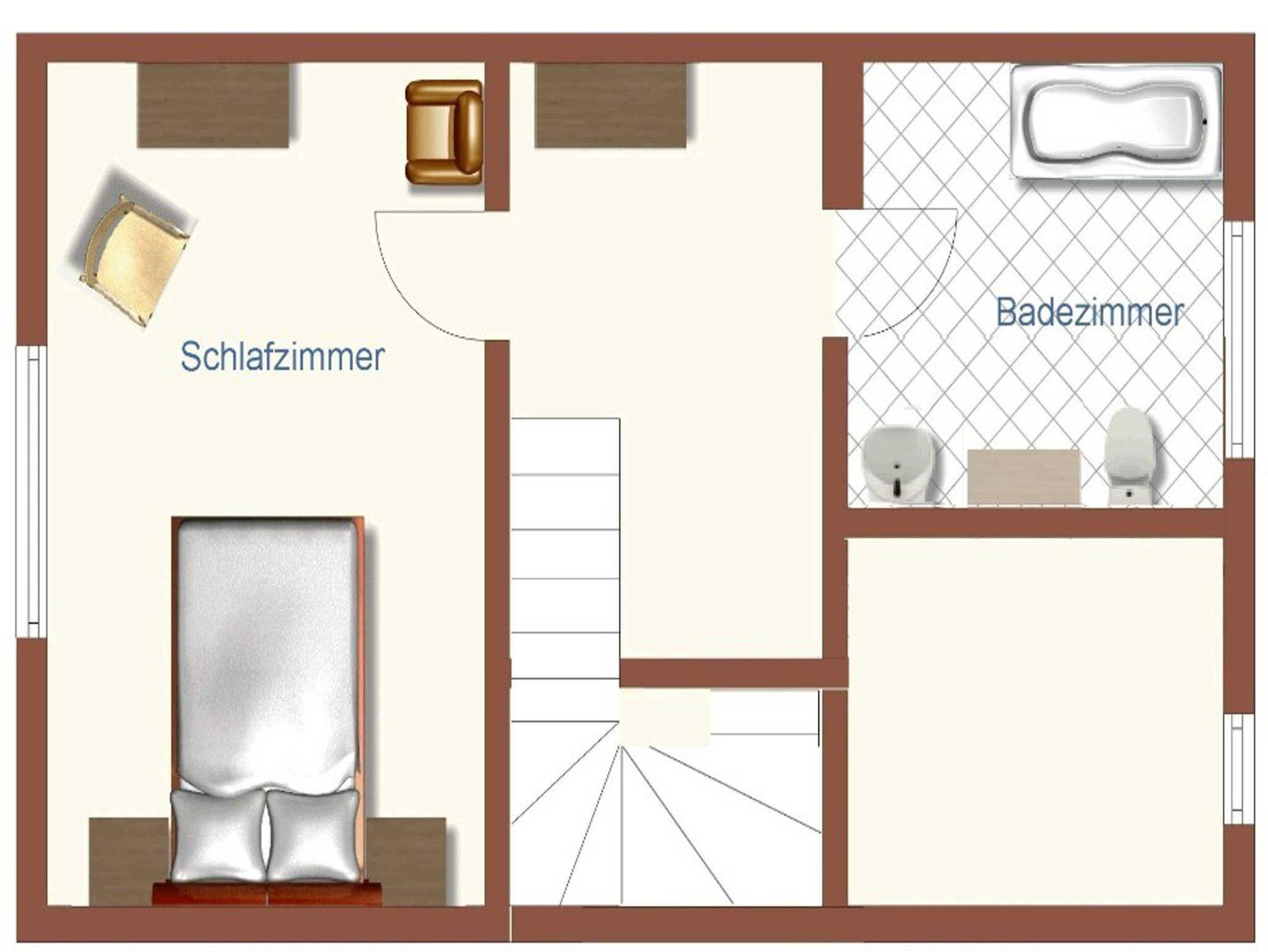 Im Obergeschoss befindet sich ein zweites Schlafzimmer mit Doppelbett (zwei Matrazen) und ein großes Badezimmer mit Badewanne und WC. Das Obergeschoss steht bei Buchung ab 3 Personen zur Verfügung. WLAN ist vorhanden.