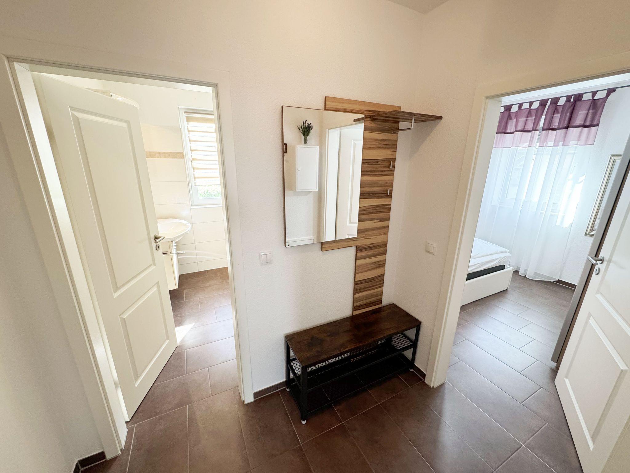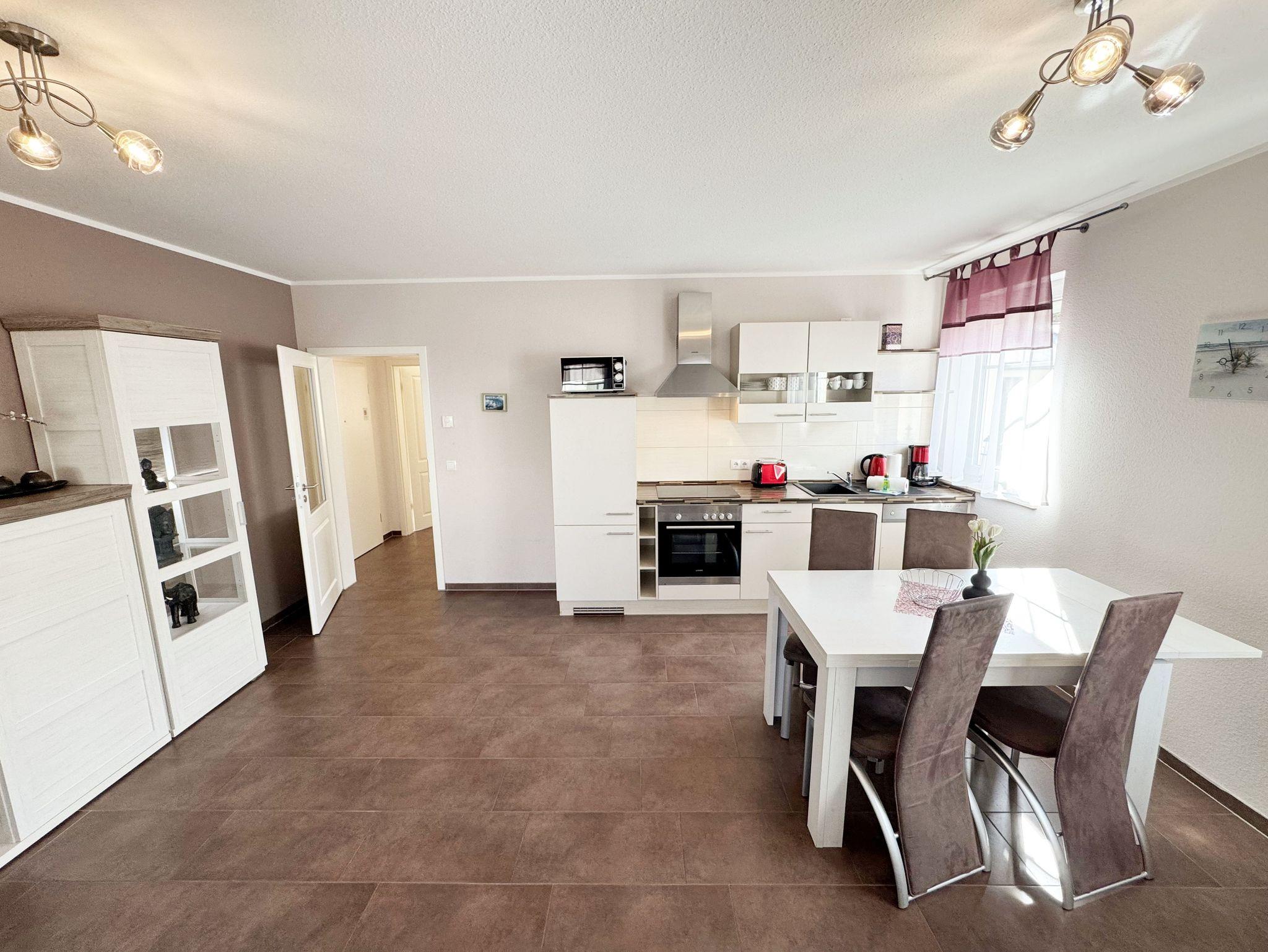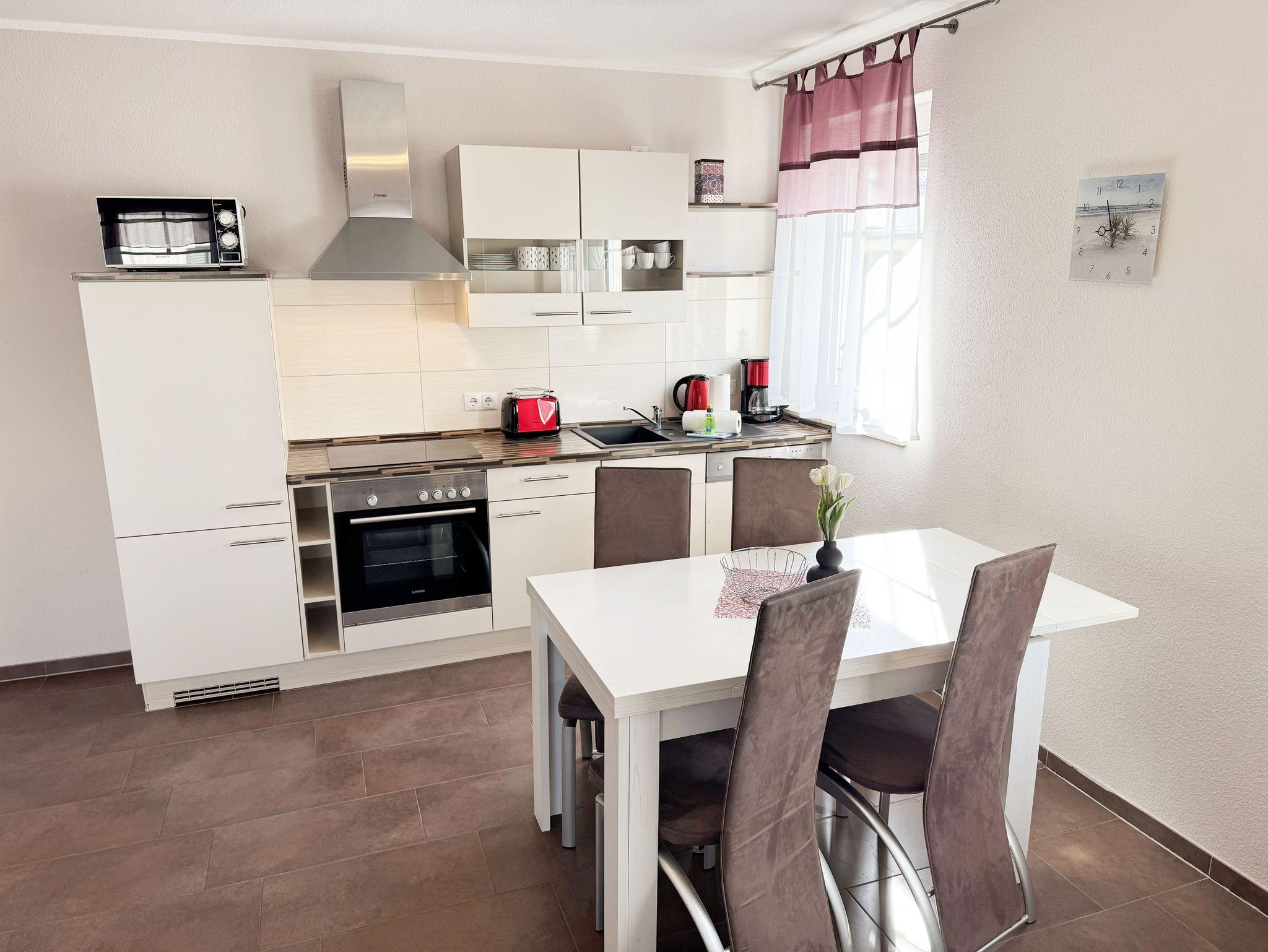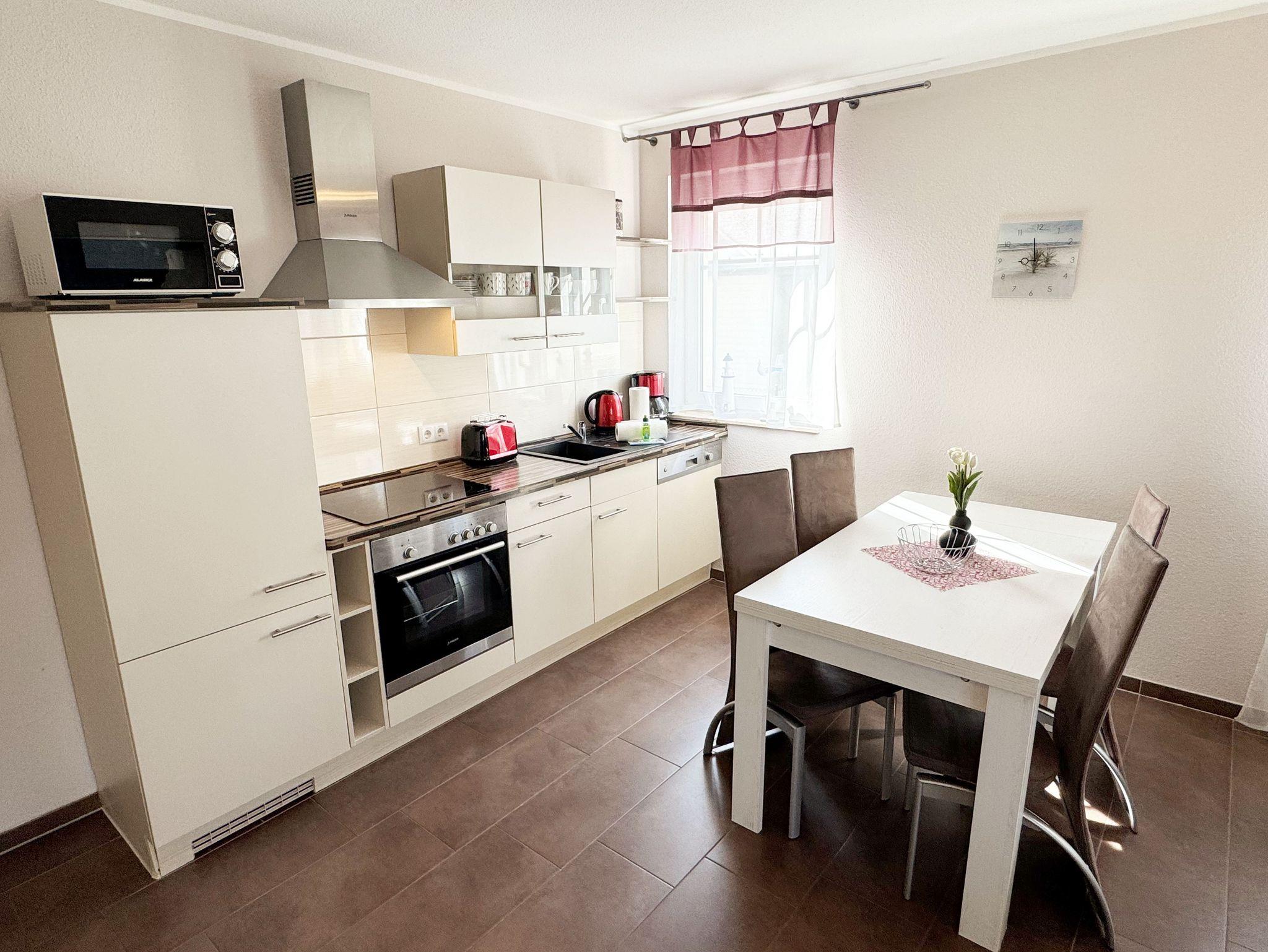 Die Nichtraucherferienwohnung Nr. 03 befindet sich im Erdgeschoss des Hauses und verfügt über eine Wohnfläche von ca. 56 qm. Die Ferienwohnung ist für 2 bis 4 Personen ausgelegt. Der Flur/Eingangsbereich verfügt über eine Garderobe und ist Zugang zu allen Räumlichkeiten. Von hier aus gelangen Sie in den kombinierten Wohn- und Essbereich mit integrierter Küchenzeile. Die komplett ausgestattete Küchenzeile verfügt über ein Cerankochfeld, Backofen, Dunstabzugshaube, Kühlschrank mit Gefrierfach, Spülmaschine, Kaffeemaschine, Mikrowelle, Wasserkocher, Toaster und weitere diverse Küchenutensilien. Der Esstisch mit Bestuhlung ist für 4 Personen geeignet. Vom Wohnbereich aus gelangen Sie durch die Terrassentür auf die bestuhlte Terrasse. Das im Wohnbereich integrierte Schlafsofa verfügt über eine Ausziehfunktion (1,60m x 2,00m) und kann von 2 Personen gut genutzt werden. Ein kleiner Couchtisch, Leselampe, TV-Board mit Flachbild-TV, Receiver, DVD-Player und Ministereoanlage runden den Wohnbereich ab. Auch im Urlaub brauchen Sie auf einen Internetanschluss (WLAN) nicht verzichten. Dieser ist für Sie inklusive. Das im Schlafbereich vorhandene Doppelbett hat eine Maße von 1,80m x 2,00m. Nachttischablagen, einen Schiebeschrank mit großem Spiegel runden den Schlafbereich ab. Das Bad rundet mit einem WC, Waschplatz, Dusche, Fön, Handtuchwärmeheizkörper und Waschmaschine die Wohnung komplett ab. In allen Räumen sorgt eine Fußbodenheizung für angenehme Wärme. Insektenschutzgitter befinden sich im Schlafzimmer sowie im Wohnbereich. Die Wohnungseigene Terrasse verfügt über einen Terrassentisch + 4 Stühlen und ist Richtung Süd/West ausgerichtet. Die Fenster haben Außenjalousien. Ein eigener PKW-Stellplatz (Nr.03) befindet sich auf dem Grundstück, mitgebrachte oder gemietete Fahrräder können im wohnungseigenen Abstellraum (Nr.03) untergestellt werden. Ein gut erzogenes Haustier ist gegen eine Gebühr ein gern gesehener Gast. Die Erstausstattung eines Wäschepaketes (komplette Bettwäsche, 1 Duschhandtuch, 2 kleine Handtücher) können Sie bis 14 Tage vor Anreise gegen einen Aufpreis dazu buchen oder durch eigene ergänzen. Ab 2 gebuchten Paketen erhalten Sie einmalig 1 Geschirrhandtuch und 1 Duschvorleger hinzu.