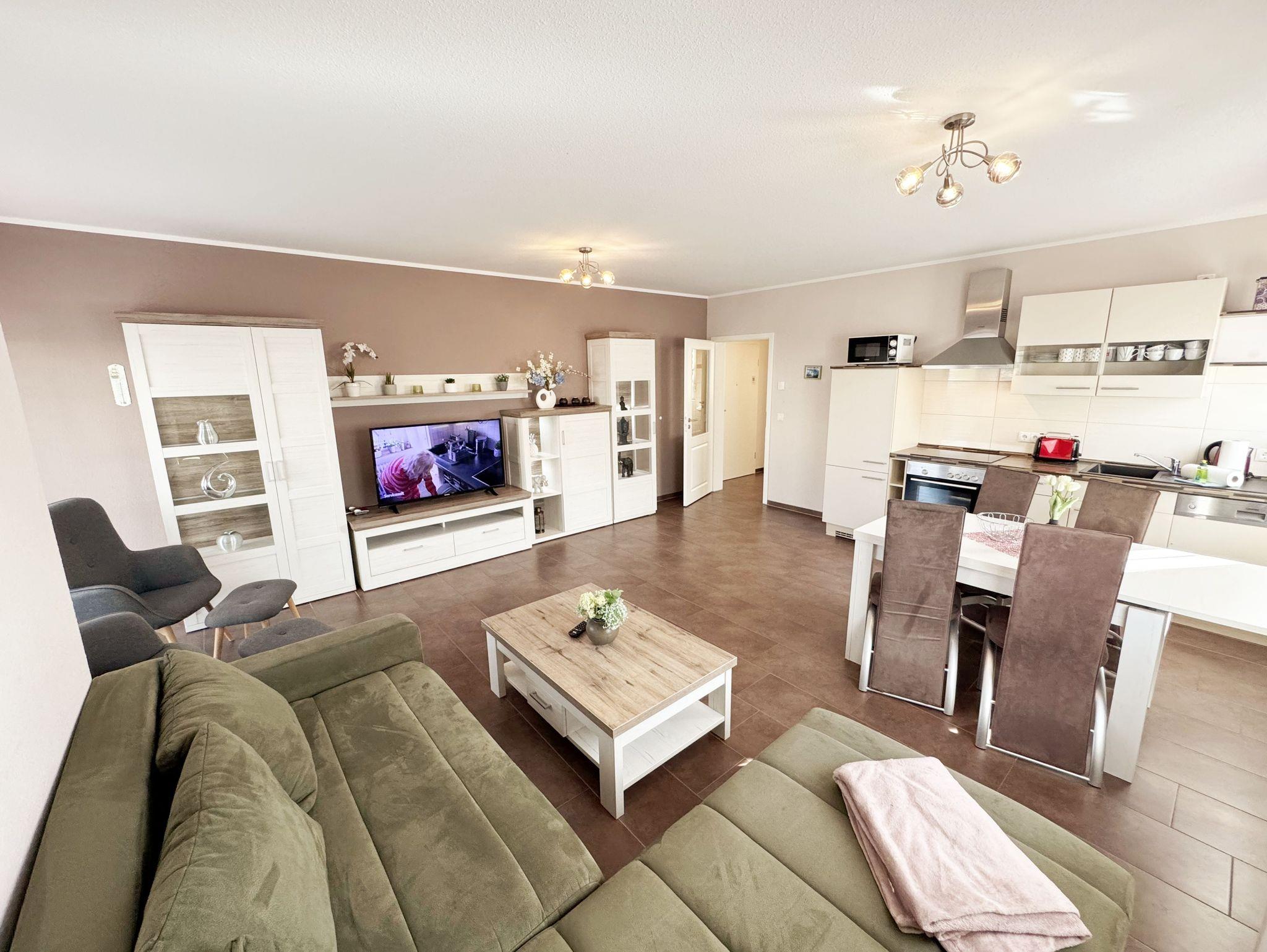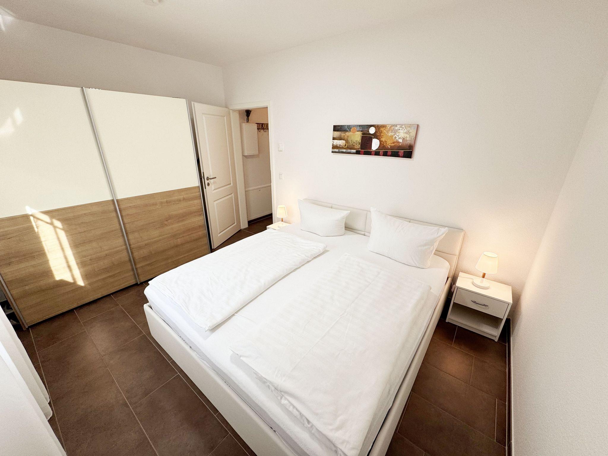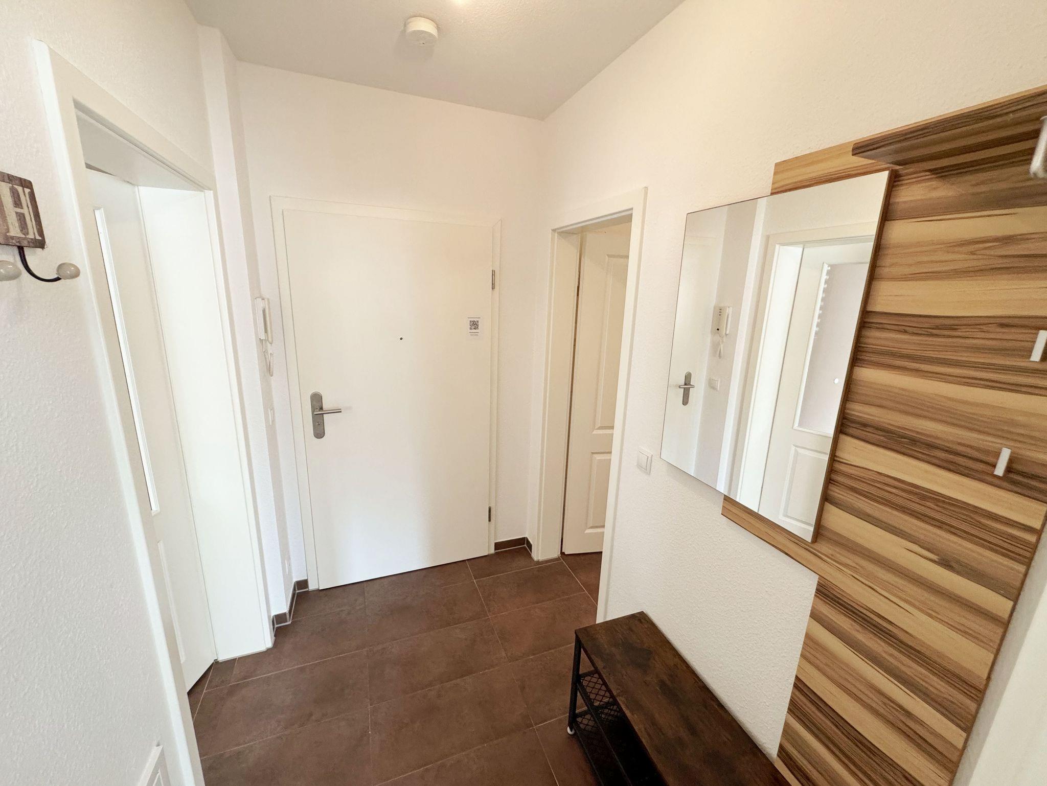 Die Nichtraucherferienwohnung Nr. 03 befindet sich im Erdgeschoss des Hauses und verfügt über eine Wohnfläche von ca. 56 qm. Die Ferienwohnung ist für 2 bis 4 Personen ausgelegt. Der Flur/Eingangsbereich verfügt über eine Garderobe und ist Zugang zu allen Räumlichkeiten. Von hier aus gelangen Sie in den kombinierten Wohn- und Essbereich mit integrierter Küchenzeile. Die komplett ausgestattete Küchenzeile verfügt über ein Cerankochfeld, Backofen, Dunstabzugshaube, Kühlschrank mit Gefrierfach, Spülmaschine, Kaffeemaschine, Mikrowelle, Wasserkocher, Toaster und weitere diverse Küchenutensilien. Der Esstisch mit Bestuhlung ist für 4 Personen geeignet. Vom Wohnbereich aus gelangen Sie durch die Terrassentür auf die bestuhlte Terrasse. Das im Wohnbereich integrierte Schlafsofa verfügt über eine Ausziehfunktion (1,60m x 2,00m) und kann von 2 Personen gut genutzt werden. Ein kleiner Couchtisch, Leselampe, TV-Board mit Flachbild-TV, Receiver, DVD-Player und Ministereoanlage runden den Wohnbereich ab. Auch im Urlaub brauchen Sie auf einen Internetanschluss (WLAN) nicht verzichten. Dieser ist für Sie inklusive. Das im Schlafbereich vorhandene Doppelbett hat eine Maße von 1,80m x 2,00m. Nachttischablagen, einen Schiebeschrank mit großem Spiegel runden den Schlafbereich ab. Das Bad rundet mit einem WC, Waschplatz, Dusche, Fön, Handtuchwärmeheizkörper und Waschmaschine die Wohnung komplett ab. In allen Räumen sorgt eine Fußbodenheizung für angenehme Wärme. Insektenschutzgitter befinden sich im Schlafzimmer sowie im Wohnbereich. Die Wohnungseigene Terrasse verfügt über einen Terrassentisch + 4 Stühlen und ist Richtung Süd/West ausgerichtet. Die Fenster haben Außenjalousien. Ein eigener PKW-Stellplatz (Nr.03) befindet sich auf dem Grundstück, mitgebrachte oder gemietete Fahrräder können im wohnungseigenen Abstellraum (Nr.03) untergestellt werden. Ein gut erzogenes Haustier ist gegen eine Gebühr ein gern gesehener Gast. Die Erstausstattung eines Wäschepaketes (komplette Bettwäsche, 1 Duschhandtuch, 2 kleine Handtücher) können Sie bis 14 Tage vor Anreise gegen einen Aufpreis dazu buchen oder durch eigene ergänzen. Ab 2 gebuchten Paketen erhalten Sie einmalig 1 Geschirrhandtuch und 1 Duschvorleger hinzu.