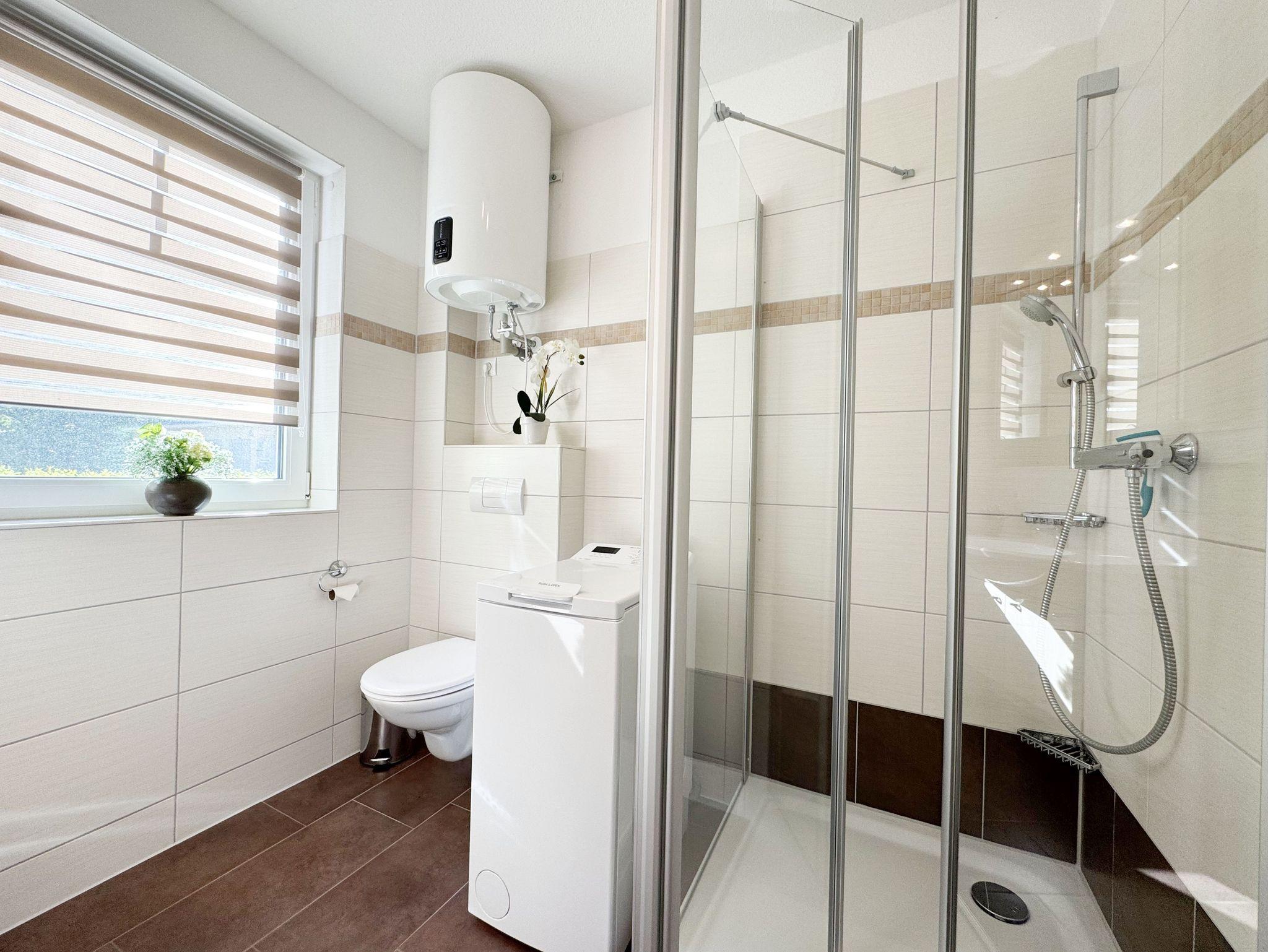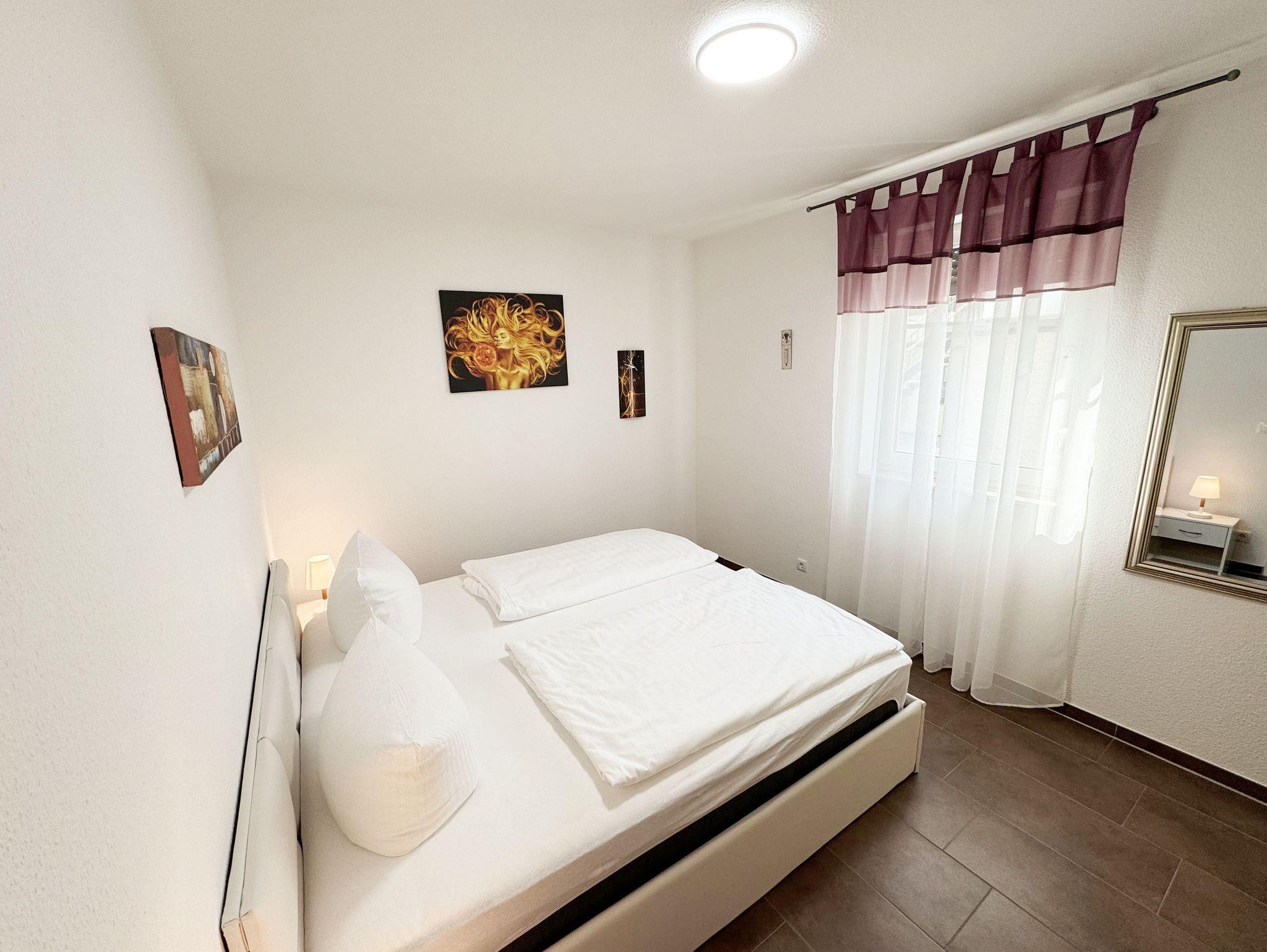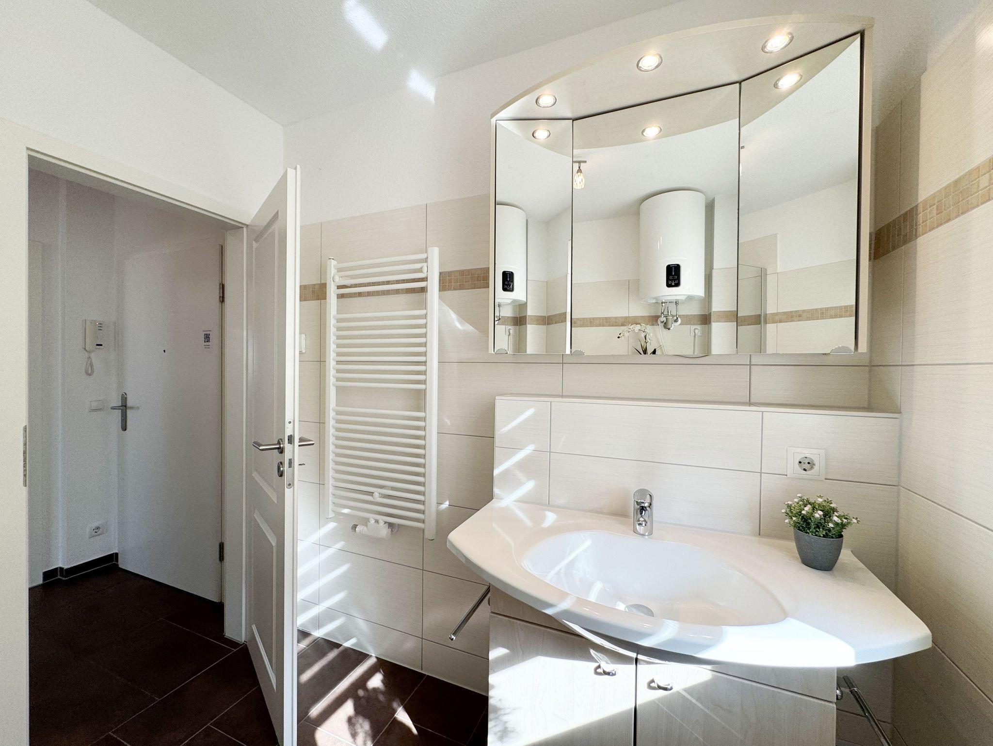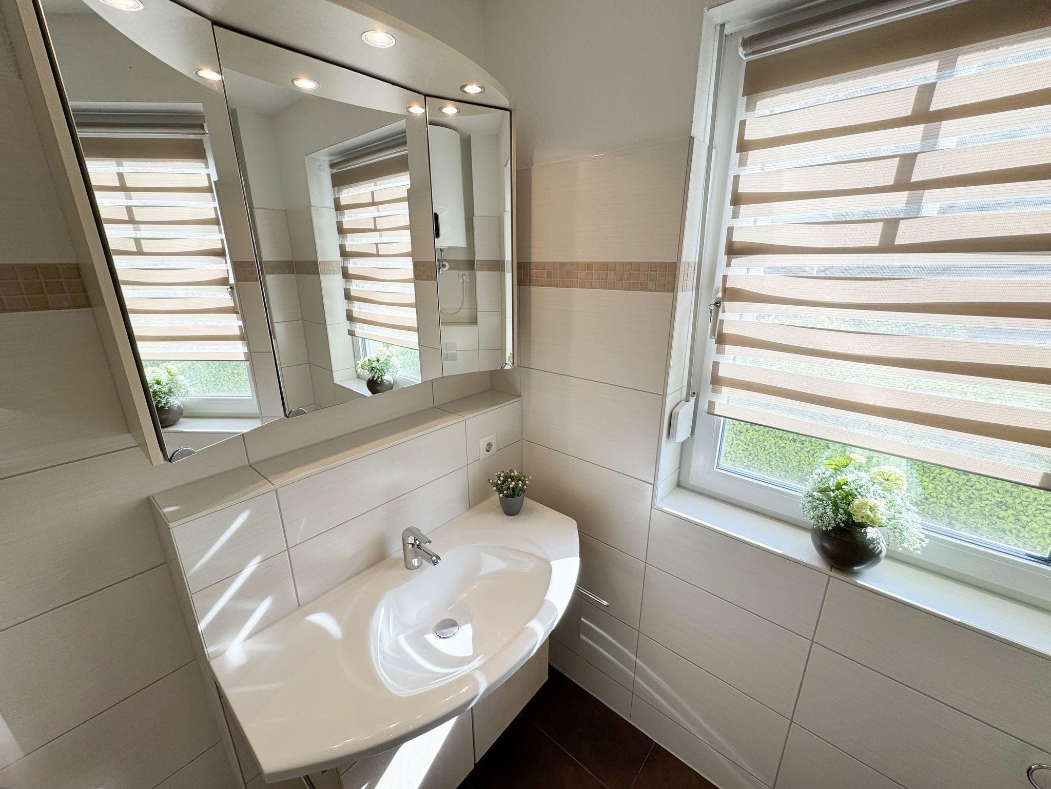 Die Nichtraucherferienwohnung Nr. 03 befindet sich im Erdgeschoss des Hauses und verfügt über eine Wohnfläche von ca. 56 qm. Die Ferienwohnung ist für 2 bis 4 Personen ausgelegt. Der Flur/Eingangsbereich verfügt über eine Garderobe und ist Zugang zu allen Räumlichkeiten. Von hier aus gelangen Sie in den kombinierten Wohn- und Essbereich mit integrierter Küchenzeile. Die komplett ausgestattete Küchenzeile verfügt über ein Cerankochfeld, Backofen, Dunstabzugshaube, Kühlschrank mit Gefrierfach, Spülmaschine, Kaffeemaschine, Mikrowelle, Wasserkocher, Toaster und weitere diverse Küchenutensilien. Der Esstisch mit Bestuhlung ist für 4 Personen geeignet. Vom Wohnbereich aus gelangen Sie durch die Terrassentür auf die bestuhlte Terrasse. Das im Wohnbereich integrierte Schlafsofa verfügt über eine Ausziehfunktion (1,60m x 2,00m) und kann von 2 Personen gut genutzt werden. Ein kleiner Couchtisch, Leselampe, TV-Board mit Flachbild-TV, Receiver, DVD-Player und Ministereoanlage runden den Wohnbereich ab. Auch im Urlaub brauchen Sie auf einen Internetanschluss (WLAN) nicht verzichten. Dieser ist für Sie inklusive. Das im Schlafbereich vorhandene Doppelbett hat eine Maße von 1,80m x 2,00m. Nachttischablagen, einen Schiebeschrank mit großem Spiegel runden den Schlafbereich ab. Das Bad rundet mit einem WC, Waschplatz, Dusche, Fön, Handtuchwärmeheizkörper und Waschmaschine die Wohnung komplett ab. In allen Räumen sorgt eine Fußbodenheizung für angenehme Wärme. Insektenschutzgitter befinden sich im Schlafzimmer sowie im Wohnbereich. Die Wohnungseigene Terrasse verfügt über einen Terrassentisch + 4 Stühlen und ist Richtung Süd/West ausgerichtet. Die Fenster haben Außenjalousien. Ein eigener PKW-Stellplatz (Nr.03) befindet sich auf dem Grundstück, mitgebrachte oder gemietete Fahrräder können im wohnungseigenen Abstellraum (Nr.03) untergestellt werden. Ein gut erzogenes Haustier ist gegen eine Gebühr ein gern gesehener Gast. Die Erstausstattung eines Wäschepaketes (komplette Bettwäsche, 1 Duschhandtuch, 2 kleine Handtücher) können Sie bis 14 Tage vor Anreise gegen einen Aufpreis dazu buchen oder durch eigene ergänzen. Ab 2 gebuchten Paketen erhalten Sie einmalig 1 Geschirrhandtuch und 1 Duschvorleger hinzu.