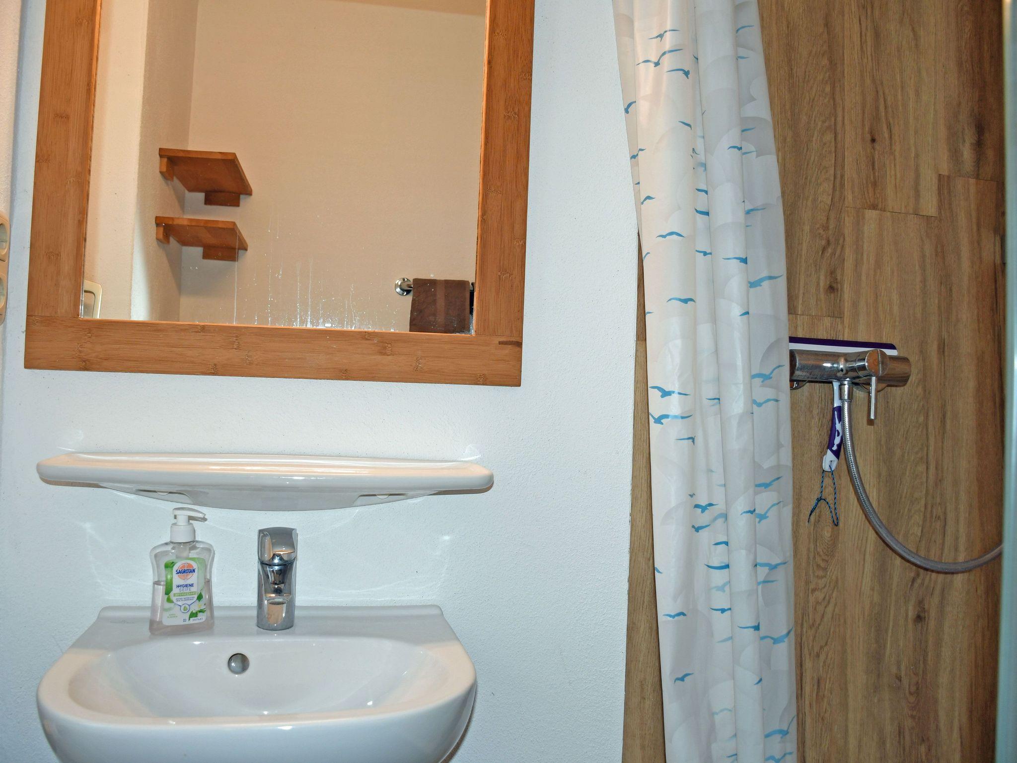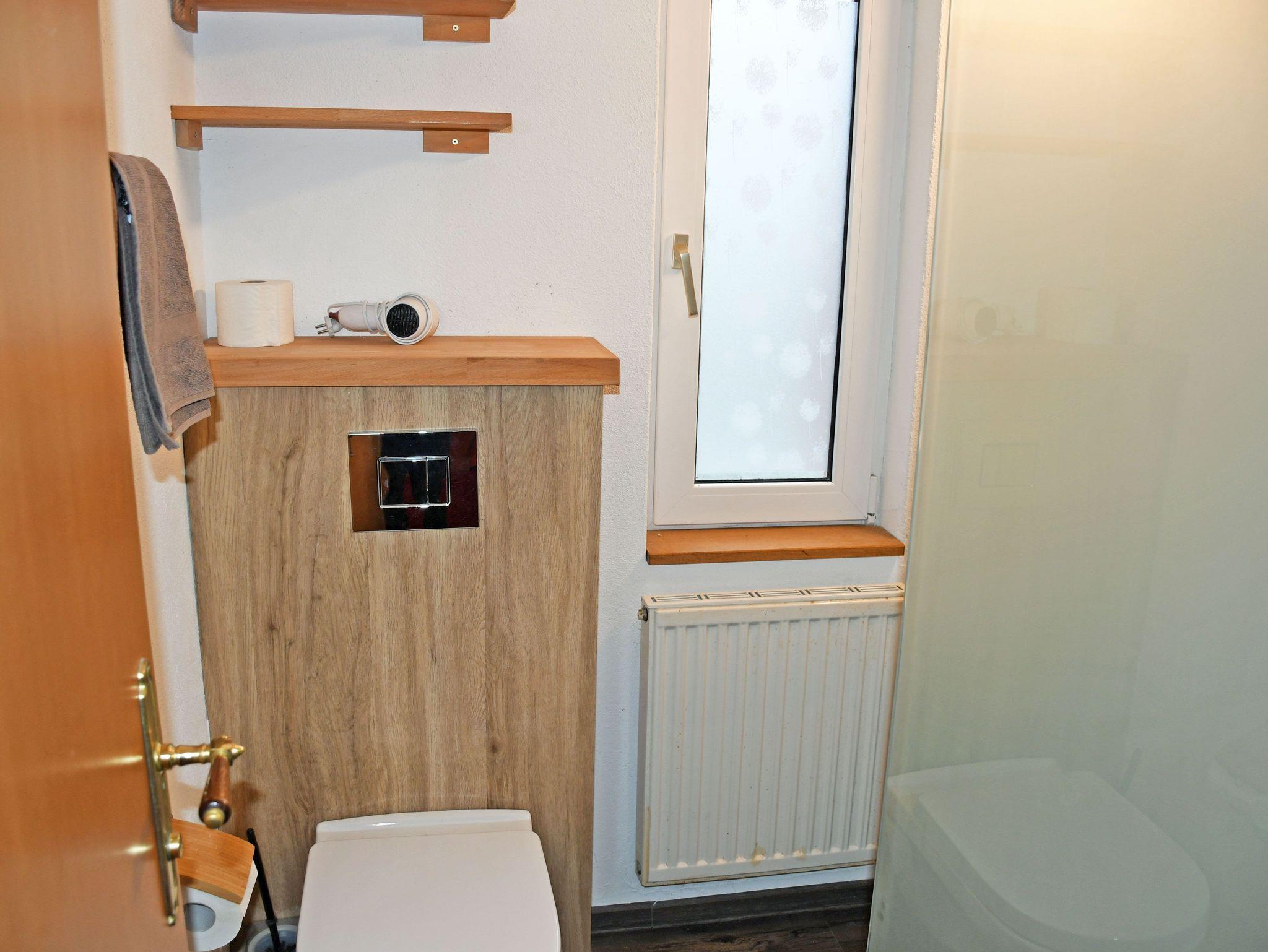 Das Bad ist mit Dusche, WC, Fön und Waschtisch ausgestattet.