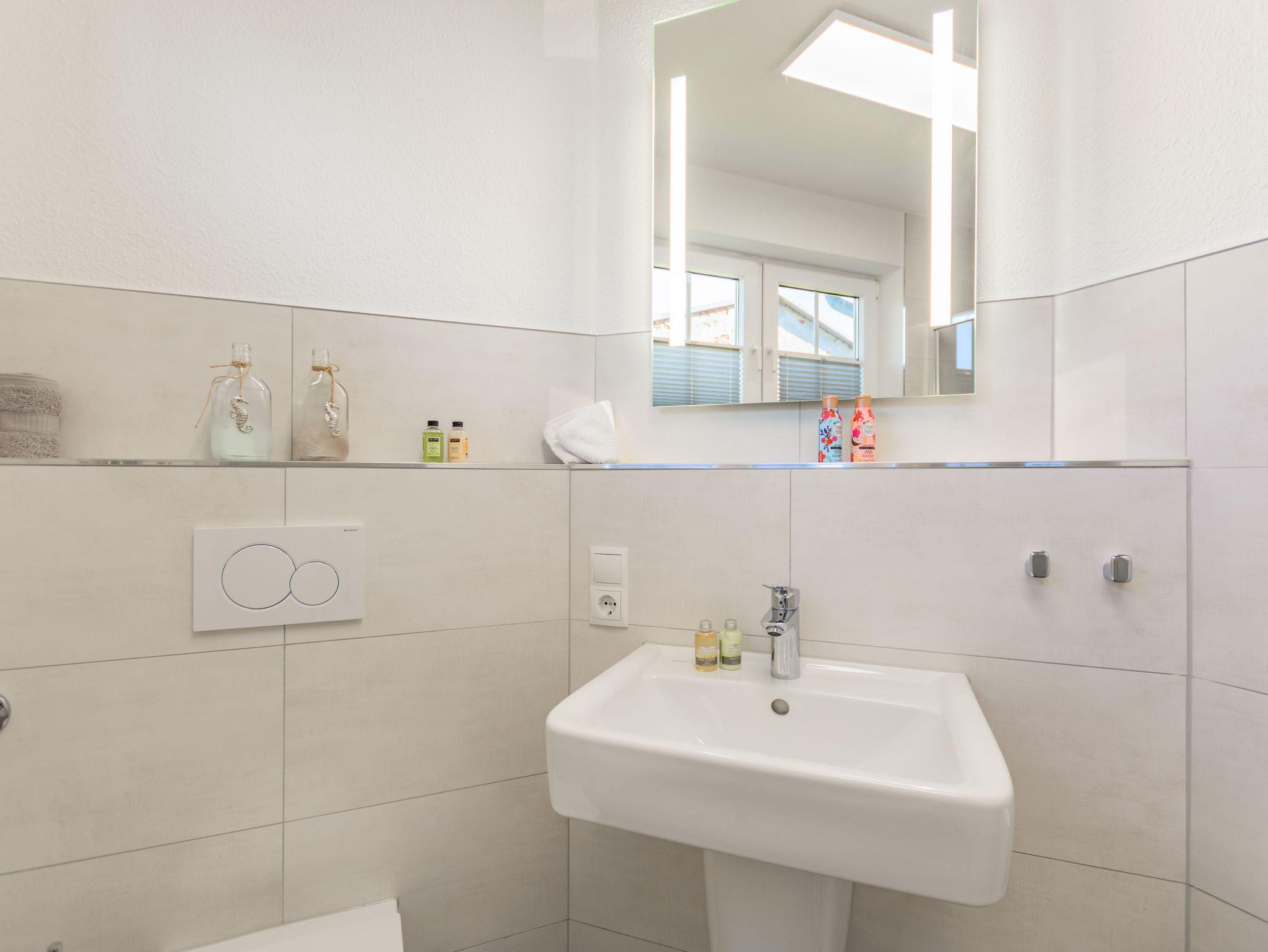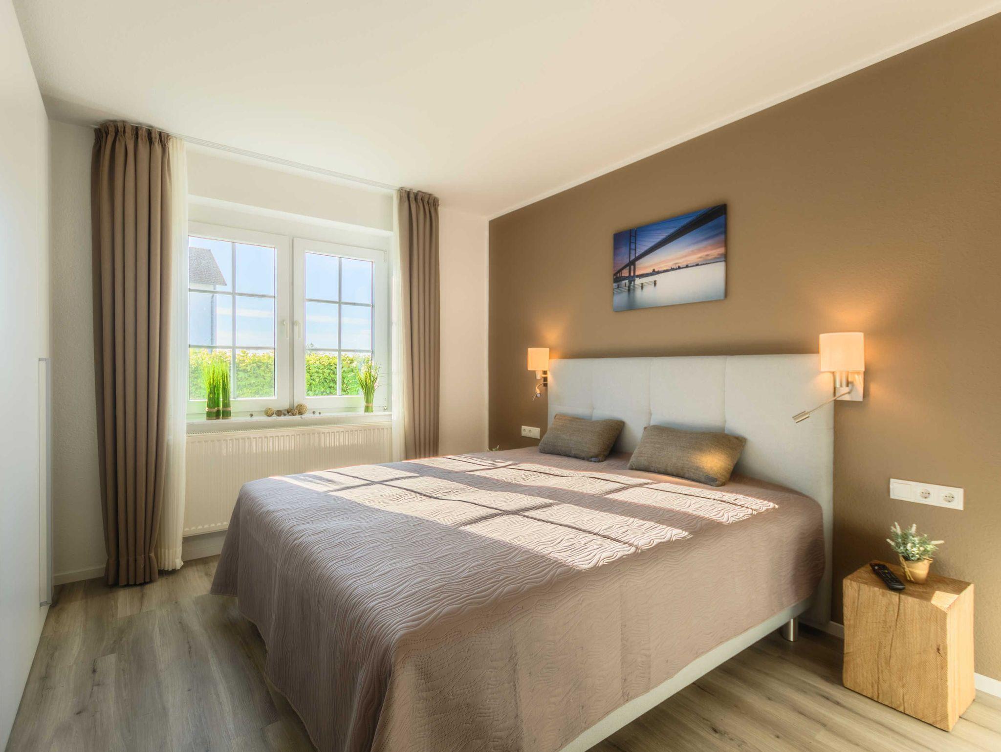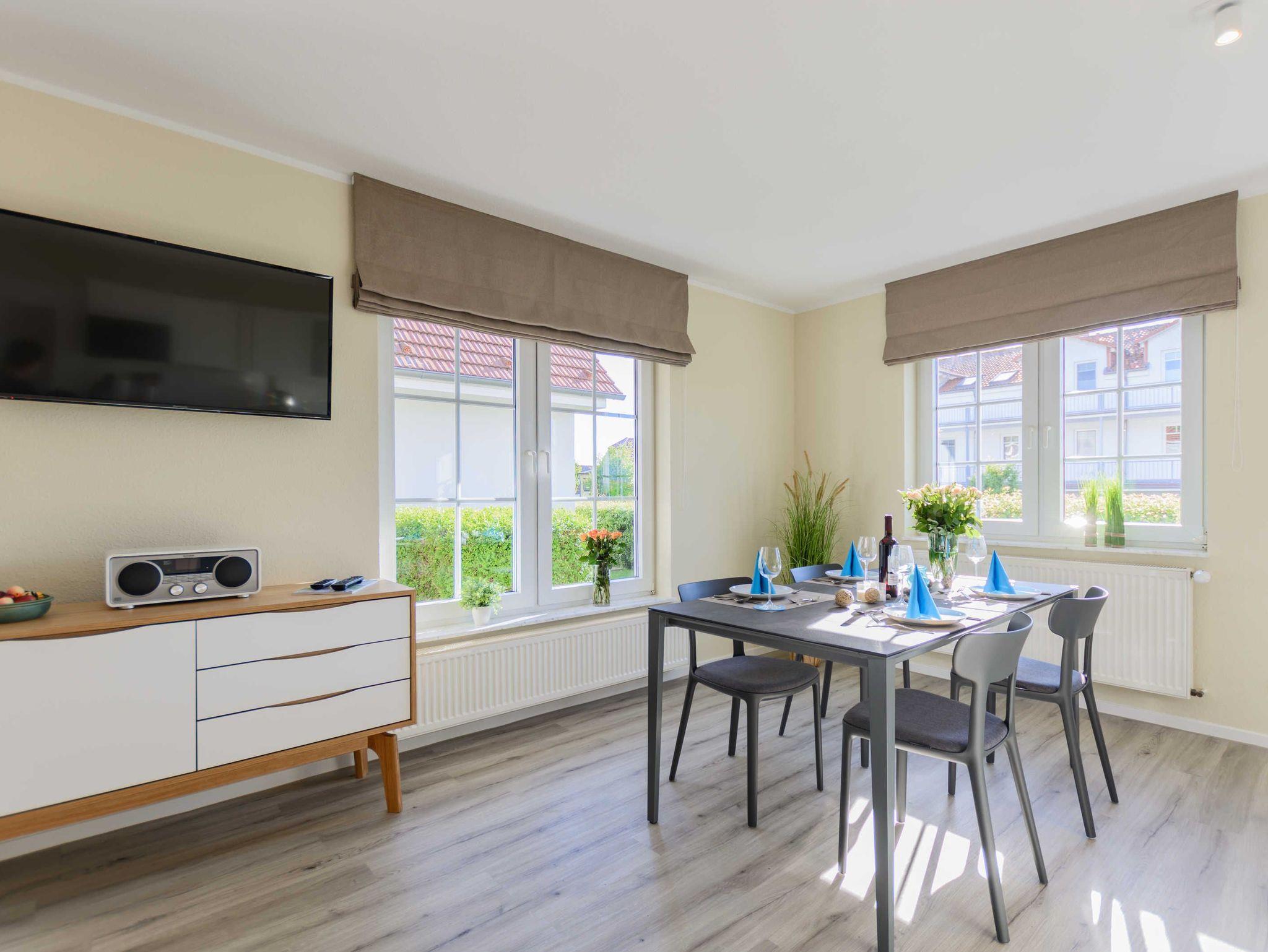 Die Nichtraucherferienwohnung befindet sich im Erdgeschoss und erstreckt sich über ca. 60 qm wo sich max. 4 Erwachsene wohlfühlen können. Der großzügige und helle Wohn- Essbereich ist mit einer modernen Küchenzeile ausgestattet. Mit einem Kühlschrank mit Eisfach, Geschirrspüler, Cerankochfeld, Backofen, Mikrowelle, Wasserkocher, Kaffeemaschine, Toaster, Mixer, Waffeleisen können Sie Ihre gemütlichen Kochabende ganz individuell gestalten. Ein passender Essbereich rundet die Gemütlichkeit ab. Im angrenzenden Wohnbereich trägt eine bequeme Couch (Aufbettungsmöglichkeit für 3./4.Person, 1,50m x 1,95m) mit Couchtisch, ein Lesesessel mit Hocker sowie ein TV-Board zu Ihrer Entspannung bei. Die technische Ausstattung umfasst einen Smart-TV, ein DAB-Bluetooth-Radio sowie einen WLAN-Anschluss. Vom Wohnbereich gelangen Sie auf Ihre bestuhlte Terrasse (Süd) mit Sonnenschirm, von wo Sie aus Ihren Tag entspannt bei einem Glas Wein ausklingen lassen können. Hell und freundlich eingerichtet erwartet Sie ein gemütliches Schlafzimmer, mit einem komfortablen Boxspring-Bett (1,80m x 2,00m) mit 5 Zonen Tonnen-Taschenfederkern-Matratzen, Nachttischablagen, einen großzügigen Kleiderschrank sowie ein Smart-TV. Der Schlafbereich verfügt zudem über Vorhänge, die nahezu lichtundurchlässig sind und einen guten Sicht- und Sonnenschutz bieten. Für einen angenehmen Schlaf sorgen zusätzlich Insektenschutzgitter im Wohn- & Schlafbereich. Das Tageslicht-Badezimmer ist mit einer ebenerdigen Dusche, einem WC, einem Fön sowie einem Waschtisch ausgestattet. In der Wohnung finden Sie zusätzlich ein Staubsauger, ein Besen mit Kehrset, ein Wäscheständer sowie ein Wäschekorb. Im Nachbarhaus C können Sie eine Waschmaschine sowie einen Trockner gegen Gebühr nutzen. Hier stehen auch ein Bügelbrett und ein Bügeleisen zur Verfügung. Haustiere sind nicht erlaubt. Das Grillen auf dem ausgewiesenen Gemeinschaftsplatz lädt zu gemütlichen Abenden ein. Zur Entspannung lädt eine münzbetriebene Sauna mit kleinem Ruheraum im Untergeschoss von Haus B ein. Ihre Fahrräder können Sie begrenzt im Gemeinschaftskeller oder auf dem Grundstück abstellen. Ein PKW-Stellplatz steht Ihnen inklusive zur Verfügung. Die Erstausstattung eines Wäschepaketes (komplette Bettwäsche, 1 Duschhandtuch, 2 kleine Handtücher) können Sie bis 14 Tage vor Anreise gegen einen Aufpreis dazu buchen oder durch eigene ergänzen. Ab 2 gebuchten Paketen erhalten Sie einmalig 1 Geschirrhandtuch und 1 Duschvorleger hinzu.