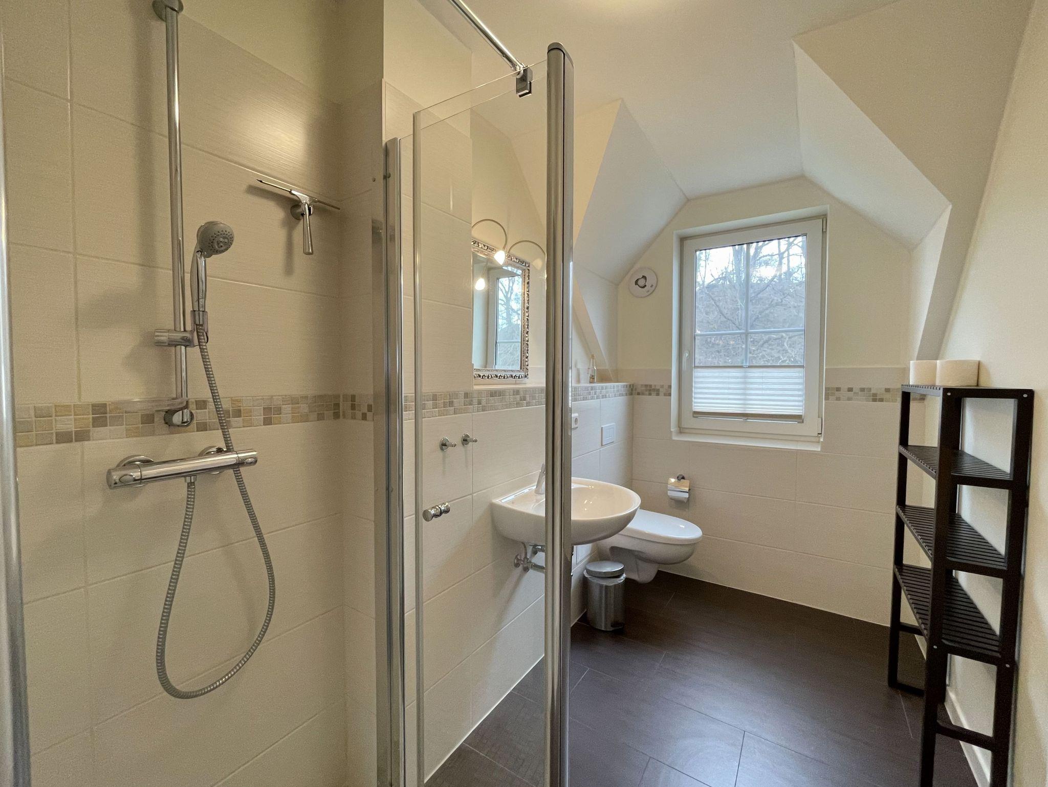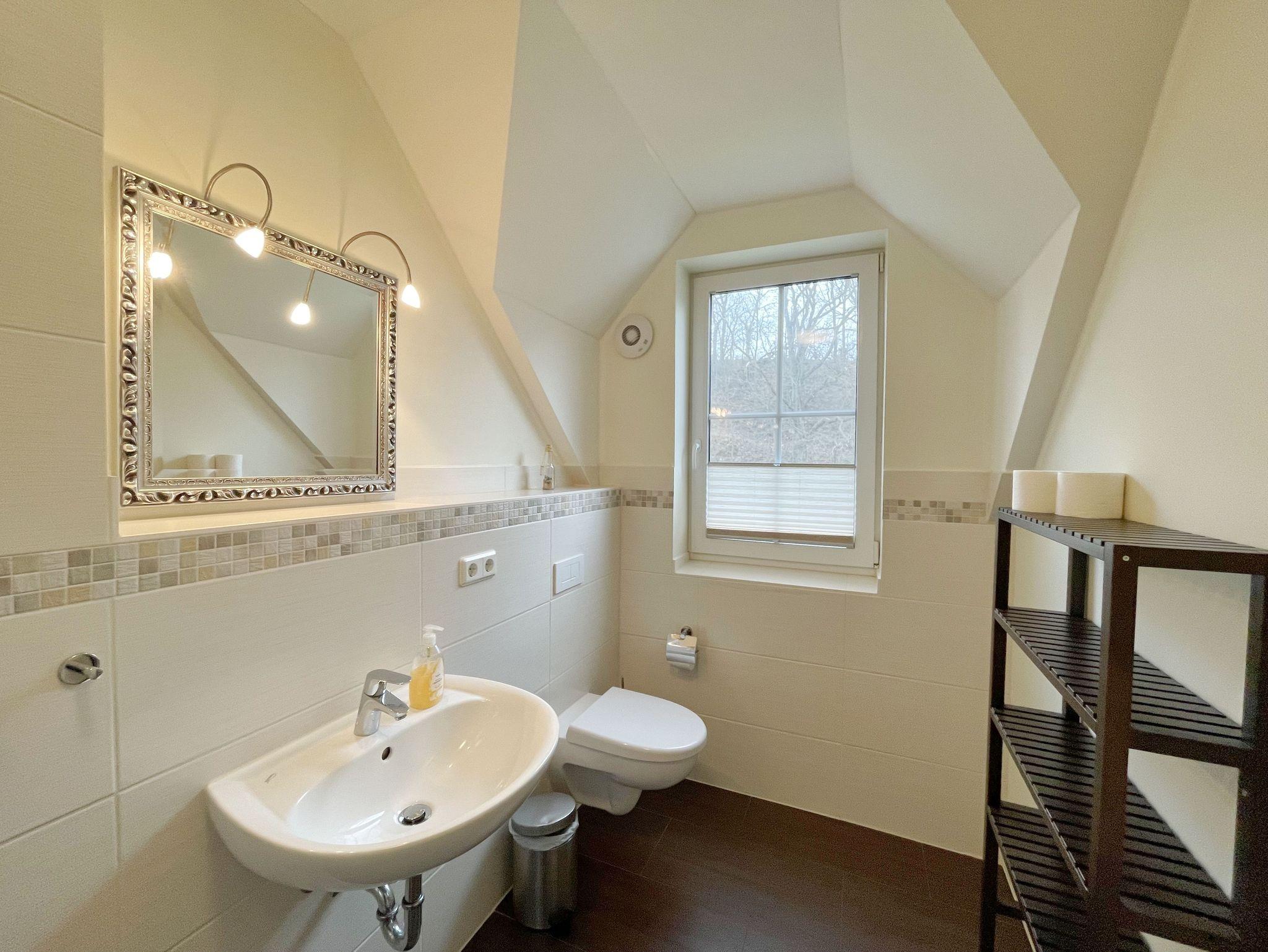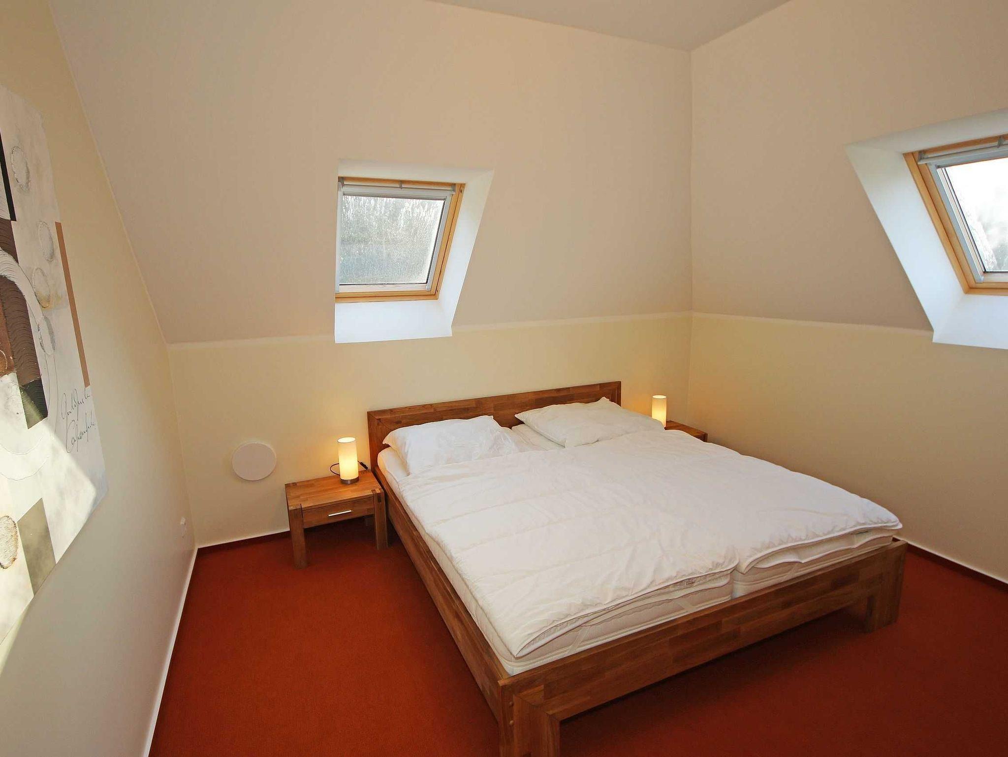 Die 64 qm große Nichtraucherferienwohnung ist für 2 bis 5 Erwachsene und 1 Kleinkind bis 3 Jahre im Kinderreisebett ausgelegt. Durch die Dachschrägen erhält die Ferienwohnung eine individuelle Note mit besonderer, wohnlicher Behaglichkeit. Für den unbeschwerten Aufenthalt steht Ihnen ein großzügiger Wohnbereich zur Verfügung, in dem eine komplett ausgestattete Küchenzeile mit Geschirrspüler, Ceran-Kochfeld, Dunstabzugshaube, Kühlschrank mit Eisfach, Spüle, Mikrowelle, Toaster, Wasserkocher, Kaffeemaschine sowie diverse Küchenutensilien und ein komfortabler Esstisch mit 6 Stühlen integriert ist. Vom Wohnbereich erreichen Sie beide Schlafzimmer. Im ersten Schlafzimmer befinden sich ein Doppelbett (2 x 0,90 m x 2,00 m), Nachttischablagen sowie ein Kleiderschrank. Das zweite Schlafzimmer verfügt ebenfalls über ein Doppelbett (2 x 0,90 m x 2,00 m), Nachttischablagen, einen Kleiderschrank sowie ein zusätzliches Einzelbett (0,90 m x 2,00 m) sowie Insektenschutzgitter. Beide Schlafzimmer sind mit Teppichboden versehen. Das Kinderreisebett kann in beiden Schlafzimmern aufgestellt werden. Der Wohnraum verfügt über eine gemütliche Couchecke mit Couchtisch, dimmbare Beleuchtung, Leselampe, großen Flachbild-TV mit TV Fire Stick, Blu-Ray-Player, Sideboard mit Gesellschaftsspielen und Radio. Auch auf einen Internetanschluss (WLAN) müssen Sie im Urlaub nicht verzichten. Dieser ist inklusive für Sie. Besonderheiten der Ferienwohnung sind die Fußbodenheizung in allen Räumen, eine kontrollierte und dezentrale Lüftungsanlage sowie Verdunklungsmöglichkeiten in den Schlafzimmern. Im Tageslichtbad profitieren Sie nicht nur von der Fußbodenheizung, sondern auch zusätzlich vom beheizbaren Handtuchtrockner und zuschaltbarer Ventilator-Lüftungseinrichtung. Eine ebenerdige Dusche, WC, Fön, Kosmetikspiegel, Insektenschutzgitter und Waschplatz runden den Sanitärbereich ab. Den bestuhlten Balkon (Süd/West-Ausrichtung) mit Sonnenschirm erreichen Sie vom Wohnbereich. Für unsere kleinen Gäste sind 1x Kinderhochstuhl und 1x Kinderreisebett (ohne Matratze und Bett Inlett) inklusive. Im kleinen Abstellraum befinden sich eine Waschmaschine, ein Staubsauger, Reinigungsutensilien sowie ein Wäscheständer. Der PKW-Stellplatz Nr. 08 befindet sich direkt am Haus. Zur Wohnung gehört auch ein abschließbarer Schuppen, wo Sie Ihre geliehenen oder mitgebrachten Fahrräder einschließen können. Haustiere sind nicht erlaubt. Die Erstausstattung eines Wäschepaketes (komplette Bettwäsche, 1 Duschhandtuch, 2 kleine Handtücher) können Sie bis 14 Tage vor Anreise gegen einen Aufpreis dazu buchen oder durch eigene ergänzen. Ab 2 gebuchten Paketen erhalten Sie einmalig 1 Geschirrhandtuch und 1 Duschvorleger dazu.