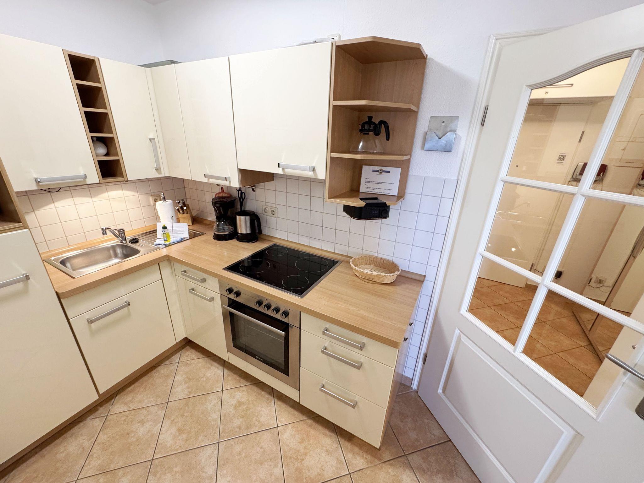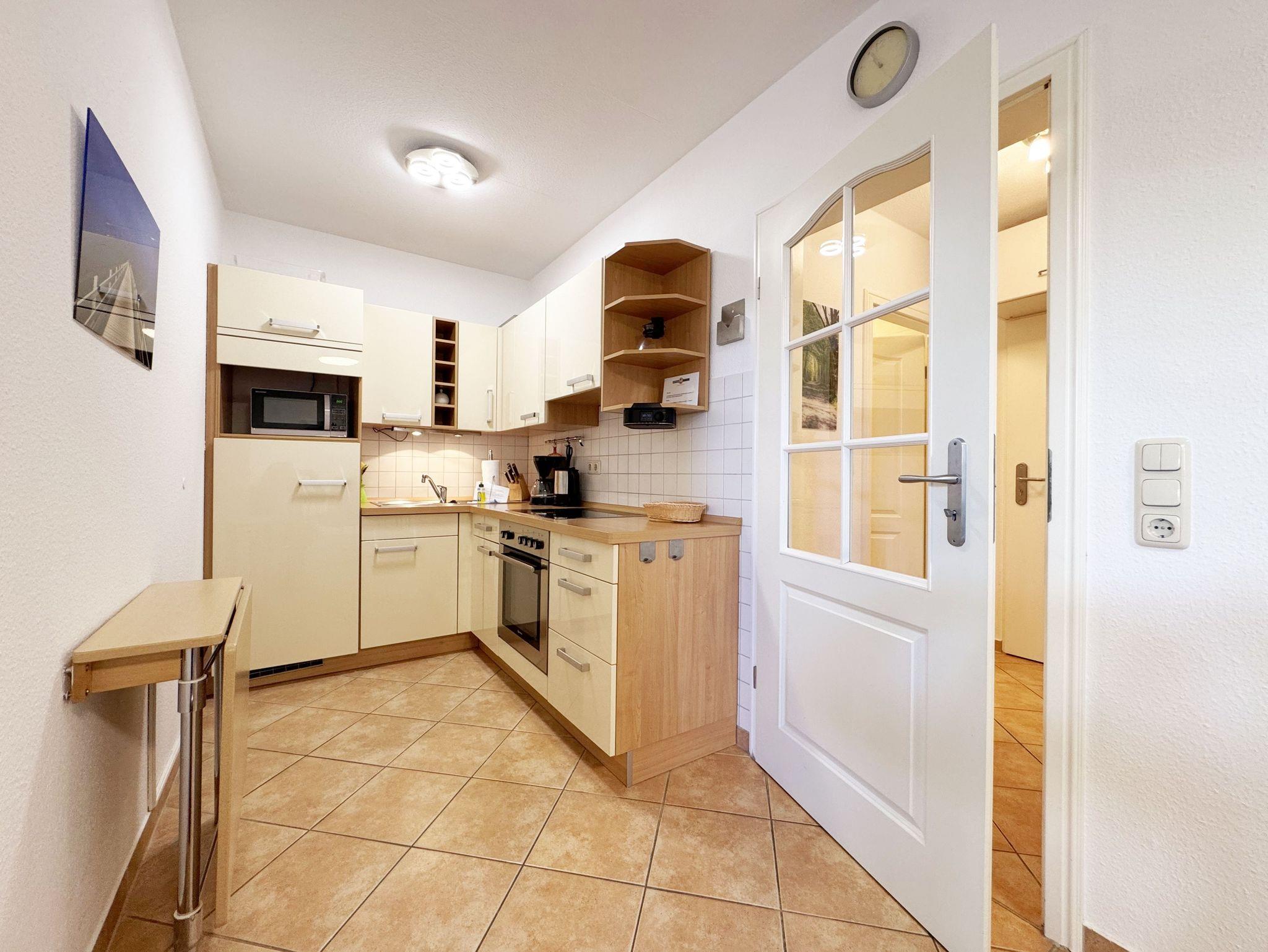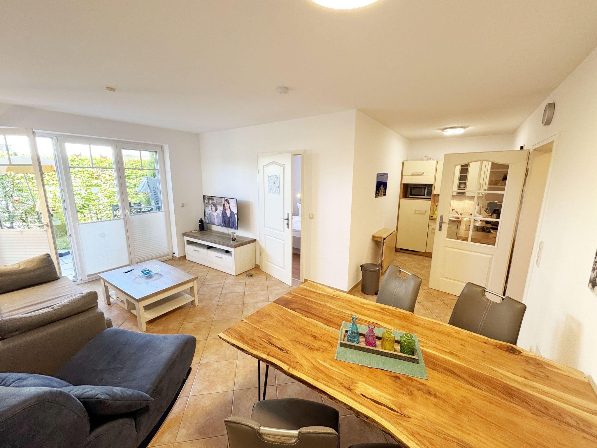 Ihr Urlaub hat begonnen! Nur ein kleines Kiefernwäldchen und wenige Schritte trennen Ihr komfortabel eingerichtetes Appartement vom weißen Sonnenstrand. Das ca. 50 m² Nichtraucher-Appartement im Erdgeschoß ist für 3 Erwachsene + 1 Kind bis 12 Jahre ausgestattet. Die komplett ausgestattete Küchenzeile verfügt über einen Kühlschrank mit Gefrierfach, Ceranfeld, Backofen, Mikrowelle, Kaffeemaschine, Toaster, Wasserkocher und viele kleine Küchenhelfern lässt keine Wünsche offen. Ein großer Esszimmertisch mit bequemen Stühlen bietet Ihnen viel Platz. Moderne Leuchten tauchen den gemütlichen Wohnbereich in ein stimmungsvolles Licht. Die bequeme Schlafcouch mit Ausziehfunktion (Aufbettung für 2 Personen, 1,60m x 2,00m), der Couchtisch und auch der stilvolle Schwingsessel lassen Sie abschalten. Für eine Auszeit sorgt der LED-TV, der mittels Wandhalterung in jede gewünschte Richtung verstellbar ist. Auf dem Low Board stehen ein Blu-Ray-Player, ein DAB-Radio, einige Spiele und eine Büchersammlung für die ruhigen Minuten zur Verfügung. Ebenso wie schnelles WLAN (50MB/s) und ein modernes Internet-Radio. Vom Wohnbereich gelangen Sie auf die möblierte Sonnen-Terrasse (Westen) im eingezäunten, fast uneinsehbaren Garten. Hier können Sie auch ungestört die Zeit im schönen Strandkorb aus edlem, lackiertem Mahagoni-Holz verbringen. Das geräumige Schlafzimmer mit Doppelbett (1,60m x 2,00m) verfügt über einen großzügigen Schwebetürenschrank, verstellbare Lattenroste, Nachttischablagen mit Leseleuchten und einen Herrendiener. Ihr erholsame Schlaf wird durch Insektenschutz und Verdunklungs-Plissees im gesamten Appartement unterstützt. Vom hellen Flur mit Garderobe gelangen Sie in das hochwertige Badezimmer mit einer ebenerdigen Echtglas-Dusche, Wandtiefspül-WC, Waschtisch, Haartrockner und beheiztem Handtuchtrockner. Im gesamten Wohnbereich sorgt eine Fußbodenheizung das ganze Jahr über für eine angenehme, leicht zu regulierende Wärme. Für unsere kleinen Gäste stehen ein Kinderreisebett und ein Hochstuhl bereit. Maximal sind 2 Haustiere gegen eine Gebühr gern gesehene Gäste. Ein Wäscheständer sowie diverse Reinigungsutensilien sind vorhanden. Im wohnungseigenen Abstellraum finden sich zwei Fahrräder zu Ihrer Nutzung (nicht Bestandteil des Vertrages). Ihr PKW-Stellplatz (Nr.03) befindet sich direkt am Objekt. Die Erstausstattung eines Wäschepaketes (komplette Bettwäsche, 1 Duschhandtuch, 2 kleine Handtücher) können Sie bis 14 Tage vor Anreise gegen einen Aufpreis dazu buchen oder durch eigene ergänzen. Ab 2 gebuchten Paketen erhalten Sie einmalig 1 Geschirrhandtuch und 1 Duschvorleger hinzu.