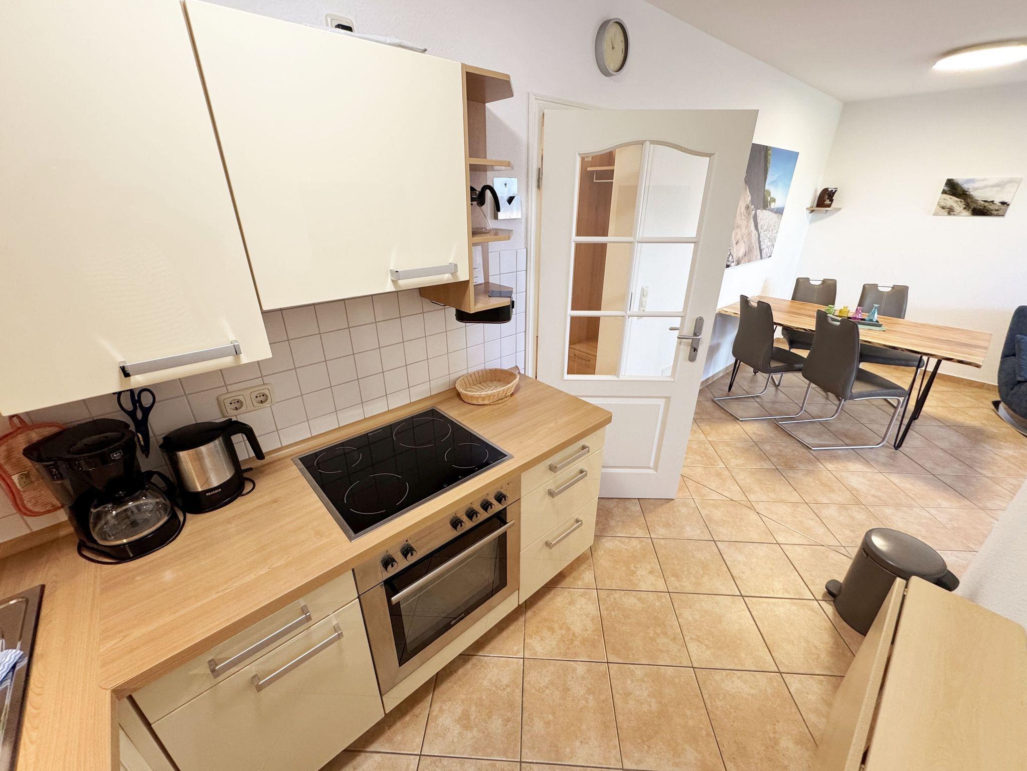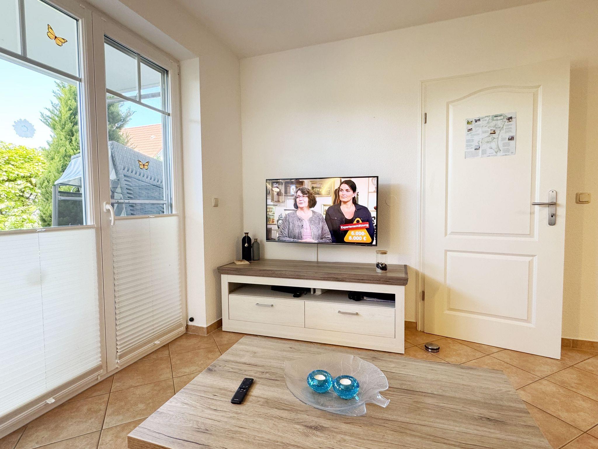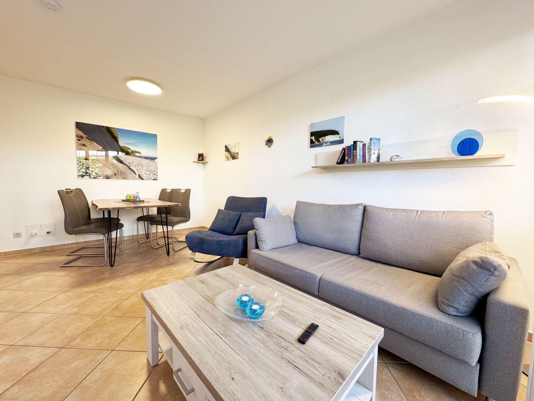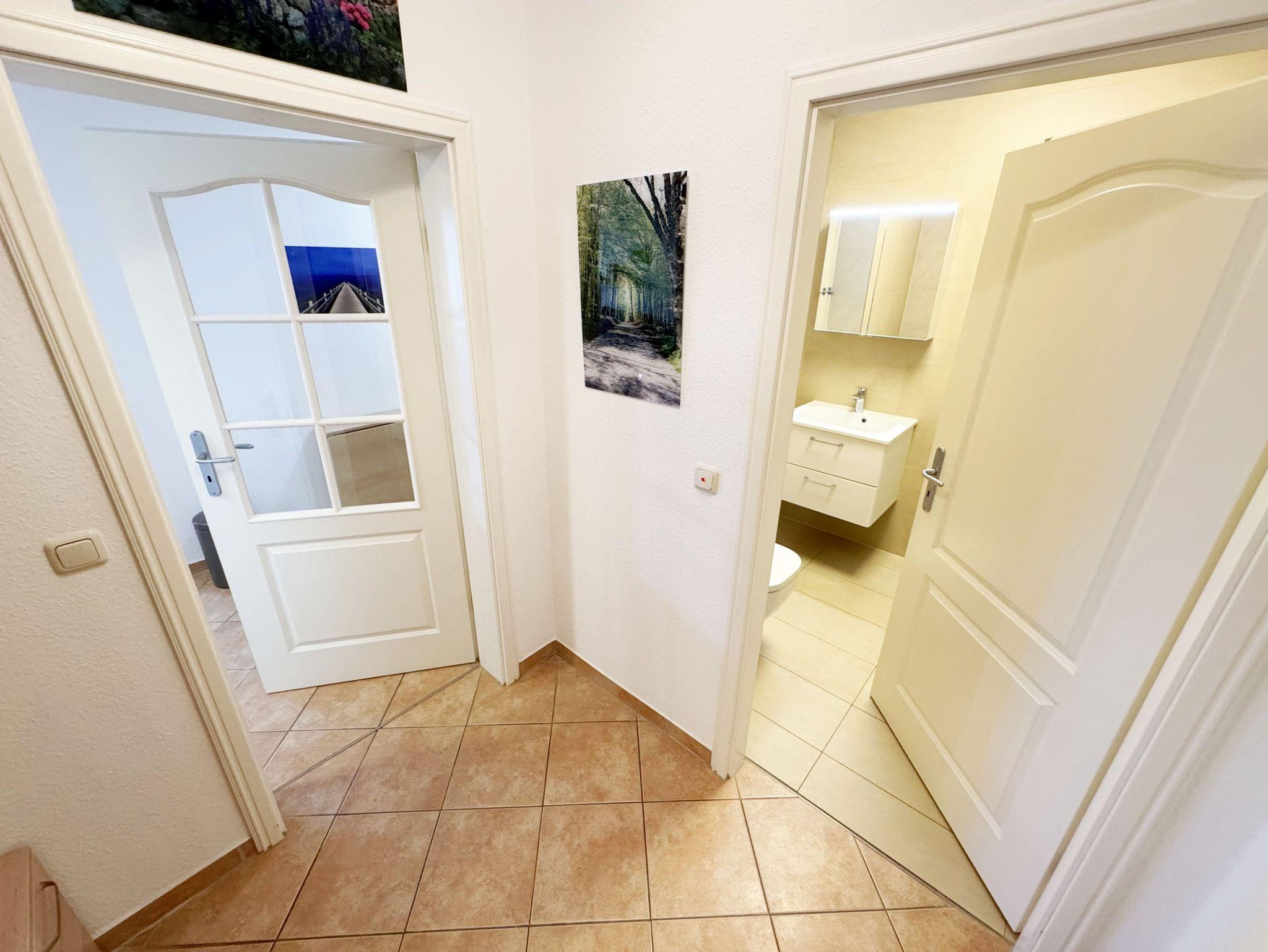 Ihr Urlaub hat begonnen! Nur ein kleines Kiefernwäldchen und wenige Schritte trennen Ihr komfortabel eingerichtetes Appartement vom weißen Sonnenstrand. Das ca. 50 m² Nichtraucher-Appartement im Erdgeschoß ist für 3 Erwachsene + 1 Kind bis 12 Jahre ausgestattet. Die komplett ausgestattete Küchenzeile verfügt über einen Kühlschrank mit Gefrierfach, Ceranfeld, Backofen, Mikrowelle, Kaffeemaschine, Toaster, Wasserkocher und viele kleine Küchenhelfern lässt keine Wünsche offen. Ein großer Esszimmertisch mit bequemen Stühlen bietet Ihnen viel Platz. Moderne Leuchten tauchen den gemütlichen Wohnbereich in ein stimmungsvolles Licht. Die bequeme Schlafcouch mit Ausziehfunktion (Aufbettung für 2 Personen, 1,60m x 2,00m), der Couchtisch und auch der stilvolle Schwingsessel lassen Sie abschalten. Für eine Auszeit sorgt der LED-TV, der mittels Wandhalterung in jede gewünschte Richtung verstellbar ist. Auf dem Low Board stehen ein Blu-Ray-Player, ein DAB-Radio, einige Spiele und eine Büchersammlung für die ruhigen Minuten zur Verfügung. Ebenso wie schnelles WLAN (50MB/s) und ein modernes Internet-Radio. Vom Wohnbereich gelangen Sie auf die möblierte Sonnen-Terrasse (Westen) im eingezäunten, fast uneinsehbaren Garten. Hier können Sie auch ungestört die Zeit im schönen Strandkorb aus edlem, lackiertem Mahagoni-Holz verbringen. Das geräumige Schlafzimmer mit Doppelbett (1,60m x 2,00m) verfügt über einen großzügigen Schwebetürenschrank, verstellbare Lattenroste, Nachttischablagen mit Leseleuchten und einen Herrendiener. Ihr erholsame Schlaf wird durch Insektenschutz und Verdunklungs-Plissees im gesamten Appartement unterstützt. Vom hellen Flur mit Garderobe gelangen Sie in das hochwertige Badezimmer mit einer ebenerdigen Echtglas-Dusche, Wandtiefspül-WC, Waschtisch, Haartrockner und beheiztem Handtuchtrockner. Im gesamten Wohnbereich sorgt eine Fußbodenheizung das ganze Jahr über für eine angenehme, leicht zu regulierende Wärme. Für unsere kleinen Gäste stehen ein Kinderreisebett und ein Hochstuhl bereit. Maximal sind 2 Haustiere gegen eine Gebühr gern gesehene Gäste. Ein Wäscheständer sowie diverse Reinigungsutensilien sind vorhanden. Im wohnungseigenen Abstellraum finden sich zwei Fahrräder zu Ihrer Nutzung (nicht Bestandteil des Vertrages). Ihr PKW-Stellplatz (Nr.03) befindet sich direkt am Objekt. Die Erstausstattung eines Wäschepaketes (komplette Bettwäsche, 1 Duschhandtuch, 2 kleine Handtücher) können Sie bis 14 Tage vor Anreise gegen einen Aufpreis dazu buchen oder durch eigene ergänzen. Ab 2 gebuchten Paketen erhalten Sie einmalig 1 Geschirrhandtuch und 1 Duschvorleger hinzu.